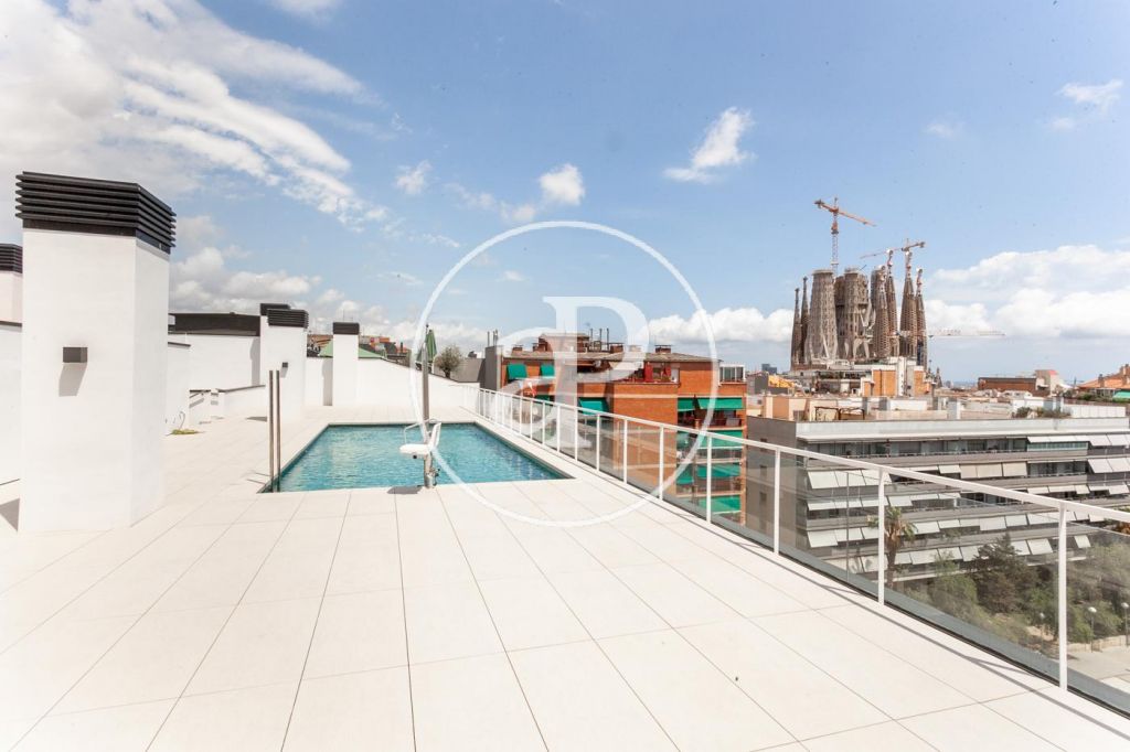 La finca dispone de ascensor y una increible piscina, en la azotea del edificio, con vistas a La Sagrada Familia.