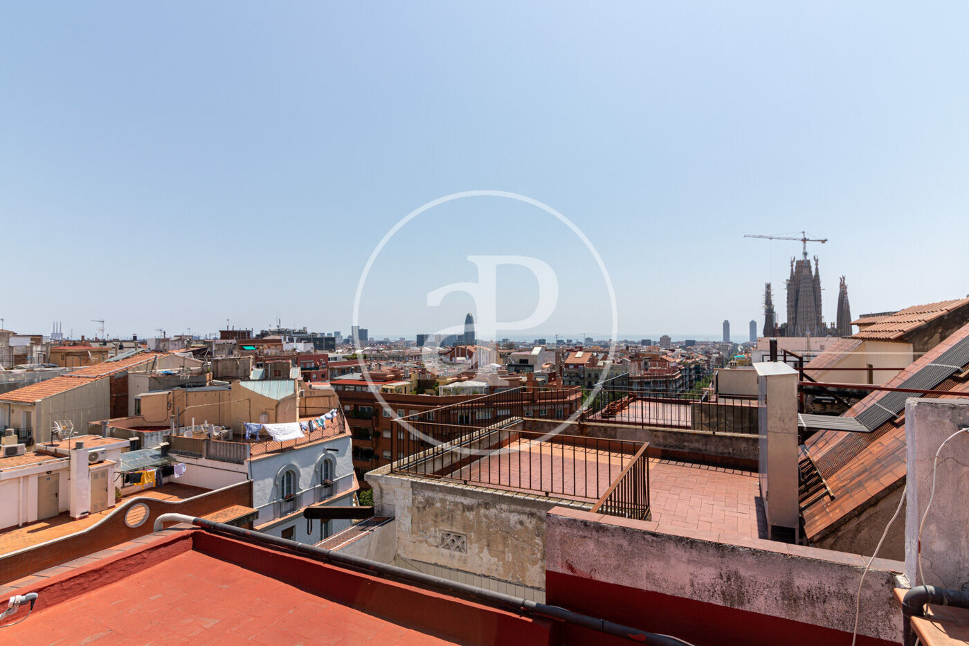 Magnífico ático con terraza soleada y vistas a la Sagrada Familia y al mar, que cuenta con 70 m2 construidos en el interior y una maravillosa terraza de 40 m2.