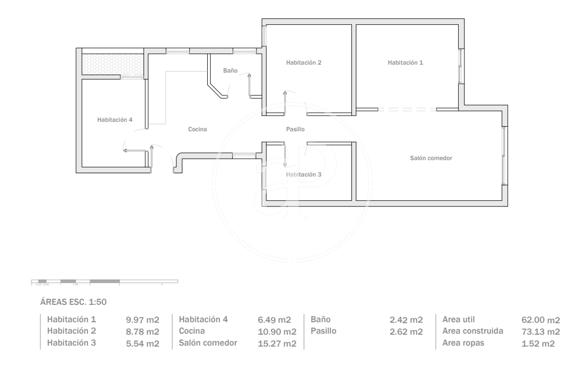 La vivienda cuenta con 70 m² construidos, distribuidos en 3 habitaciones (2 de ellas dobles), un baño completo de diseño elegante y práctico, y una cocina moderna con abundante espacio de almacenaje. Además, dispone de una zona de aguas independiente que aporta un extra de funcionalidad. El salón-comedor, orientado al tranquilo patio de manzana, recibe una excelente luz natural que lo convierte en un espacio cálido y acogedor durante todo el día. La climatización por splits frío/calor garantiza confort en cualquier época del año.