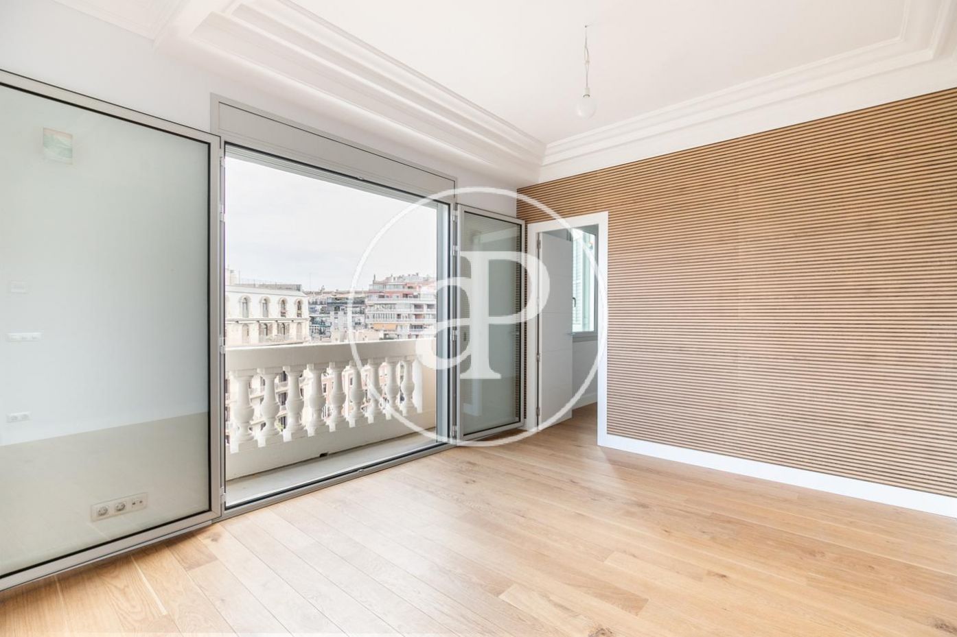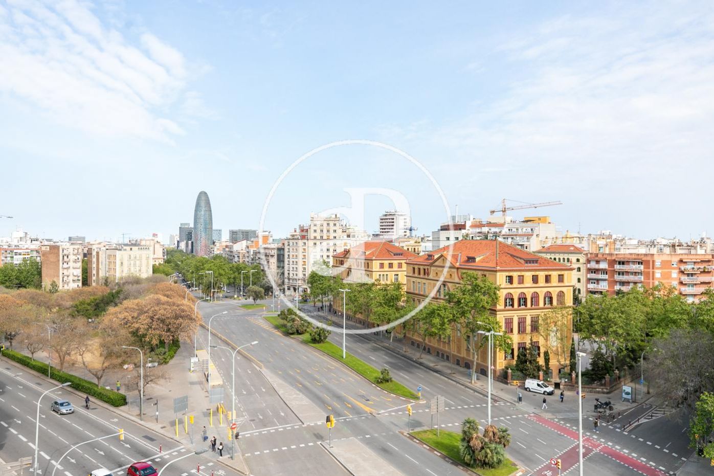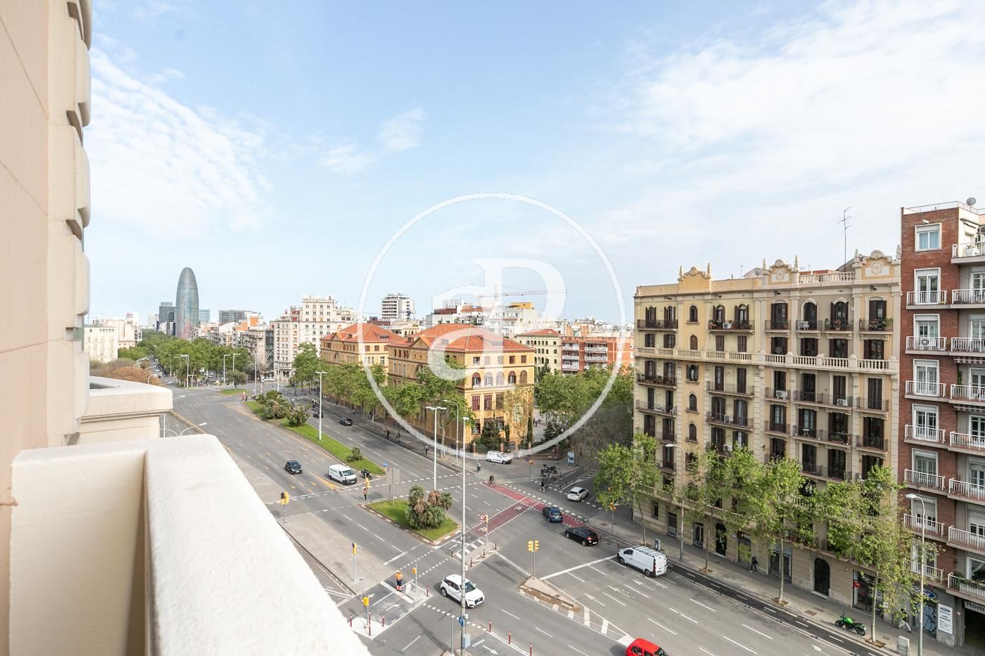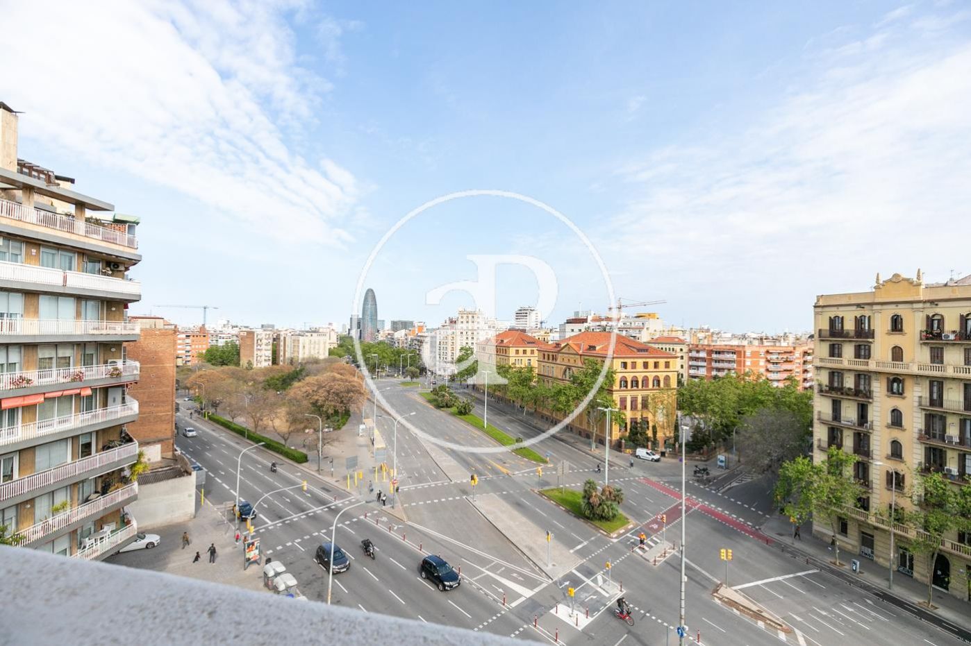 El amplio salón comedor, tiene salida a un pequeño balcón donde se puede disfrutar de unas maravillosas visas a la ciudad condal, tanto de día como de noche, toda iluminada.