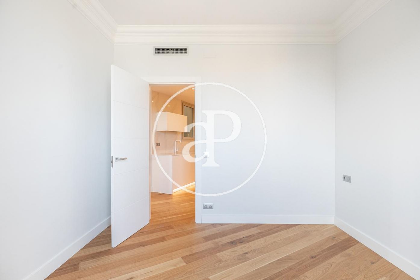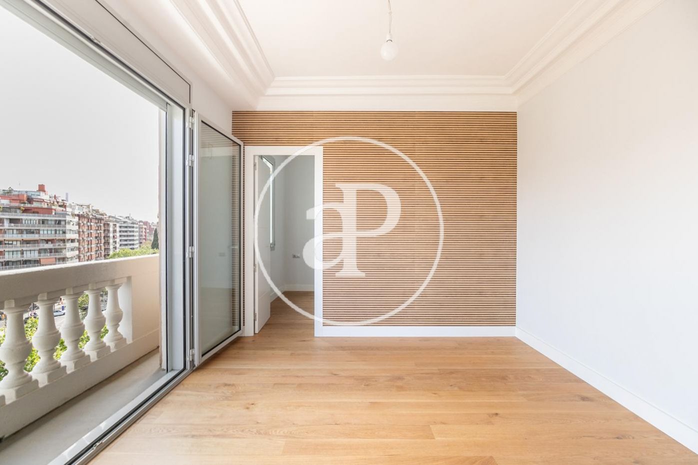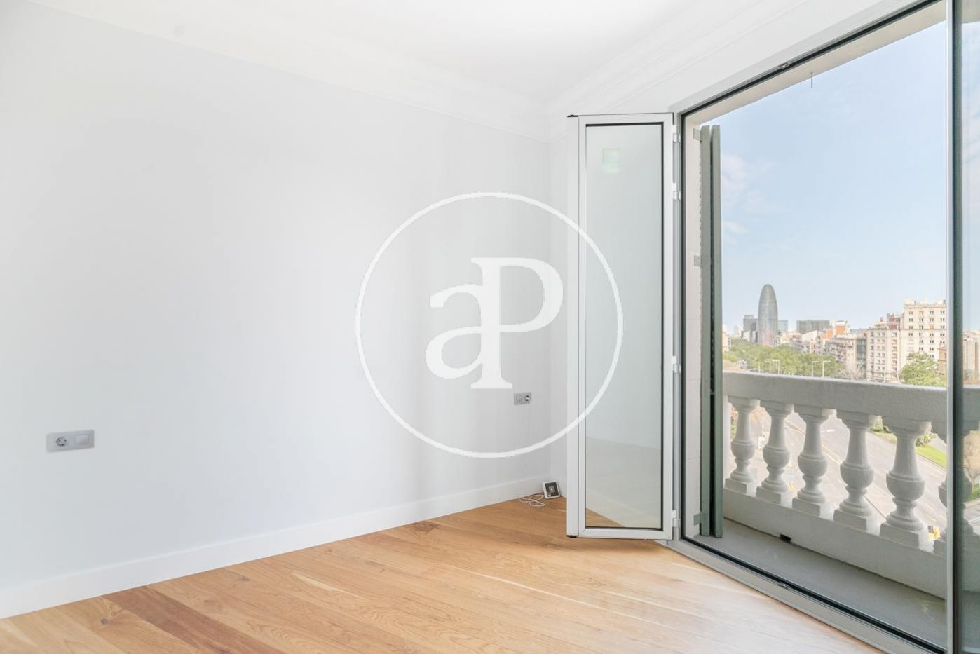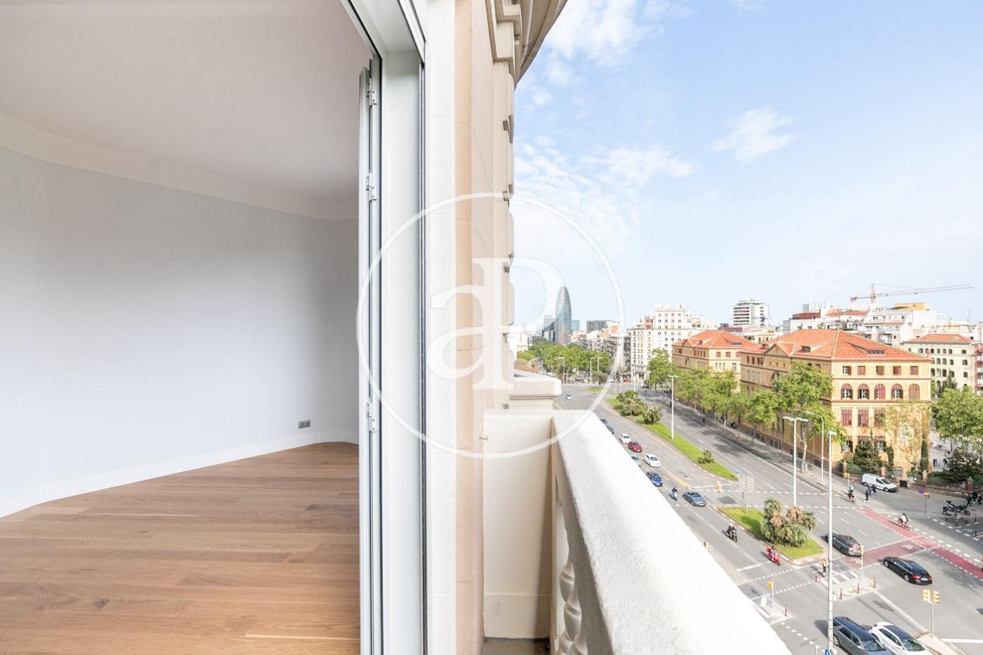 El amplio salón comedor, tiene salida a un pequeño balcón donde se puede disfrutar de unas maravillosas visas a la ciudad condal, tanto de día como de noche, toda iluminada.