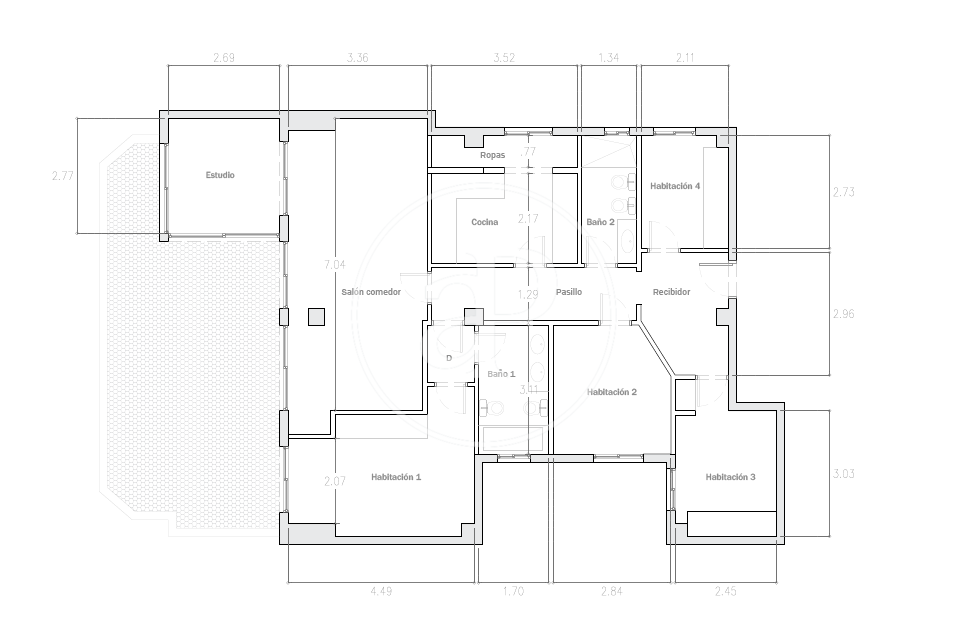 La distribución del piso ofrece una gran versatilidad, ya que todas las paredes son tabiques, lo que permite adaptarse dependiendo de las necesidades. El salón cuenta con un anexo colindante con la terraza que puede ser transformado en una terraza interior, un lounge, un despacho o incluso una zona polivalente.