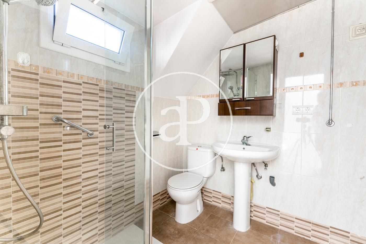 aProperties ofrece en alquiler este exclusivo ático de 365m2 y 395m2 de terraza ubicado en la urbanización La Finca en Pozuelo de Alarcón. La vivienda se distribuye en dos plantas, siendo la planta principal vivienda y la planta superior terraza con piscina privada de tipo desbordante, zonas verdes, instalación para cocina exterior y ducha exterior. En cuanto a la distribución, accedemos a la vivienda a través de un amplio recibidor con vistas al campo de golf, en este espacio hay una zona amplia y diáfana que podría utilizarse como despacho, sala de estar o cualquier otro uso, también en esta zona se encuentra un amplio vestidor y el ascensor de acceso a la planta superior. A la izquierda del hall, encontramos un aseo de cortesía y el acceso a la zona de servicio, con dormitorio en suite, lavandería con tendedero exterior, armarios empotrados, despensa y por último la cocina. Destacar en la cocina, los electrodomésticos de la prestigiosa casa alemana Gaggenau, el frigorífico tamaño americano, cava para vino y las diferentes zonas de almacenaje, así como su isla central y la zona de desayuno. Tanto desde la cocina como desde el hall de entrada, encontramos el acceso al gran salón comedor, con amplios ventanales de suelo a techo y terrazas con vistas al campo de golf, cuenta también con una elegante chimenea y las terrazas disponen de toldos. En cuanto a la zona más privada y familiar, dos dormitorios en suite de gran tamaño con armarios empotrados y el dormitorio principal, compuesto por una habitación con armario empotrado y acceso a una terraza con vistas al golf, un baño completo con bañera, dos duchas, doble lavabo y zona independiente de wc y bidet. Dentro de la zona en la que se encuentra el dormitorio principal, encontramos también una habitación a la que se le pueden dar diferentes usos ya sea como vestidor, despacho, sala de estar o incluso un dormitorio para un bebé. En la azotea, totalmente privada, encontramos la piscina desbordante, pequeños jardines con riego automático, zona de solárium y una zona con instalación para cocina.  La vivienda cuenta con un avanzado sistema de domótica, suelo radiante refrescante, cinco plazas de garaje, un trastero y cuarto de bicicletas comunitario. En cuanto a la urbanización, se trata de un complejo con servicio de seguridad privado, circuito de videovigilancia, gimnasio, piscina, zona para mascotas y diversas zonas ajardinadas con un cuidado trabajo de paisajismo. ¿Te imaginas vivir aquí?