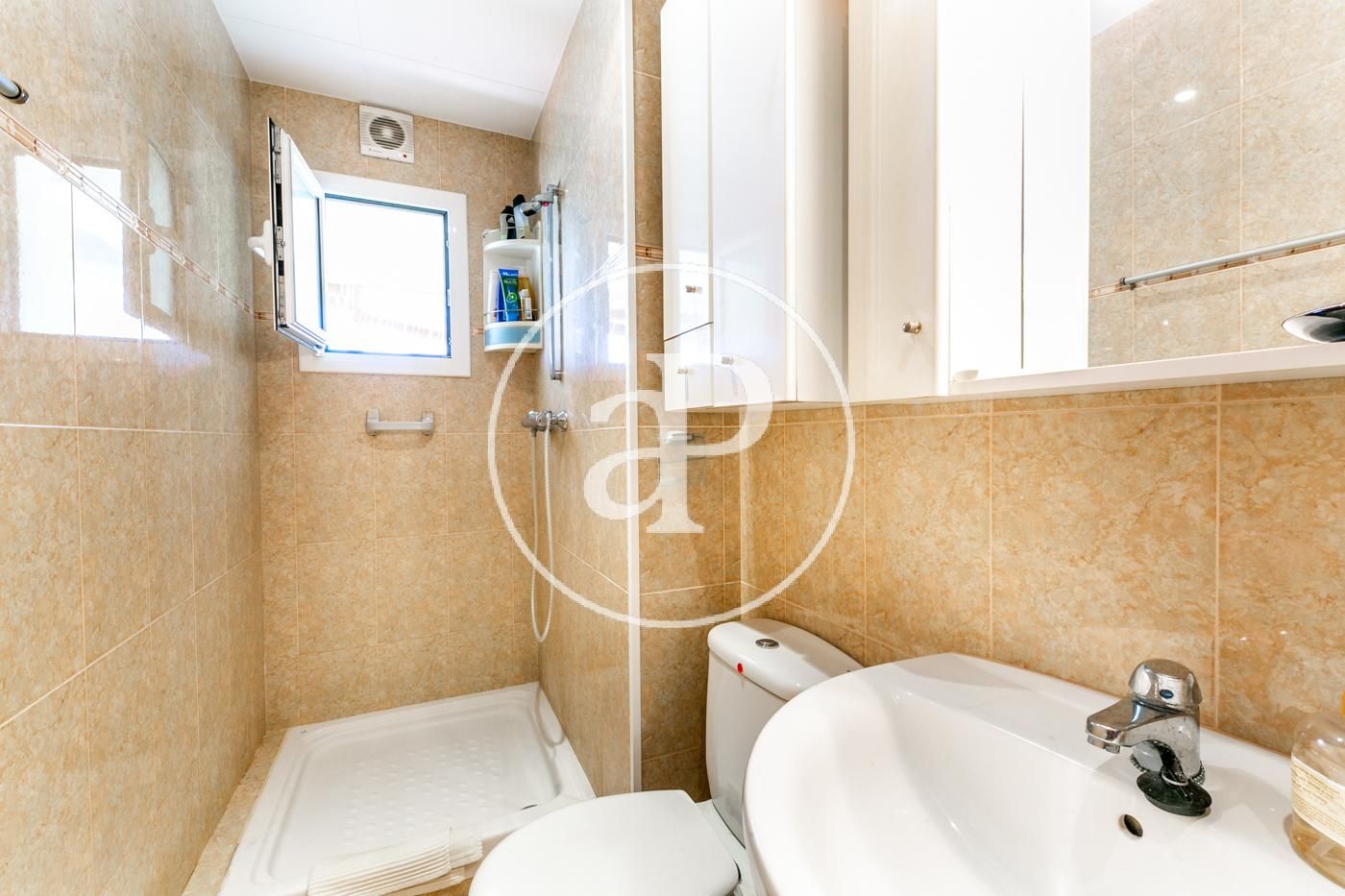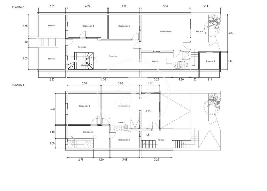 Su distribución actual se compone, en planta baja, de dos terrazas que dan a la parte delantera de la casa, cada una con aproximativamente 8 m2. Nada más entrar encontramos un saló exterior, dos dormitorios dobles exteriores, una cocina independiente, una sala de unos 19 m2, un baño completo con plato de ducha, una terraza de 11m2 y un trastero.