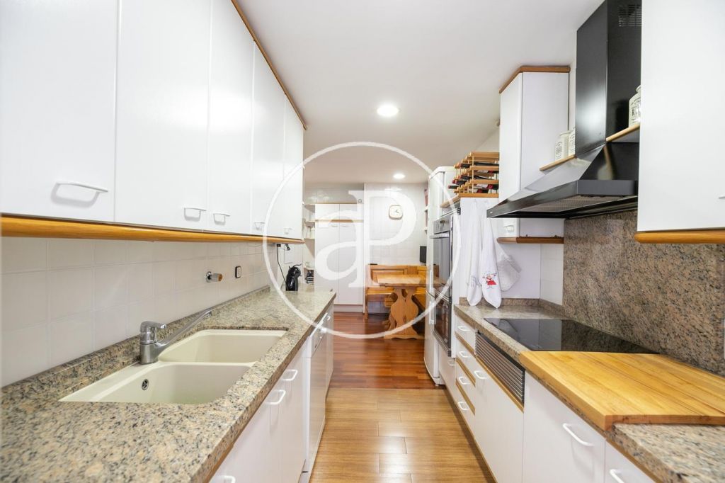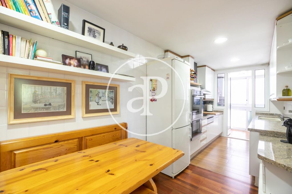 El salón es muy grande, en estos momentos la terraza está integrada en él pero se podría volver abrir sin problemas. La cocina es muy amplia con zona para poder comer. Comunica con la zona de lavado.