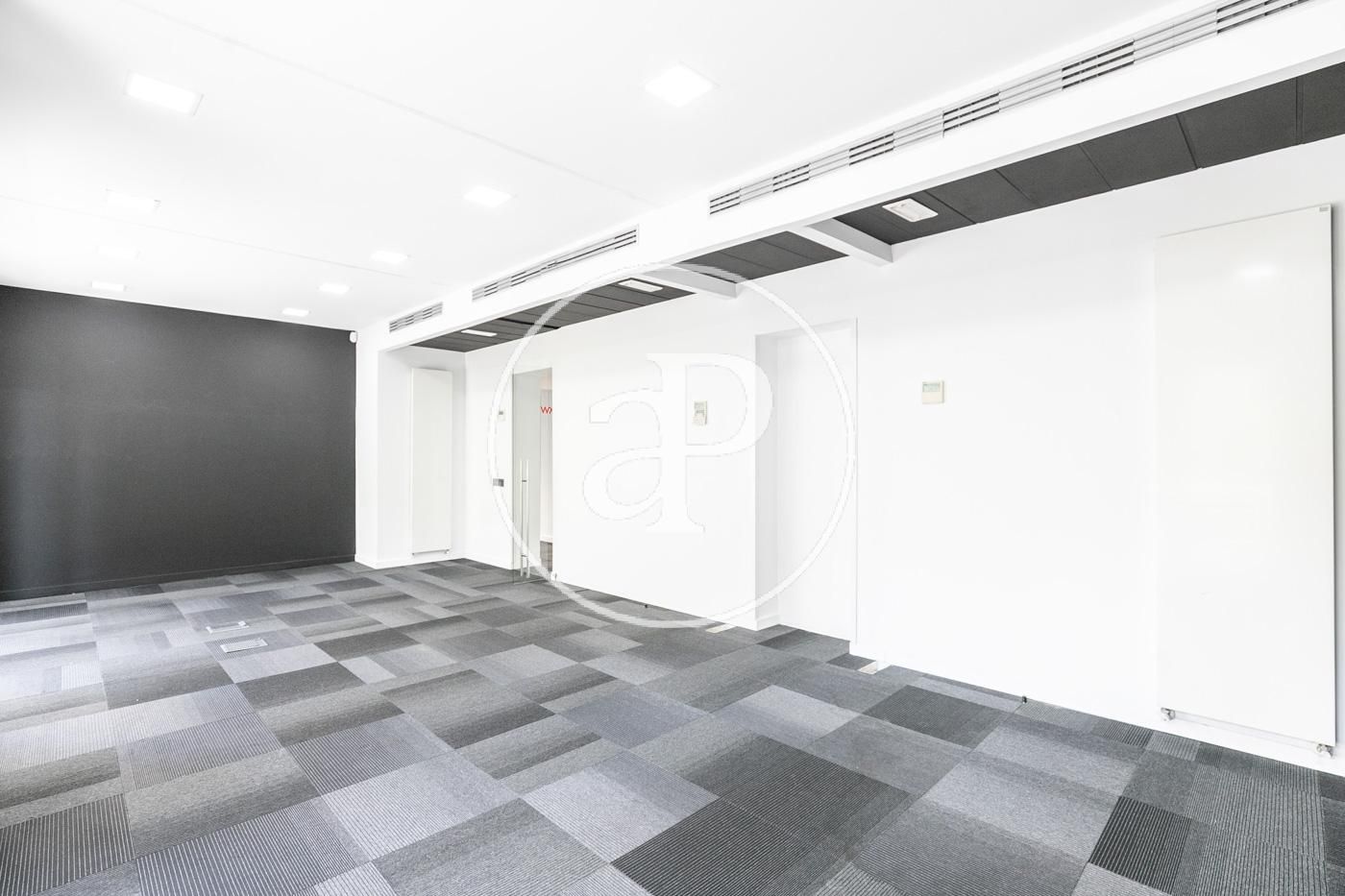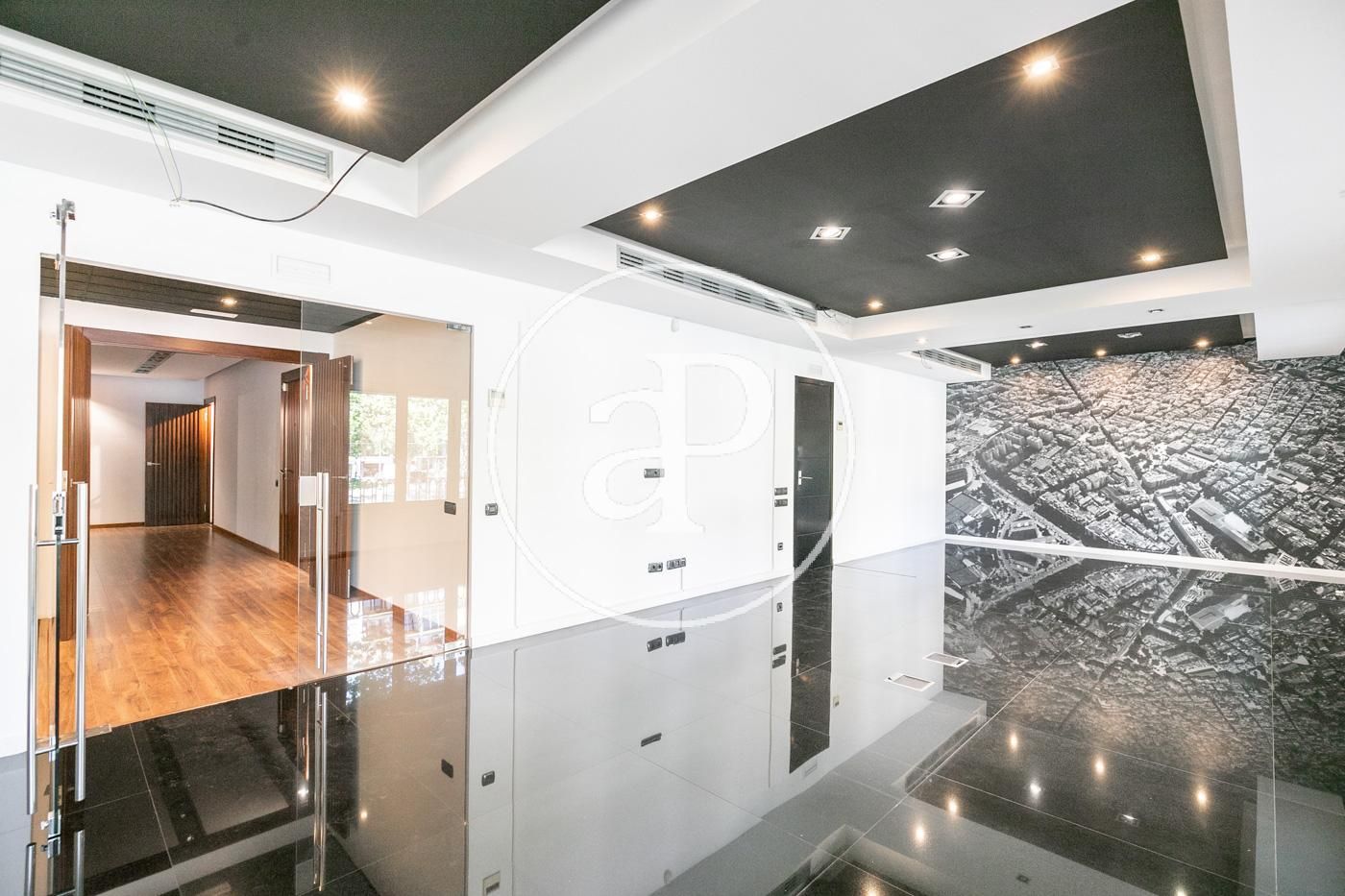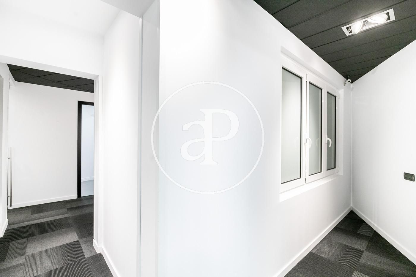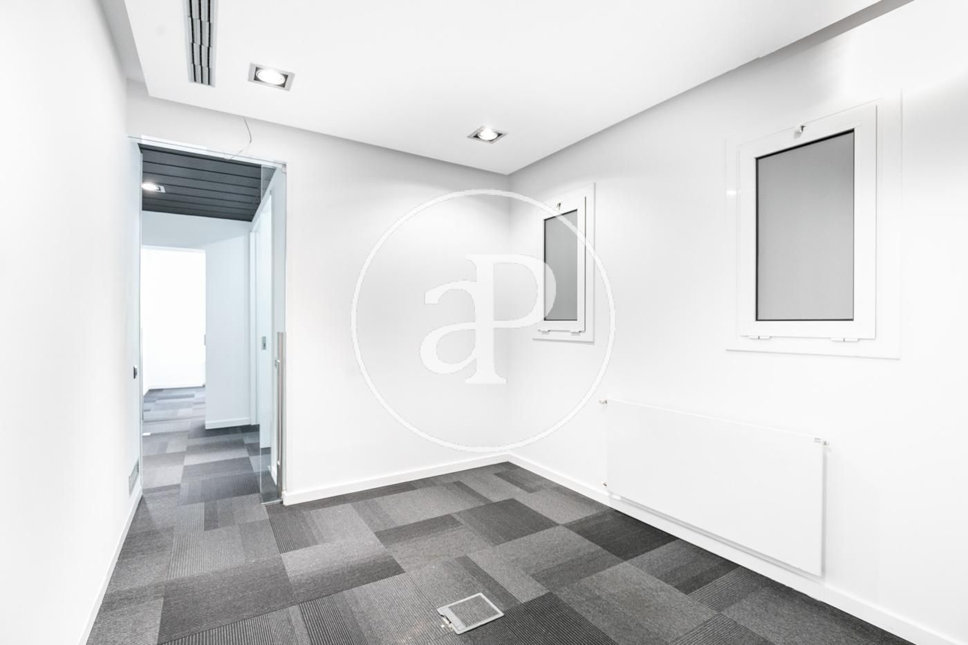 Hasta ahora ha estado alquilada como oficina con una distribución (8 espacios que se pueden habilitar como habitaciones, despacho, biblioteca, habitación de juegos y de servicio, etc.) espacio para la cocina, dispone de 2 aseos y lo más importante no hay paredes maestras por lo que con una buena reforma el resultado sería una magnifica vivienda.