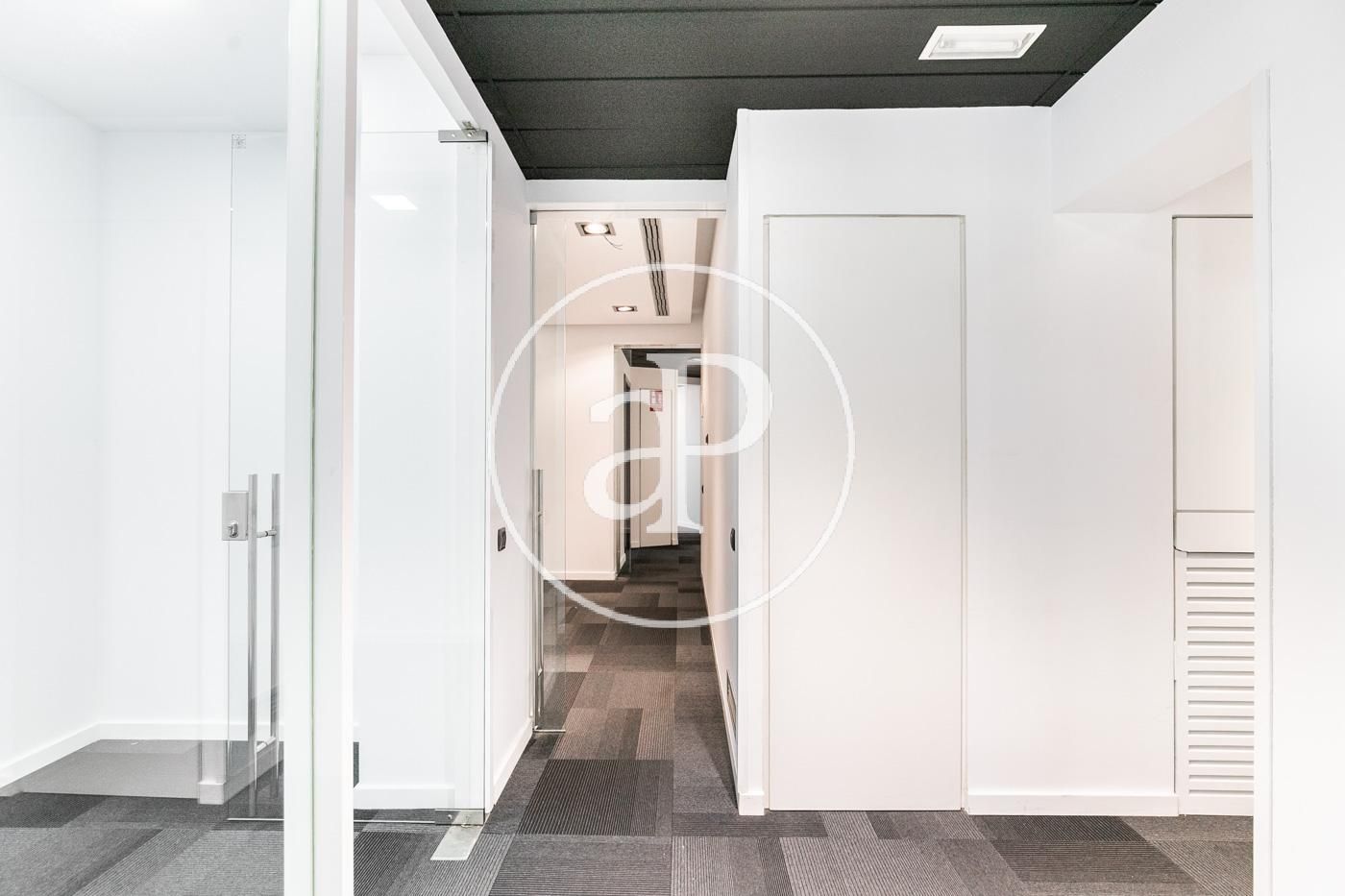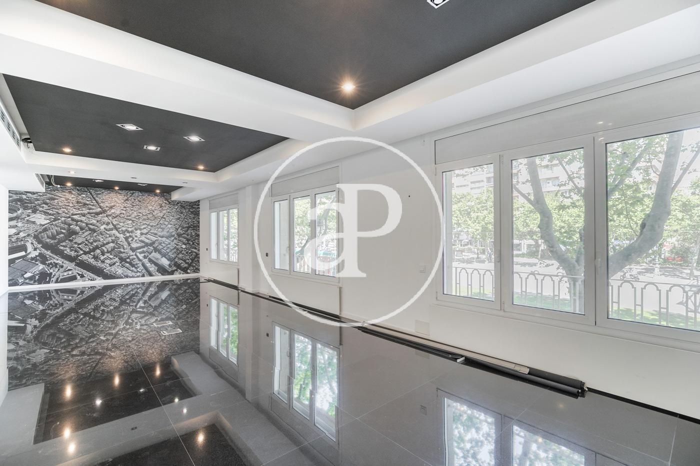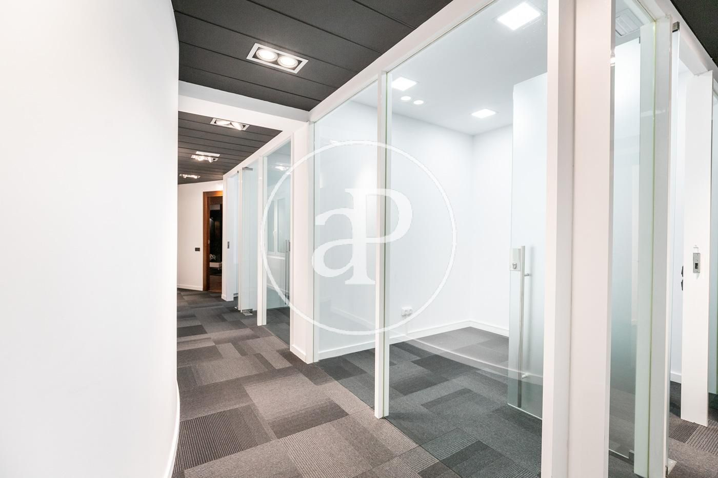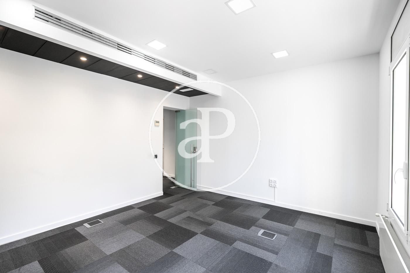 Hasta ahora ha estado alquilada como oficina con una distribución (8 espacios que se pueden habilitar como habitaciones, despacho, biblioteca, habitación de juegos y de servicio, etc.) espacio para la cocina, dispone de 2 aseos y lo más importante no hay paredes maestras por lo que con una buena reforma el resultado sería una magnifica vivienda.