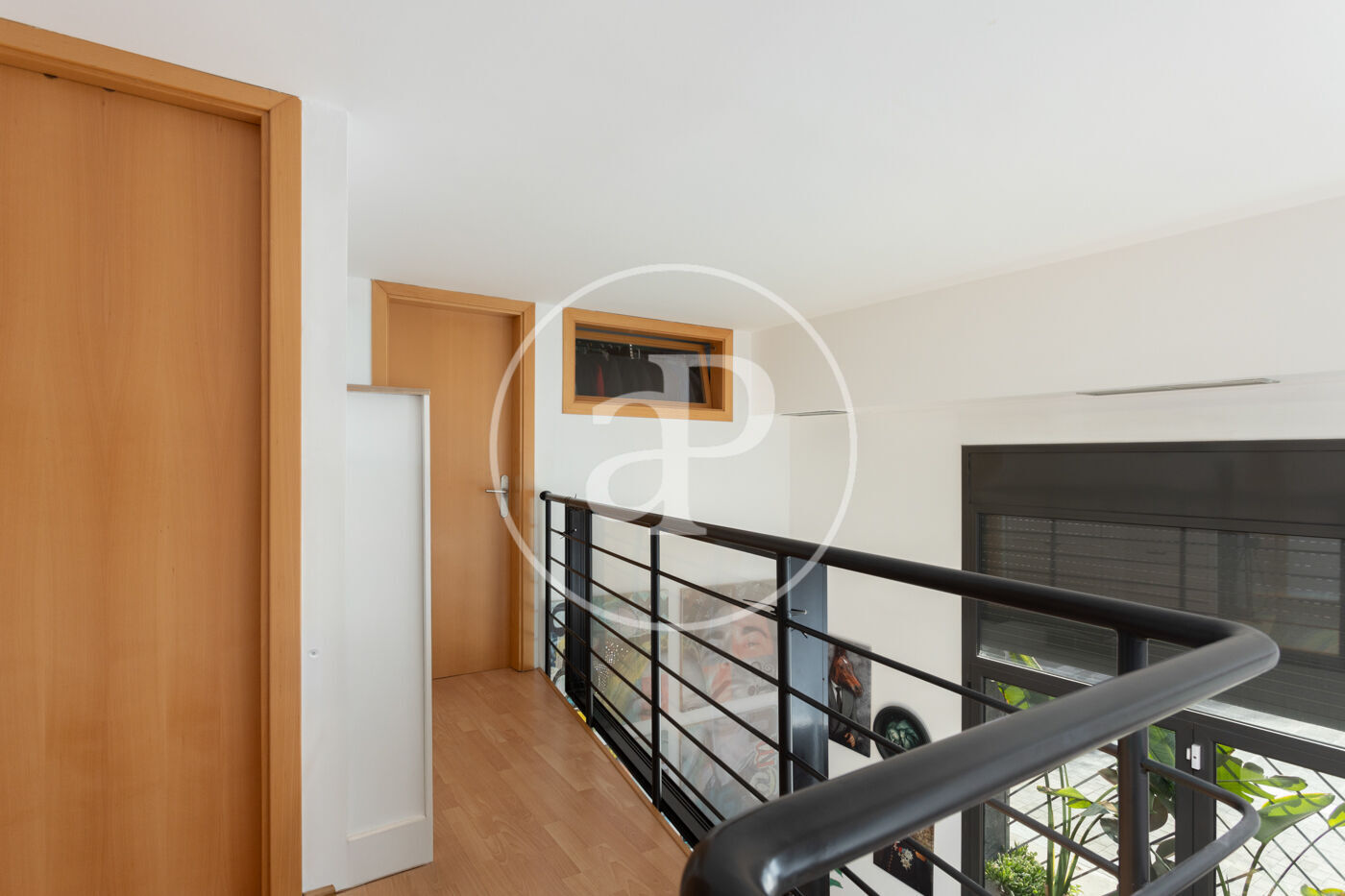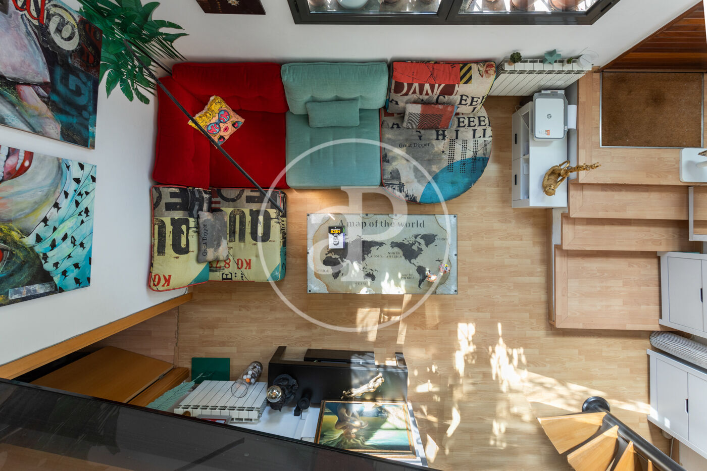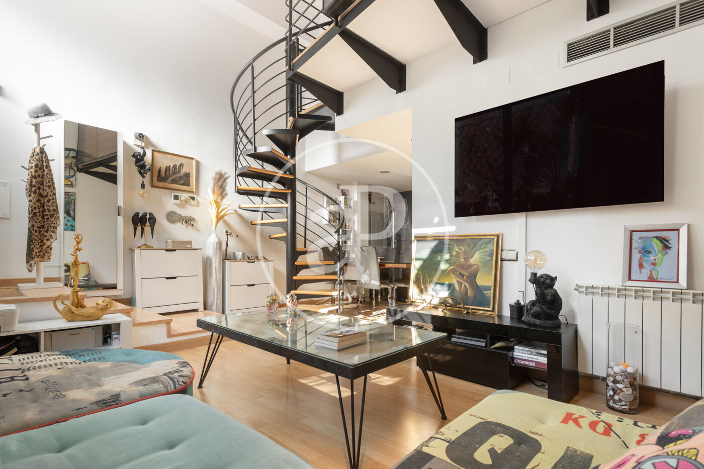 Con una distribución funcional que optimiza el espacio, la vivienda de 82 m² destaca por sus techos altos y grandes ventanales que permiten la entrada de luz natural durante todo el día. En la planta inferior, de 57,35 m², se encuentra el salón-comedor con una cocina americana completamente equipada, que conecta con un pequeño patio interior de aproximadamente 2,60 m². También en esta planta se ubica la habitación principal en suite, con baño privado equipado con bañera y armario empotrado.