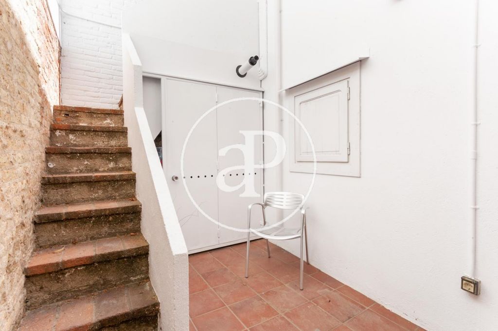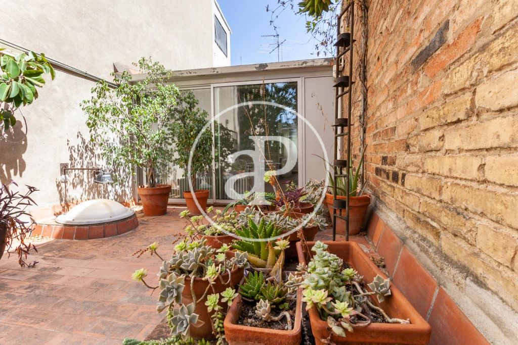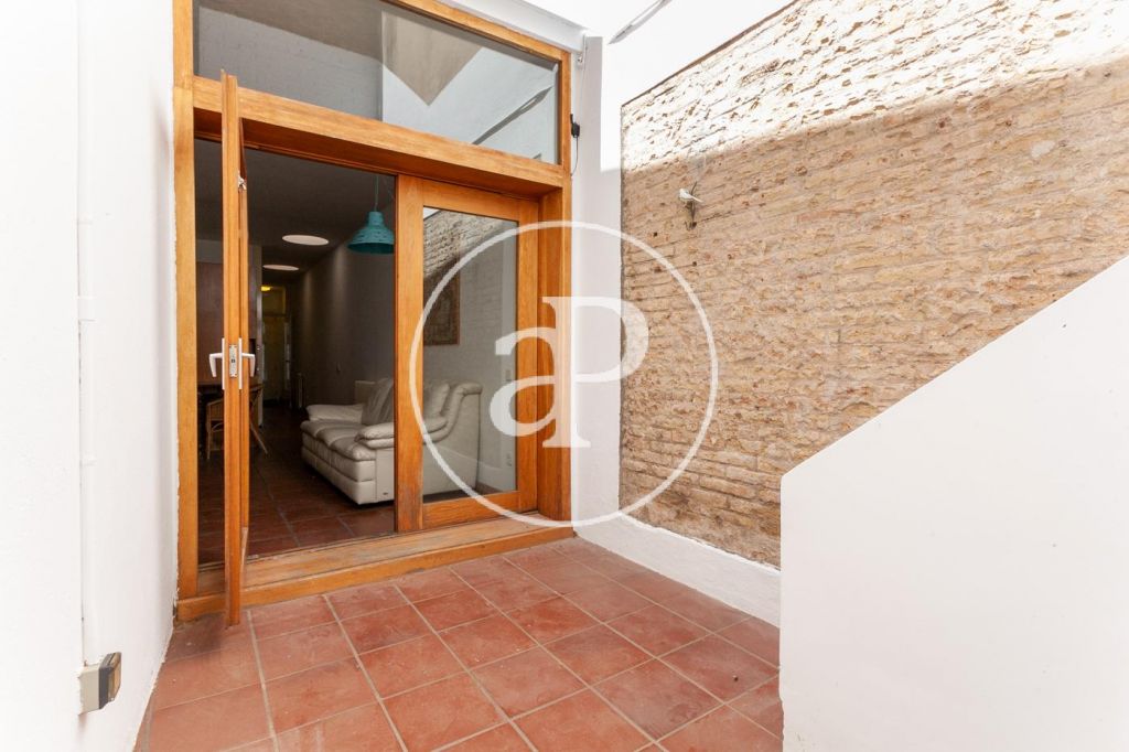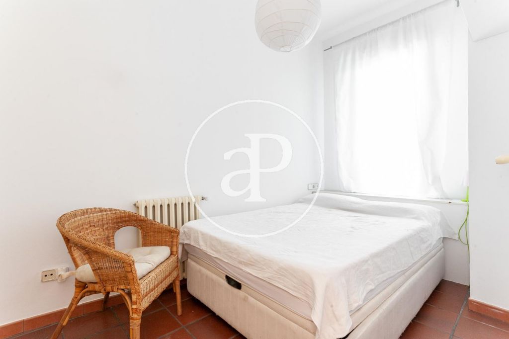 La puerta de entrada conduce a un dormitorio exterior a calle con armarios empotrados, un baño completo con bañera cocina abierta al salón con salida a un pequeño patio, otro dormitorio con armarios empotrados. En esta planta el suelo es de gres, calefacción por radiadores a gas .Desde el patio arranca una escalera que lleva a la planta superior donde hay un espacio diáfano de unos 30 m2 acristalado con un baño con ducha ideal como zona de trabajo independiente de la casa, suelo de parquet, radiadores a gas y salida a una bonita terraza de 35 m2.