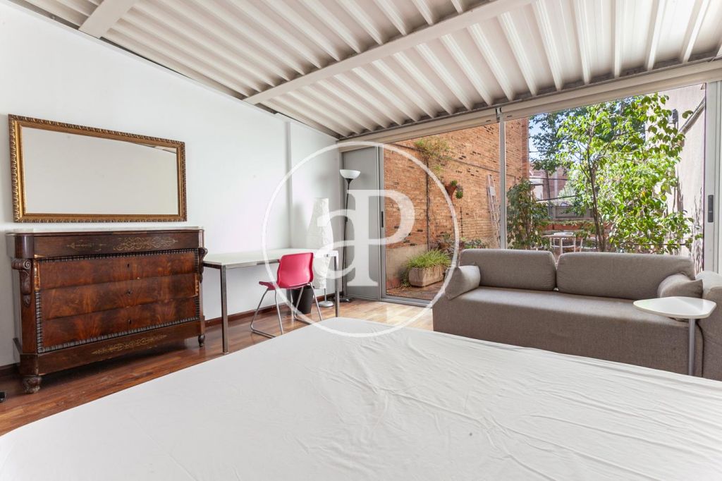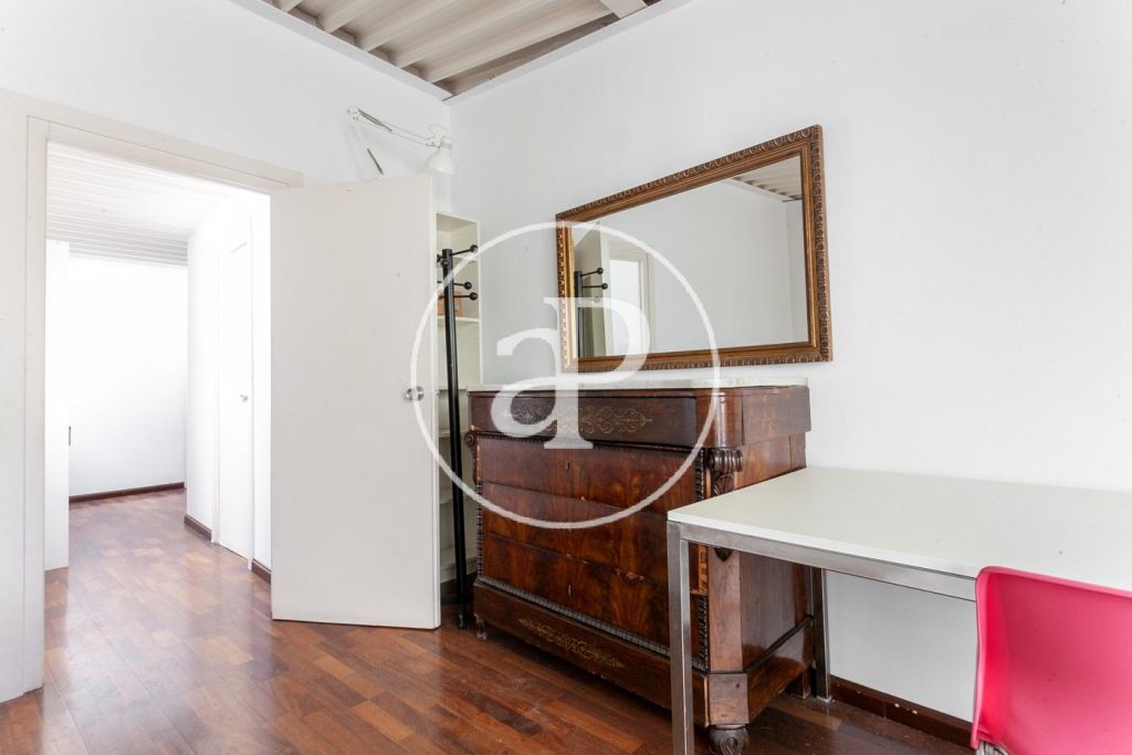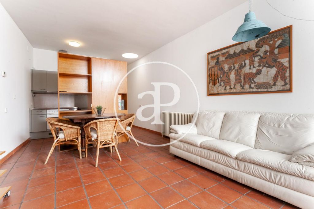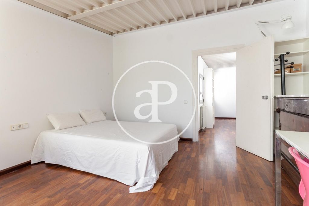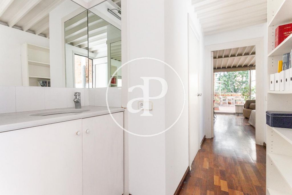 La puerta de entrada conduce a un dormitorio exterior a calle con armarios empotrados, un baño completo con bañera cocina abierta al salón con salida a un pequeño patio, otro dormitorio con armarios empotrados. En esta planta el suelo es de gres, calefacción por radiadores a gas .Desde el patio arranca una escalera que lleva a la planta superior donde hay un espacio diáfano de unos 30 m2 acristalado con un baño con ducha ideal como zona de trabajo independiente de la casa, suelo de parquet, radiadores a gas y salida a una bonita terraza de 35 m2.