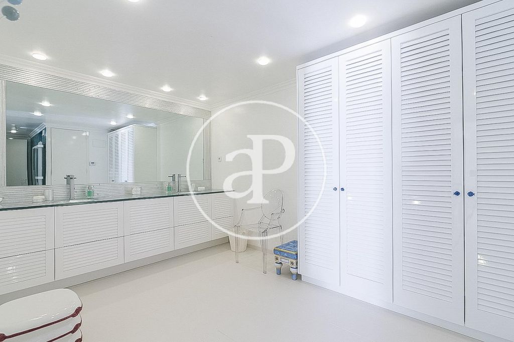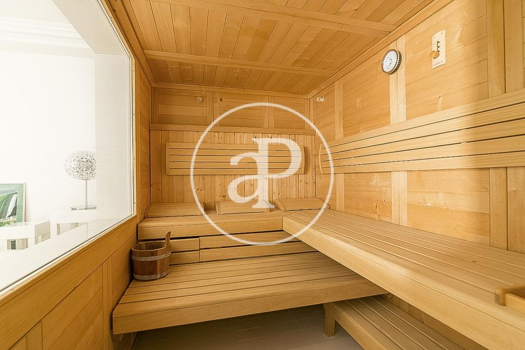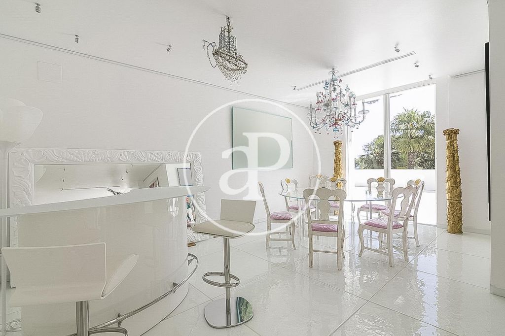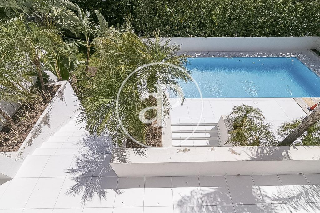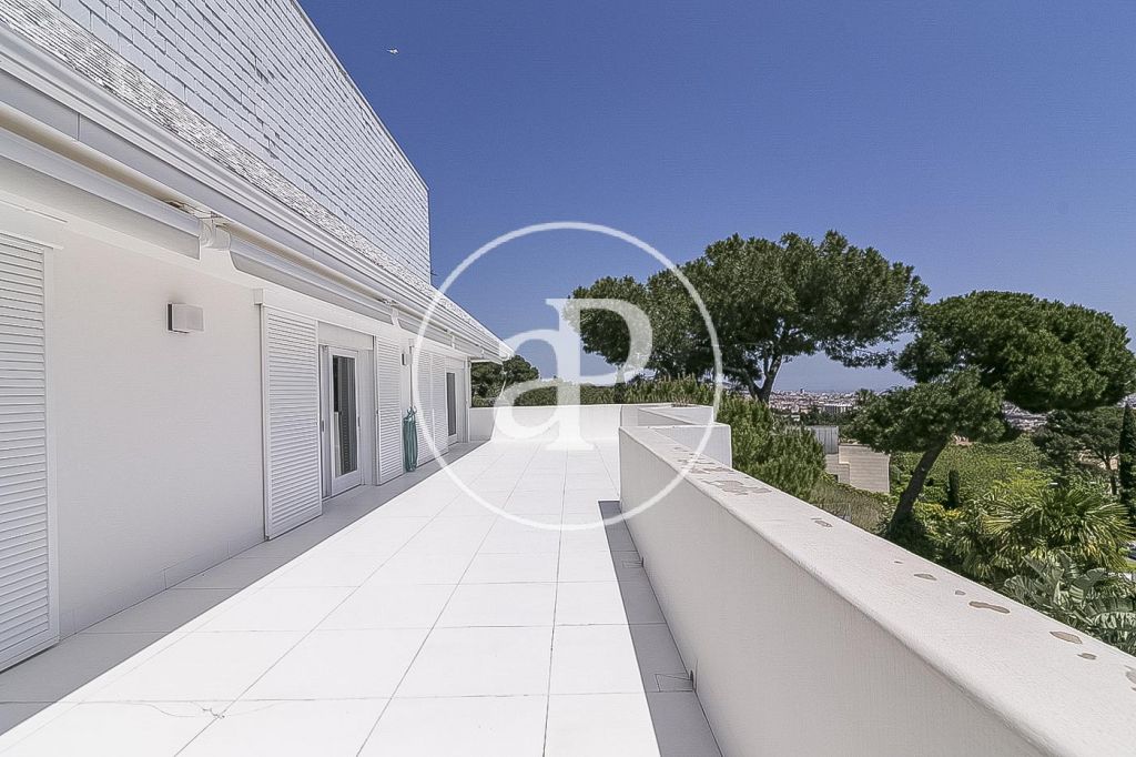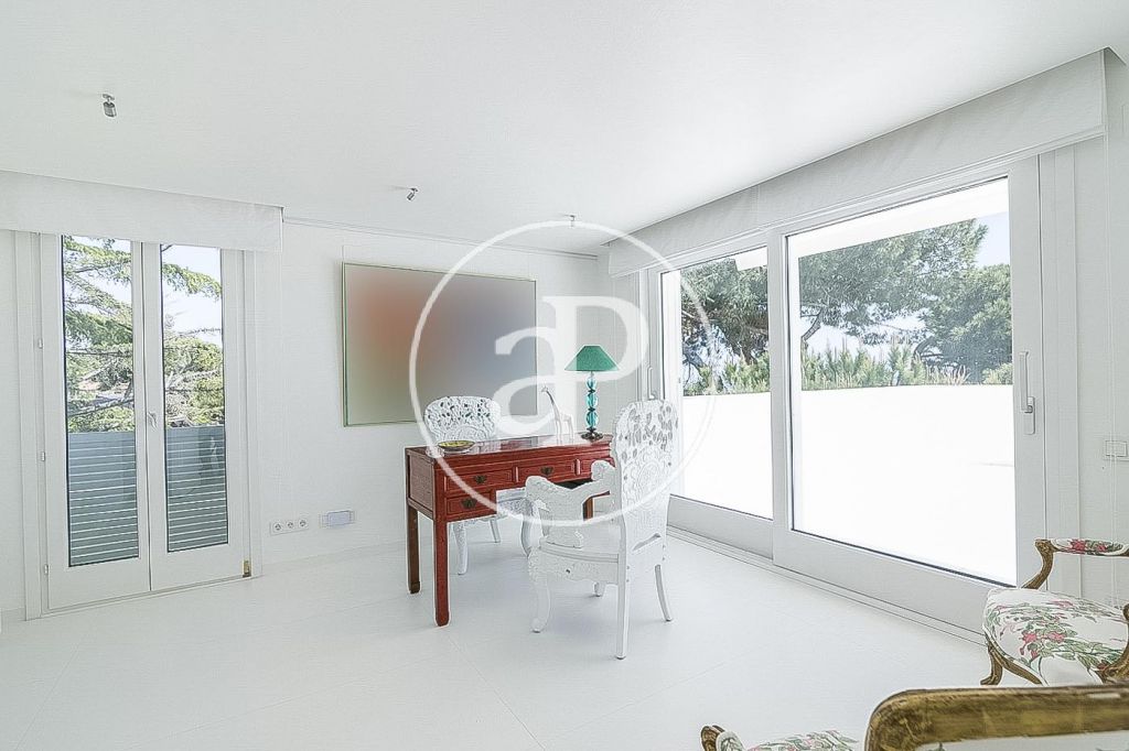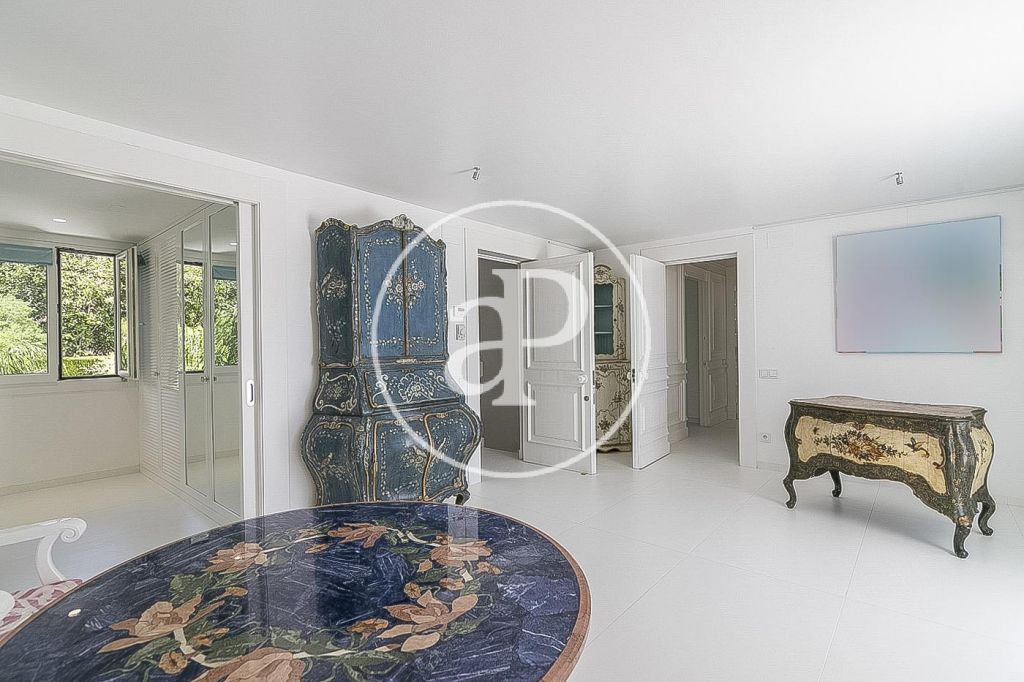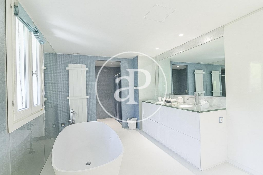 En la prestigiosa, residencial y tranquila zona de Pedralbes, junto a la Avenida Pearson, IESE, cerca de prestigiosos colegios nacionales e internacionales, junto al colegio Betania-Patmos, el Monasterio de Pedralbes y rodeados de jardines, se encuentra esta luminosa casa unifamiliar amueblada de 1.000m². La casa construida en tres plantas tiene dos entradas. Desde la planta principal arranca la espléndida escalera que comunica con la planta superior. En la planta principal encontramos el recibidor, un salón de 60m², un comedor y otro salón de televisión todo con salida al jardín y piscina, cocina independiente, zona de aguas y un aseo de cortesía. La primera planta la componen 4 habitaciones dobles exteriores con armarios empotrados y 3 baños completos, uno de ellos es el dormitorio principal en suite con baño y salida a una espectacular terraza. En la última planta se encuentra una sala diáfana con espectaculares vistas sobre Barcelona y 2 dormitorios en suite con baño. En la planta sótano está el gimnasio, el jacuzzi, zona de relax, sauna, sala de cine, y salida al jardín y piscina, garaje para seis o más coches con entrada independiente por otra calle, 2 habitaciones de servicio completamente independientes. La casa dispone de ascensor, suelos de mármol vitrificado, calefacción de gas por radiadores, persianas eléctricas, puertas y ventanas Climalit. Se alquila con muebles y electrodomésticos.