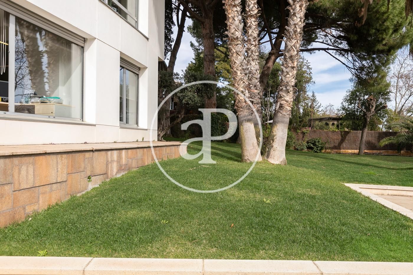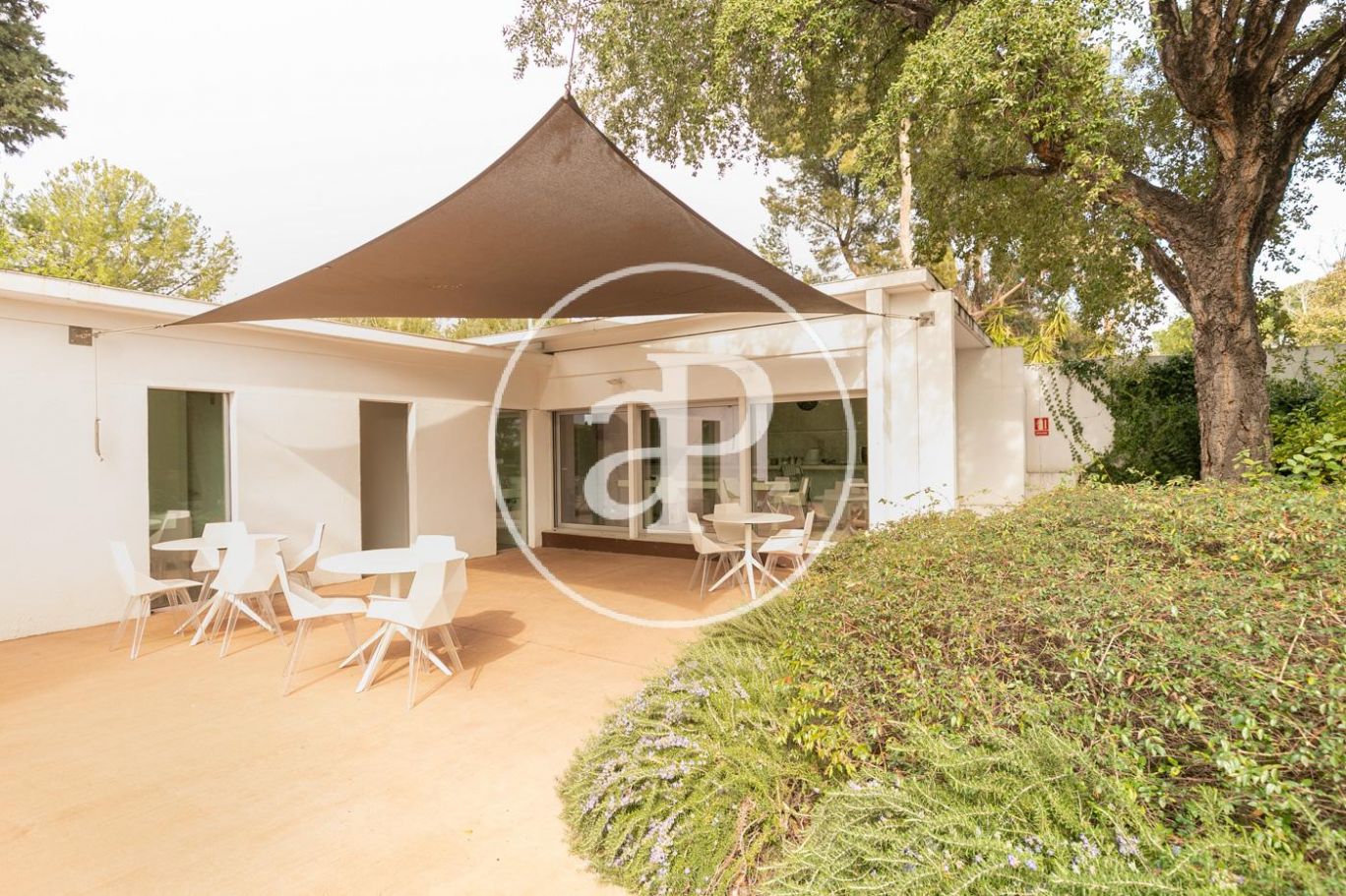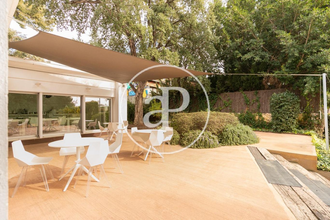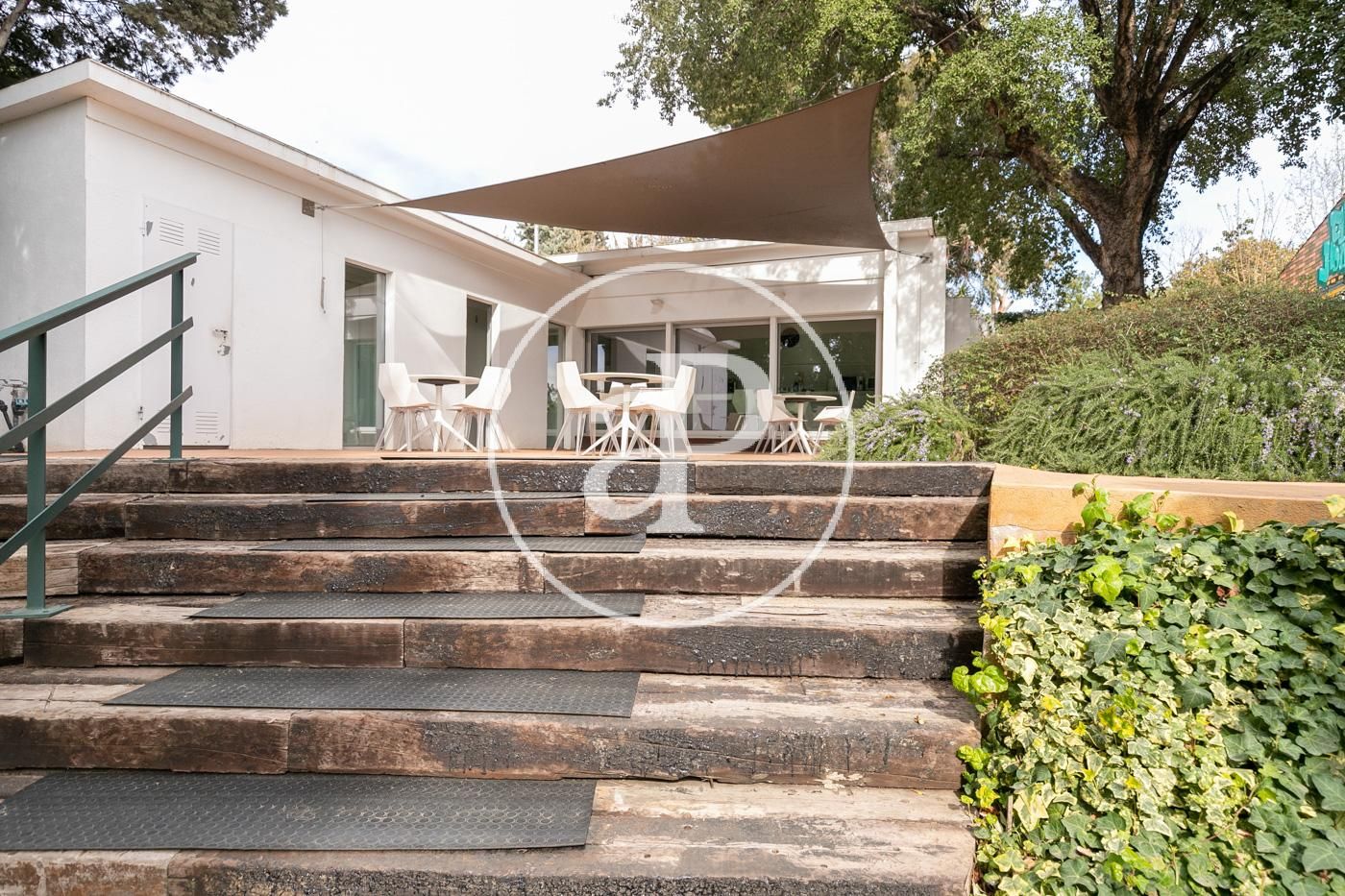 Espectacular ático dúplex de 614m2 construidos, cinco terrazas de un total de 52m2 y una cubierta de 256m2, orientado a sureste y a cuatro vientos, está ubicado en el histórico edificio residencial de Les Escales Park en Pedralbes.  Reconocido con el Premio FAD y proyectado por el arquitecto catalán Josep Lluís Sert, es un referente en la historia de la arquitectura del siglo XX. Está custodiado por un importante bosque de pinos y una serie de cascadas, su estructura de hormigón armado, muros de piedra y su controvertido diseño de rectángulos asimétricos, contrasta con elementos típicos locales como las persianas de librillo, los techos de viga y bovedilla o la cerámica vidriada de color ocre y verde-gris. El edificio es de cinco bloques, pero sólo este dúplex obedece a las ideas originales de Sert.  Este piso para estrenar, reformado íntegramente con un exquisito respeto por su singularidad, goza de las mejores vistas panorámicas de Barcelona. Está repartido en dos plantas de 264m2 y 298m2 respectivamente, conectados por una escalera interior con un balcón tribuna que preside uno de los comedores. La cocina, en dos ambientes, uno cerrado para cocción y otra de office independiente, está totalmente equipada. Asimismo, existen cuatro salas con diferentes posibilidades de uso, un gran salón polivalente y una magna biblioteca con estantes de mármol blanco de carrara.  Actualmente, tiene cuatro dormitorios en suite, dos de ellos en la planta cuarta y los otros dos, en la planta quinta, una sensacional máster suite con vestidor. Todos los dormitorios, disponen de armarios empotrados. Y, además, hay la posibilidad de redistribuir algunas de sus estancias y convertirlos en tres nuevos dormitorios. Cada uno, tiene su propio baño, hasta un total de siete y dispone de tres aseos de fórmica que se han restaurado fielmente. De la misma manera, se han repuesto o mantenido diferentes elementos decorativos como los pomos de las puertas o los focos, cuya intensidad es regulable en casi todas las estancias.  La vivienda, goza de grandes espacios y colosales ventanales, lo que facilita la entrada de mucha luz natural y propicia una sugerente amalgama de colores y luminosidades, adornadas por los juegos de claros y oscuros provocados por sus jardineras y tragaluces alumbradas con luces led. La azotea, convertida en un mirador solárium con piscina y zona de vestuario con aseo, propician un entorno de relax y disfrute en un marco excepcional. Existe la posibilidad de instalar un ascensor privado para todas las plantas.  Finalmente, la vivienda tiene una habitación de servicio con baño, zona de lavandería, una sala técnica de control de suministros (aerotermia, suelo radiante, etcétera), cuatro plazas de aparcamiento y un trastero. Existe una agradable zona comunitaria de paseo y otra ajardinada con piscina, servicio de conserjería y vigilancia nocturna.