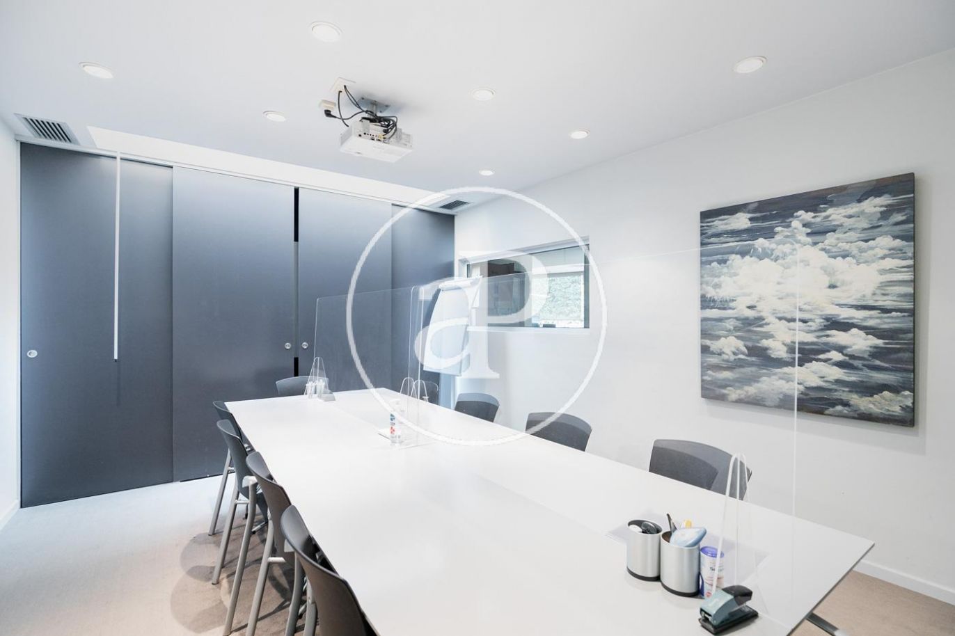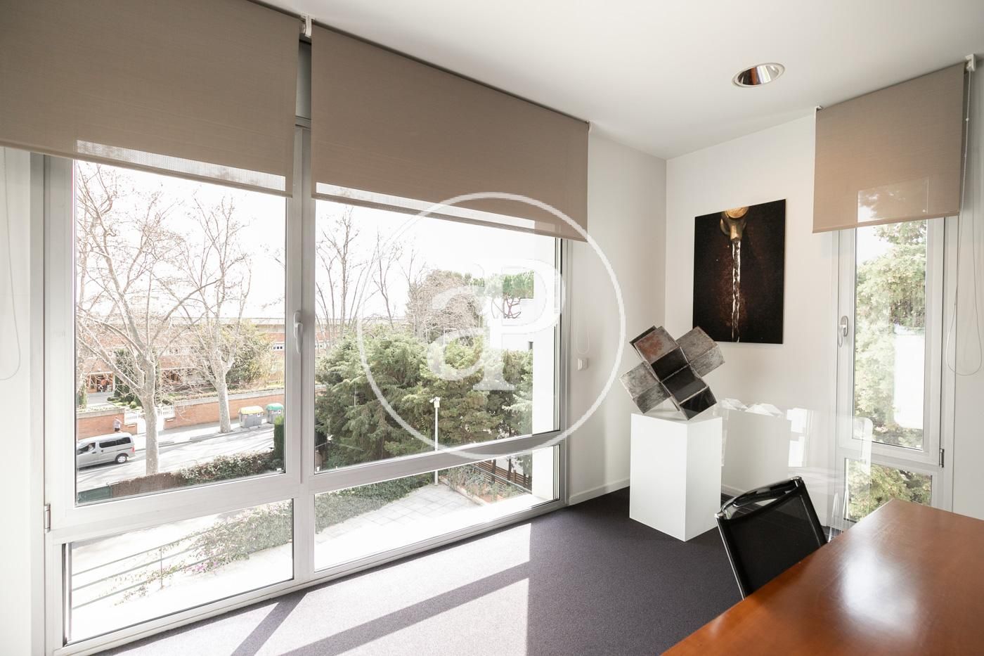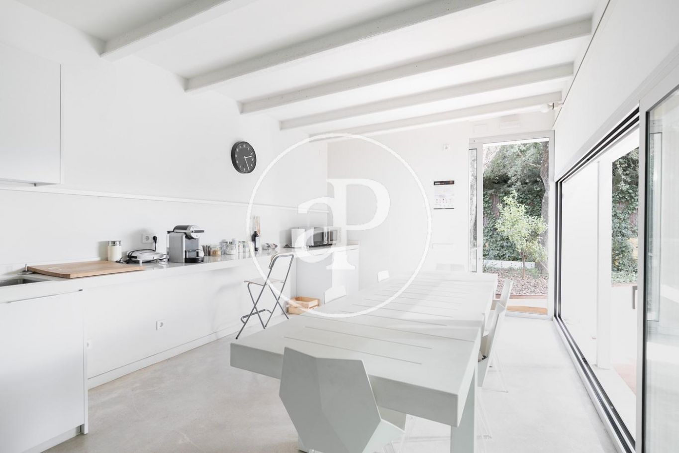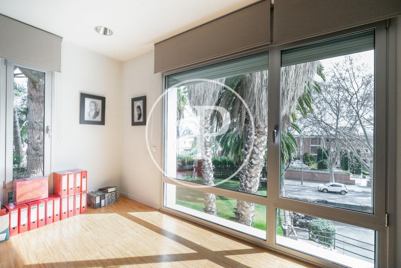 Espectacular ático dúplex de 614m2 construidos, cinco terrazas de un total de 52m2 y una cubierta de 256m2, orientado a sureste y a cuatro vientos, está ubicado en el histórico edificio residencial de Les Escales Park en Pedralbes.  Reconocido con el Premio FAD y proyectado por el arquitecto catalán Josep Lluís Sert, es un referente en la historia de la arquitectura del siglo XX. Está custodiado por un importante bosque de pinos y una serie de cascadas, su estructura de hormigón armado, muros de piedra y su controvertido diseño de rectángulos asimétricos, contrasta con elementos típicos locales como las persianas de librillo, los techos de viga y bovedilla o la cerámica vidriada de color ocre y verde-gris. El edificio es de cinco bloques, pero sólo este dúplex obedece a las ideas originales de Sert.  Este piso para estrenar, reformado íntegramente con un exquisito respeto por su singularidad, goza de las mejores vistas panorámicas de Barcelona. Está repartido en dos plantas de 264m2 y 298m2 respectivamente, conectados por una escalera interior con un balcón tribuna que preside uno de los comedores. La cocina, en dos ambientes, uno cerrado para cocción y otra de office independiente, está totalmente equipada. Asimismo, existen cuatro salas con diferentes posibilidades de uso, un gran salón polivalente y una magna biblioteca con estantes de mármol blanco de carrara.  Actualmente, tiene cuatro dormitorios en suite, dos de ellos en la planta cuarta y los otros dos, en la planta quinta, una sensacional máster suite con vestidor. Todos los dormitorios, disponen de armarios empotrados. Y, además, hay la posibilidad de redistribuir algunas de sus estancias y convertirlos en tres nuevos dormitorios. Cada uno, tiene su propio baño, hasta un total de siete y dispone de tres aseos de fórmica que se han restaurado fielmente. De la misma manera, se han repuesto o mantenido diferentes elementos decorativos como los pomos de las puertas o los focos, cuya intensidad es regulable en casi todas las estancias.  La vivienda, goza de grandes espacios y colosales ventanales, lo que facilita la entrada de mucha luz natural y propicia una sugerente amalgama de colores y luminosidades, adornadas por los juegos de claros y oscuros provocados por sus jardineras y tragaluces alumbradas con luces led. La azotea, convertida en un mirador solárium con piscina y zona de vestuario con aseo, propician un entorno de relax y disfrute en un marco excepcional. Existe la posibilidad de instalar un ascensor privado para todas las plantas.  Finalmente, la vivienda tiene una habitación de servicio con baño, zona de lavandería, una sala técnica de control de suministros (aerotermia, suelo radiante, etcétera), cuatro plazas de aparcamiento y un trastero. Existe una agradable zona comunitaria de paseo y otra ajardinada con piscina, servicio de conserjería y vigilancia nocturna.