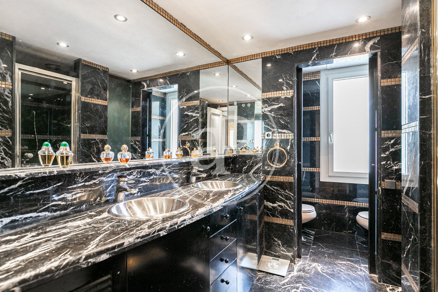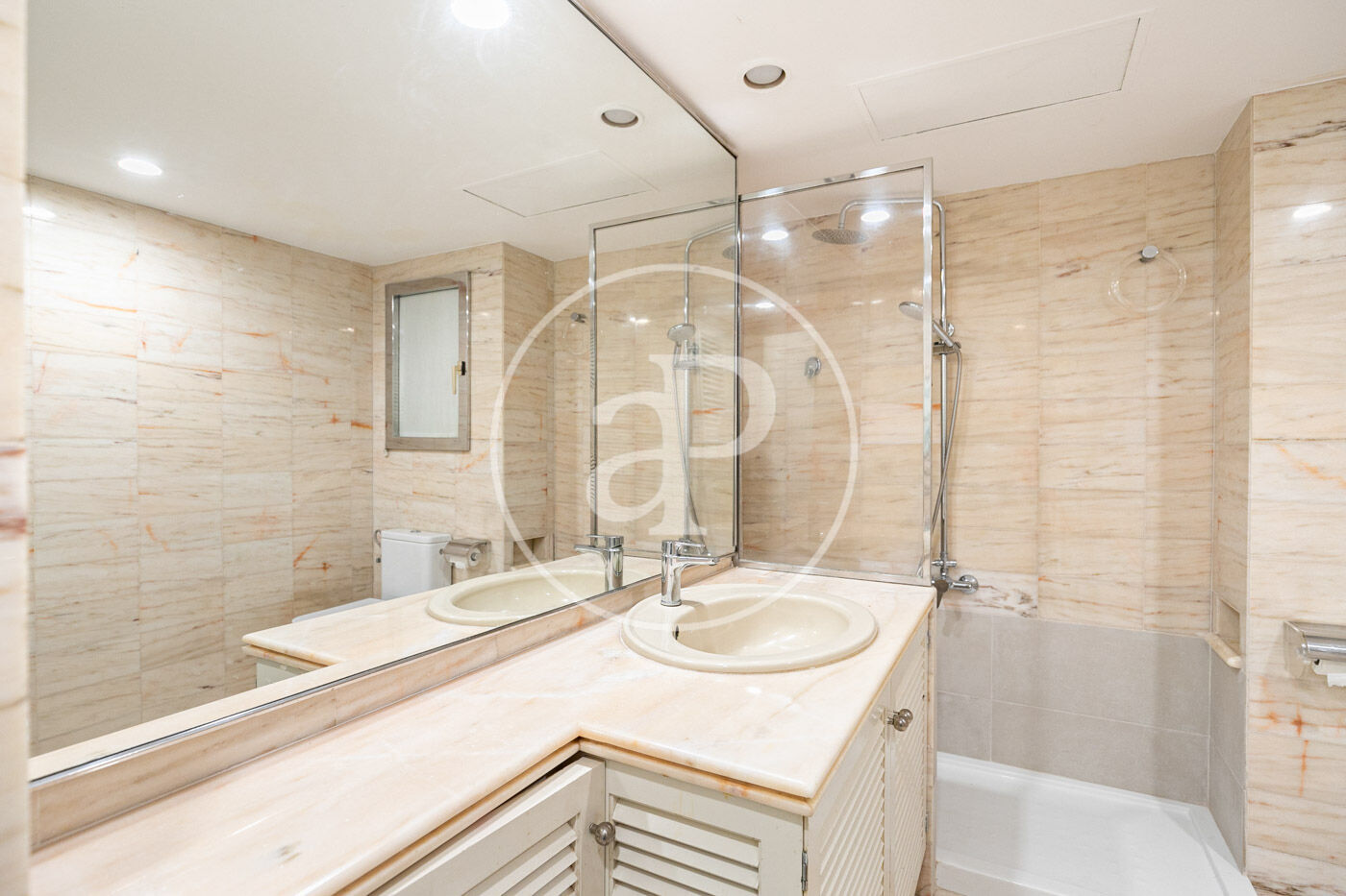La zona de noche está compuesta por tres dormitorios y una amplia estancia con salida a la terraza, actualmente utilizada como sala de televisión, pero convertible en un cuarto dormitorio, despacho, habitación de estudio u otros usos. El dormitorio principal es una master suite amplia y muy luminosa con salida a la terraza, cuenta con un área de vestidor, un elegante baño en mármol negro y múltiples armarios empotrados. El segundo dormitorio es una suite con armarios empotrados y baño con ducha. El tercer dormitorio es una habitación individual y tiene a disposición un baño en el pasillo.