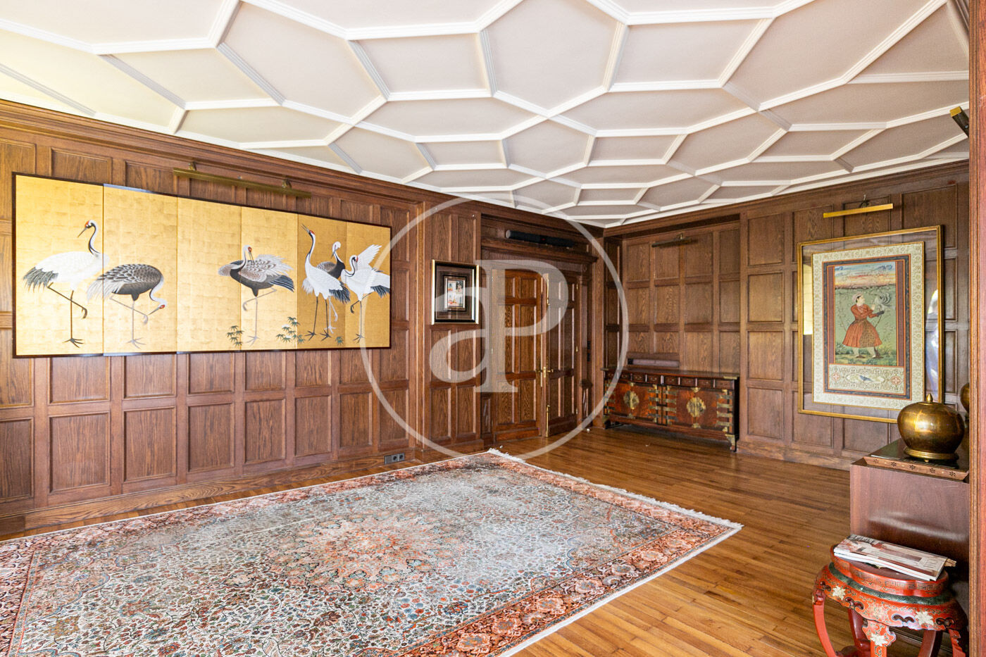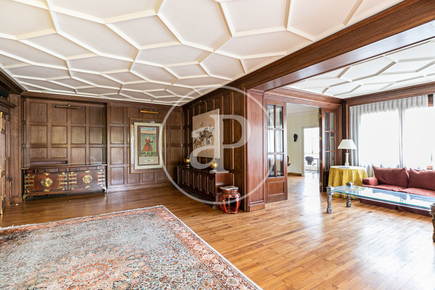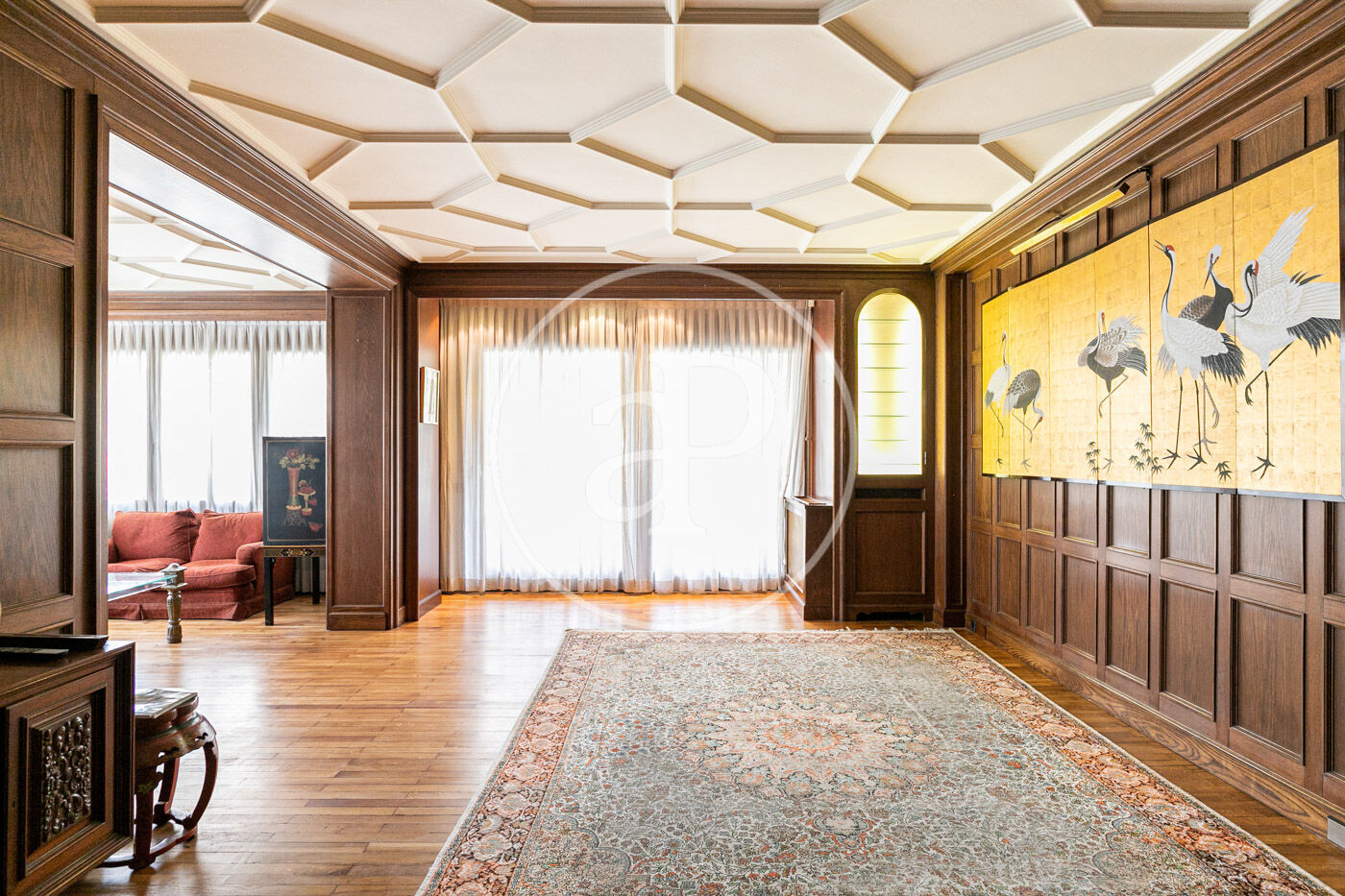 La vivienda con suelo de parquet, cuenta con un recibidor noble muy amplio que, a su vez, hace de distribuidor de la zona de día y la de noche. Esta primera, está distribuida en tres grandes estancias, todas muy acogedoras, decoradas con artesonados de yeso en el techo y paredes paneleadas de madera. Tanto el salón como la sala de estar son muy luminosos, gracias a sus grandes ventanales y tiene salida a una terraza de 24m2, muy disfrutable. El comedor, presidido por unas puertas de madera acristaladas abatibles, tiene acceso desde la sala de estar y comunica con la cocina a través del office de uso para el día a día familiar. La zona de servicio dispone de una habitación con baño completo y zona de aguas independiente. También hay un baño de invitados.