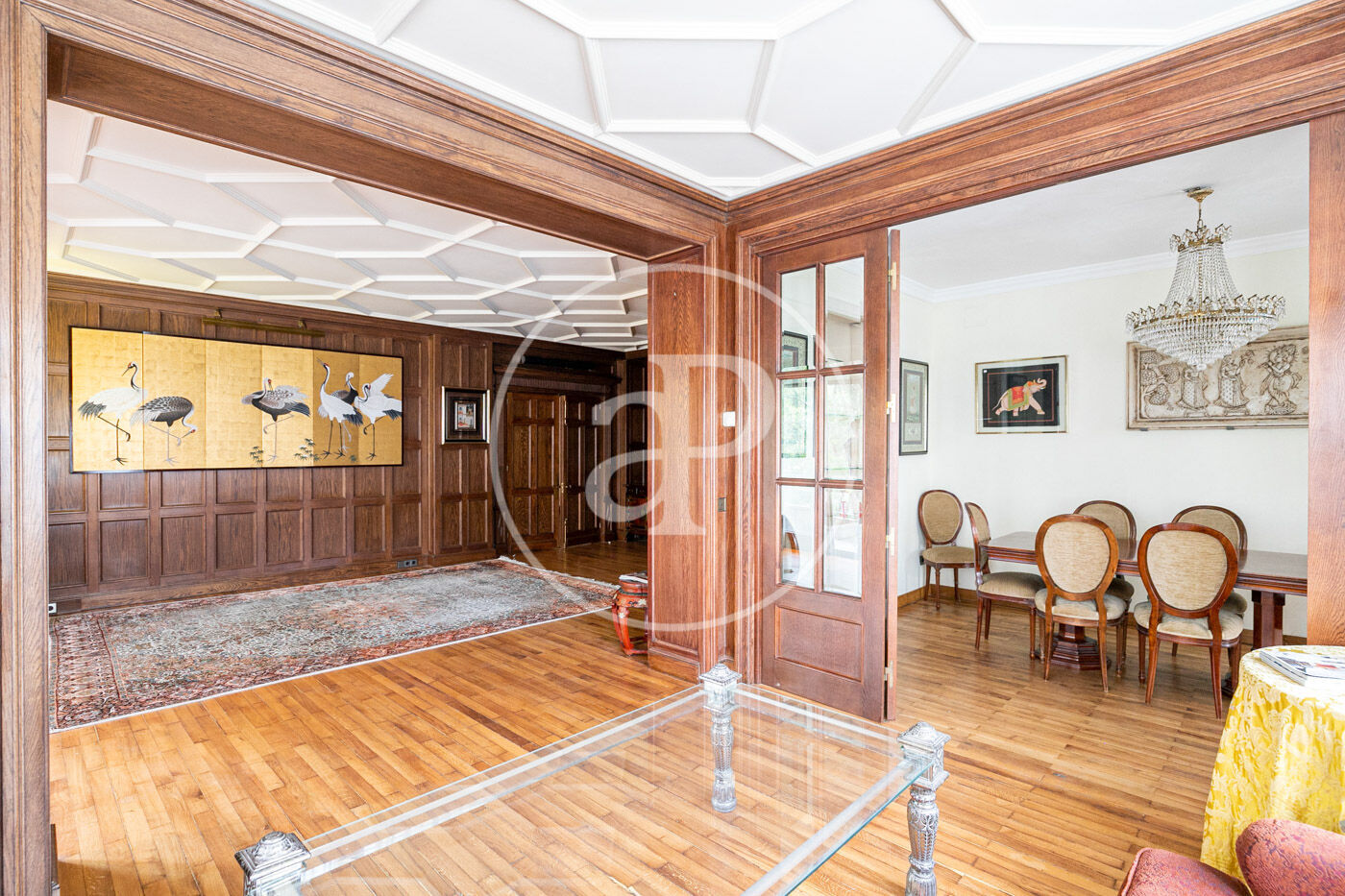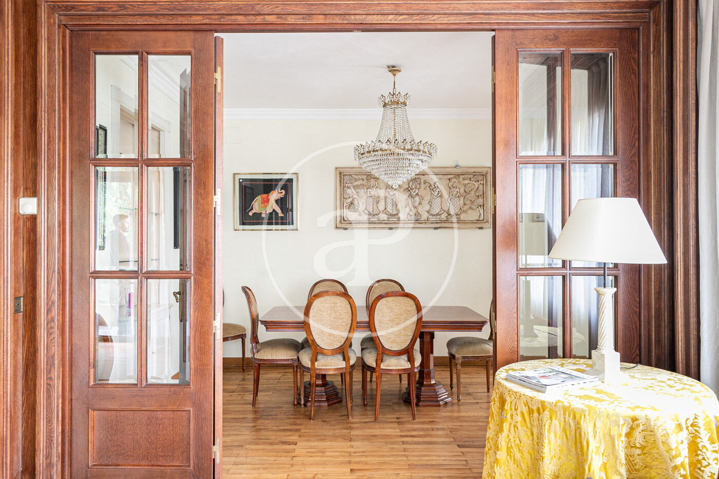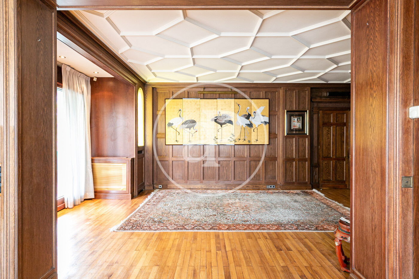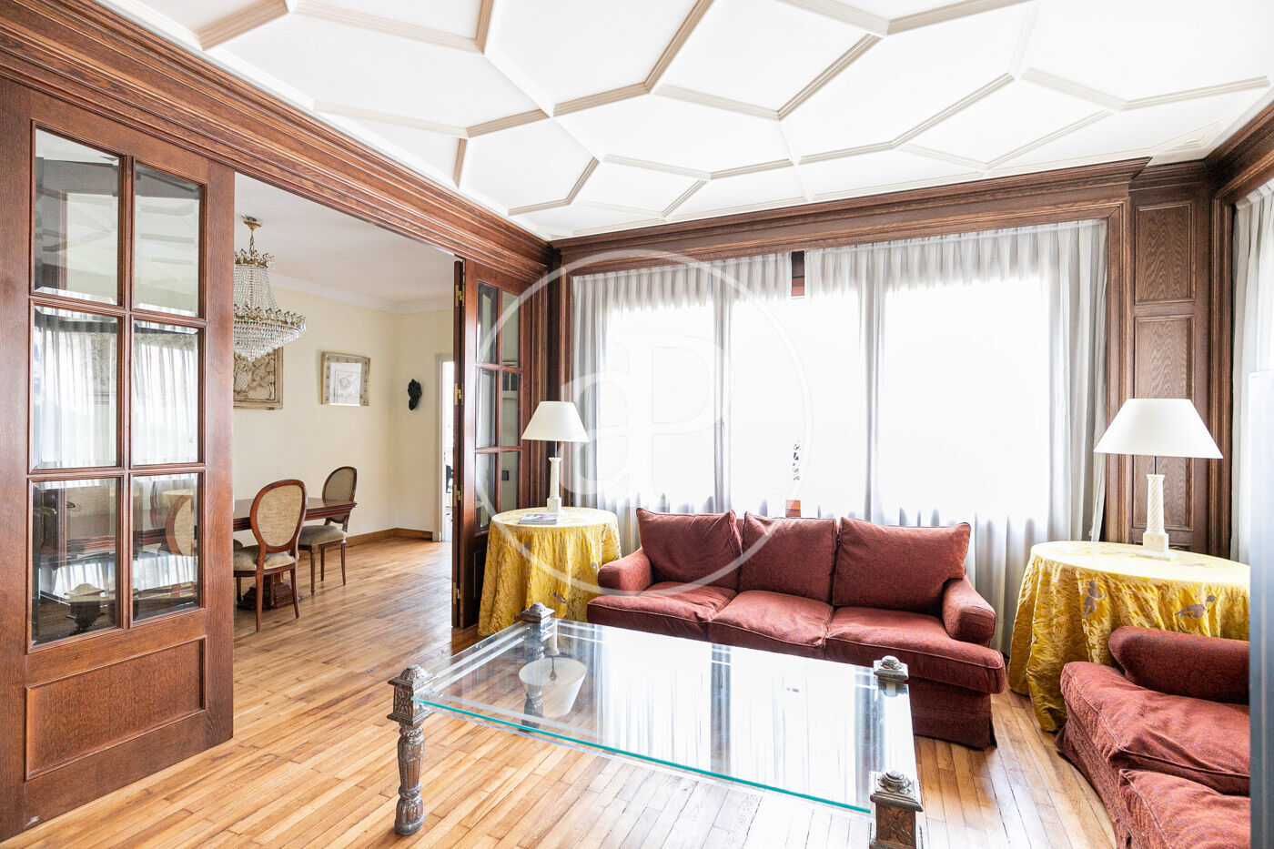 La vivienda con suelo de parquet, cuenta con un recibidor noble muy amplio que, a su vez, hace de distribuidor de la zona de día y la de noche. Esta primera, está distribuida en tres grandes estancias, todas muy acogedoras, decoradas con artesonados de yeso en el techo y paredes paneleadas de madera. Tanto el salón como la sala de estar son muy luminosos, gracias a sus grandes ventanales y tiene salida a una terraza de 24m2, muy disfrutable. El comedor, presidido por unas puertas de madera acristaladas abatibles, tiene acceso desde la sala de estar y comunica con la cocina a través del office de uso para el día a día familiar. La zona de servicio dispone de una habitación con baño completo y zona de aguas independiente. También hay un baño de invitados.