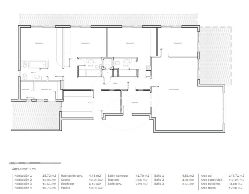 La zona de noche, a la que accedemos por un agradable pasillo y en el que hay ubicado un aseo de cortesía, utilizado como trastero, se compone de tres dormitorios dobles tipo suite, todos con armarios empotrados y salida a una segunda terraza de 19 m². La suite principal dispone de un cómodo vestidor y baño privado. En total, la vivienda ofrece cuatro dormitorios (incluyendo el de servicio) y cinco baños.