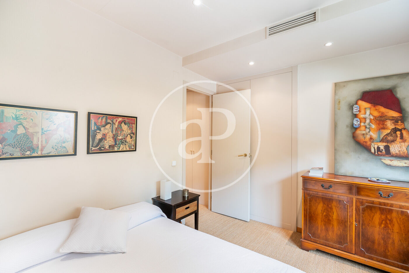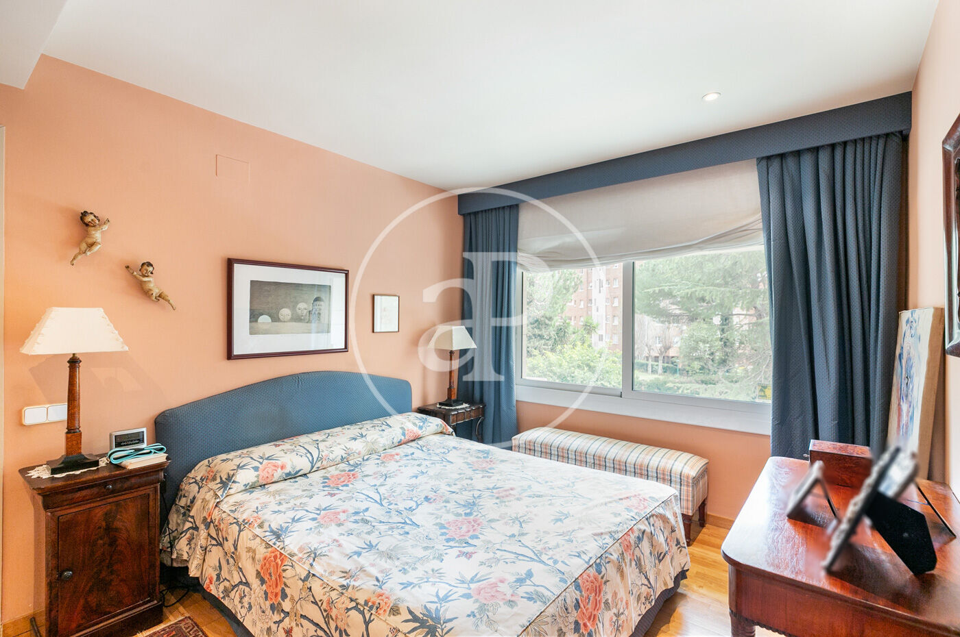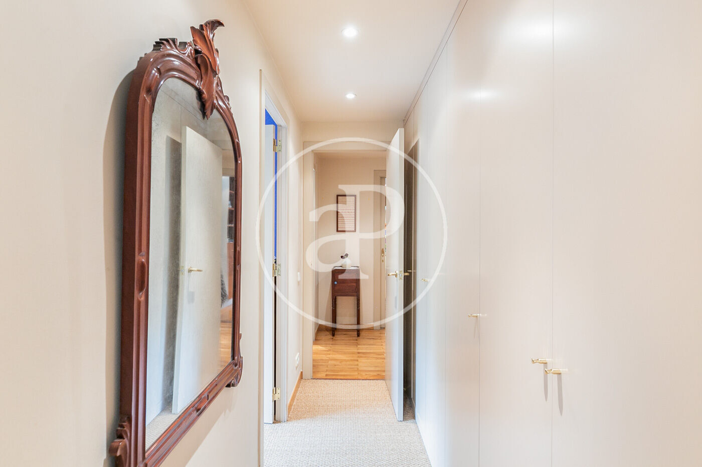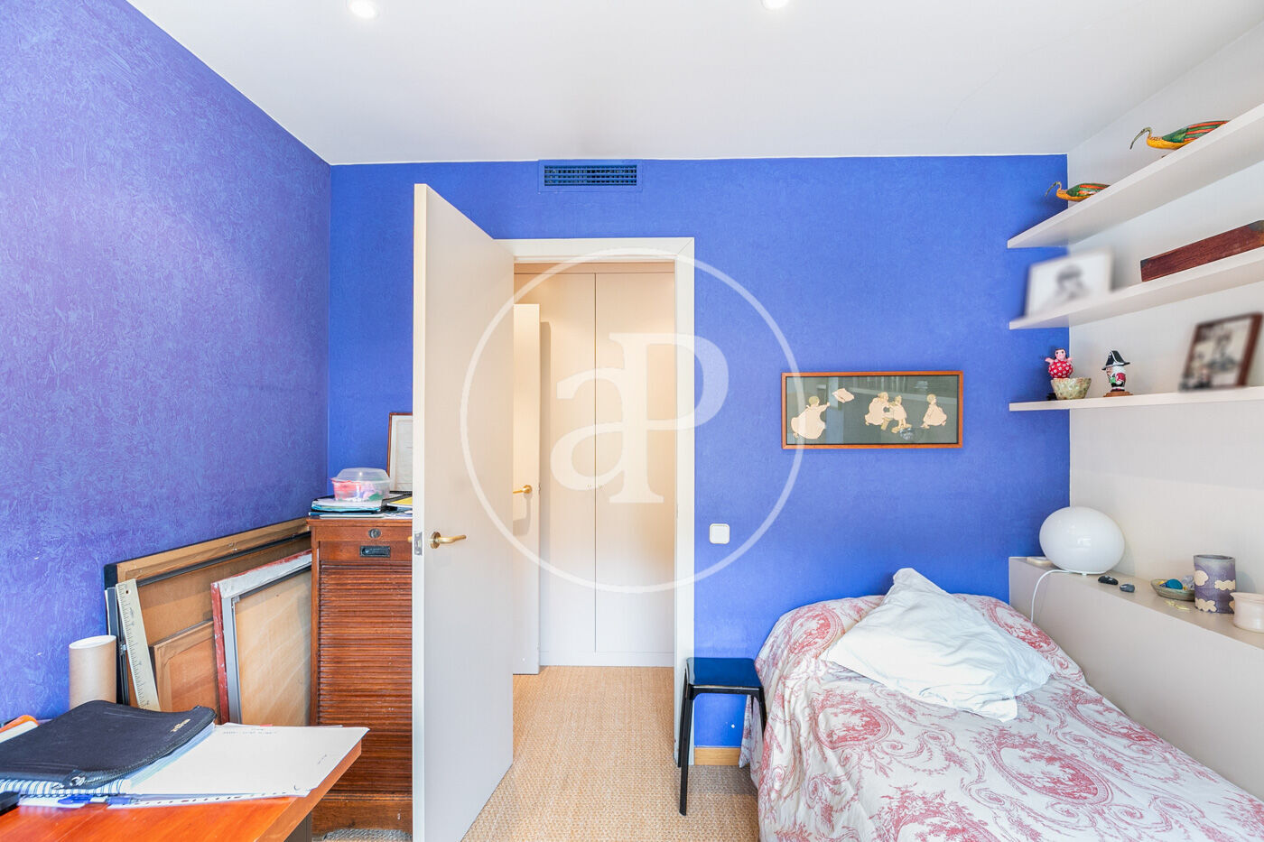 El piso de 185m², denota comodidad y elegancia en cada rincón, fue reformado en 1996, incluyendo la cocina, baños, instalaciones eléctricas, agua, calefacción y aire acondicionado por conductos, además de cerramientos con doble cristal y persianas de hierro de seguridad. Tiene tres entradas, puertas blindadas, dos ascensores, una escalera comunitaria y una entrada noble e independiente como si fuera un chalé privado que brinda intimidad al salón y un conveniente acceso directo a un agradable jardín comunitario.