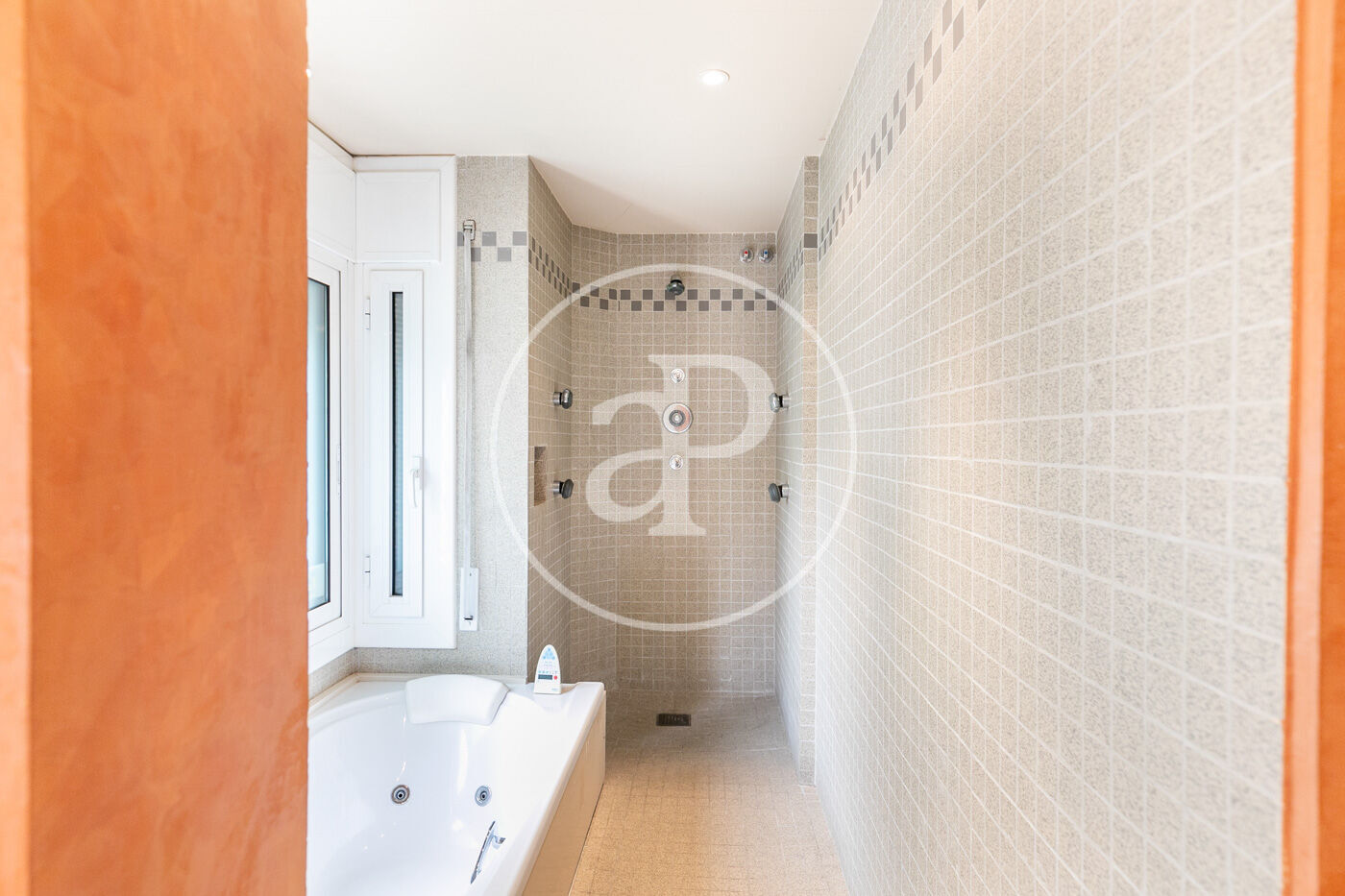 En el corazón de Sant Andreu encontramos esta espectacular vivienda familiar que puede ser también una buenísima oportunidad de inversión ya que dispone de licencia turística. La propiedad está ubica en la mejor zona del barrio de Sant Andreu de Palomar con vistas a su iglesia. Está distribuida en planta sótano, planta baja, dos plantas altas y una planta bajo cubierta, con unas dimensiones de 608 m2 construidos contando tanto la zona interior como la exterior. Al entrar en la vivienda nos encontramos con un distribuidor, el elevador del parking, un baño y la zona de día compuesta de una increíble cocina equipada con los mejores electrodomésticos, un salón/comedor con chimenea y una preciosa terraza con barbacoa, ideada para disfrutar de grandes momentos con amigos y familia. A la planta sótano se accede por la escalera interior o bien por elevador de coches dando acceso al parking con capacidad para 3 coches. También encontramos un aseo, un trastero y una zona de fiestas que da paso a la bodega. La casa está construida con los mejores materiales tanto interiores como exteriores, tiene ascensor para facilitar la movilidad entre las diferentes plantas, sistema de domótica, calefacción/aire acondicionado centralizado, y también cuenta con un sistema de música integrado. En su precio se incluye todo el mobiliario. En la primera planta su precioso distribuidor nos lleva a la suite con vestidor y baño, a los dos dormitorios dobles con un baño para compartir, y a la zona de lavado/planchado, así como al patio interior que es una gran vía de entrada de luz adicional a la casa. En la segunda planta se ubica una de las zonas más deseadas de la casa ya que cuenta con un espacio de gimnasio, con sauna y zona de aguas incluidas que permite cuidarse y relajarse al llegar a casa, además de 2 espacios muy versátiles por su gran amplitud y que podrían ser 2 dormitorios adicionales o bien equiparse como despacho o zona de cine, según las necesidades. Y finalmente en la planta cubierta encontramos la guinda del pastel, una increíble piscina y zona de solárium que completan esta inigualable vivienda.  El barrio de Sant Andreu de Palomar es un barrio histórico de la ciudad de Barcelona, único porque recuerda el pueblo que fue en su momento y que cuenta con unas increíbles infraestructuras y conexiones que lo hacen un lugar ideal para vivir.