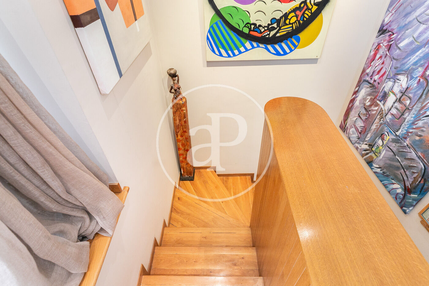 El salón comedor a dos niveles con grandes ventanales y una terraza de 10m² muy disfrutable con columnas estructurales a la vista, son elementos destacados que forman parte del diseño y resaltan su bella arquitectura. La cocina-office tiene una puerta basculante que conecta con el salón, está totalmente equipada y dispone de una galería de servicio exterior con un aseo.