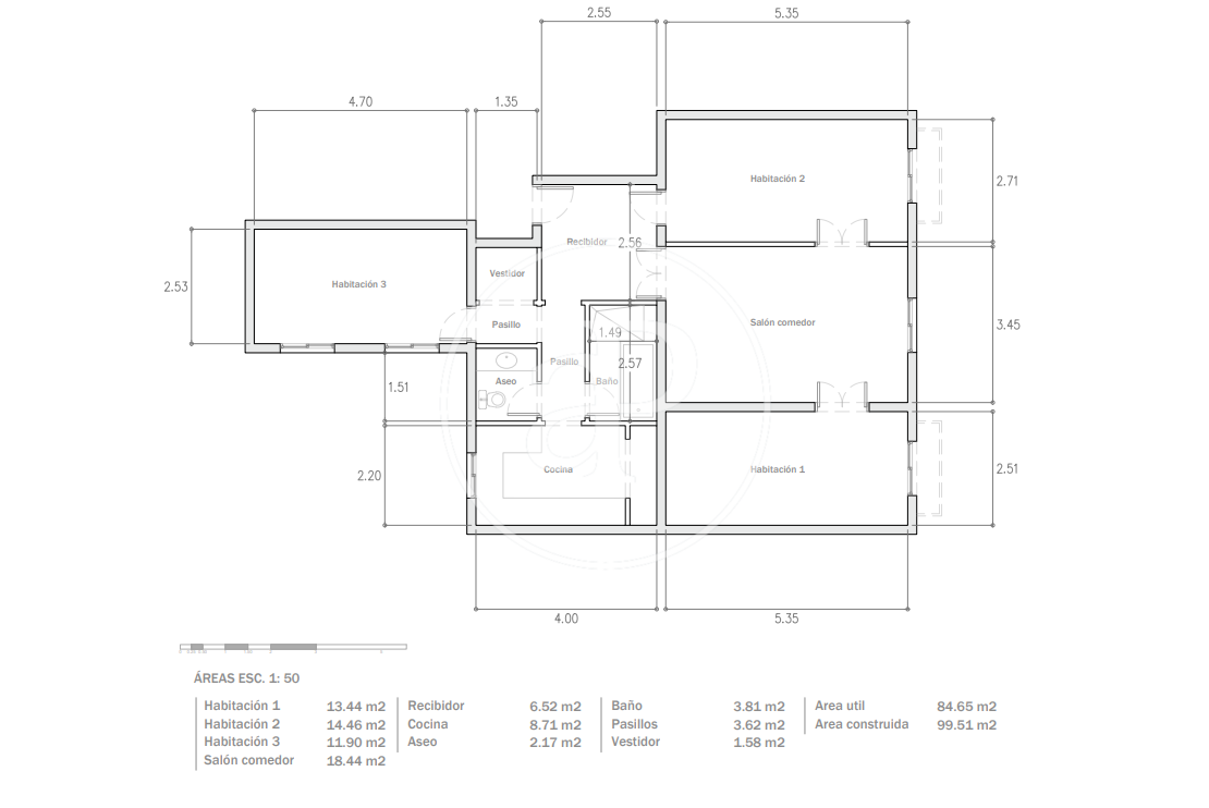 La superficie de la vivienda de 91m2 se distribuye de forma práctica y funcional, en un amplio vestíbulo de entrada, una cómoda sala de estar, una cocina independiente con dispensa, tres amplias habitaciones dobles, de las cuales dos con salida a balcón, un baño dividido en dos estancias, una con aseo y una con ducha y bañera y un cómodo vestidor.