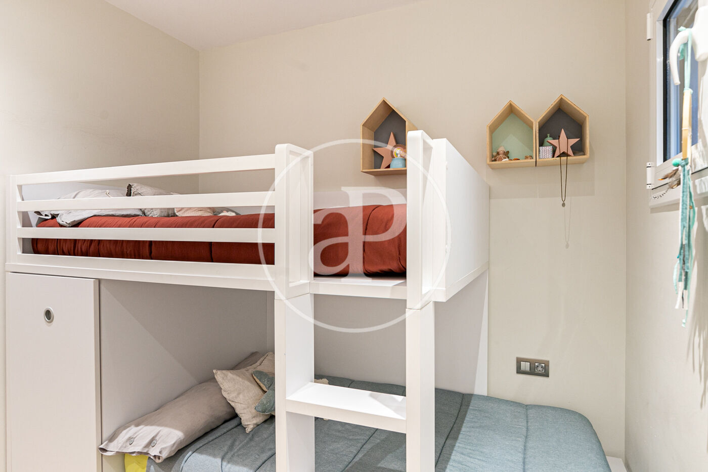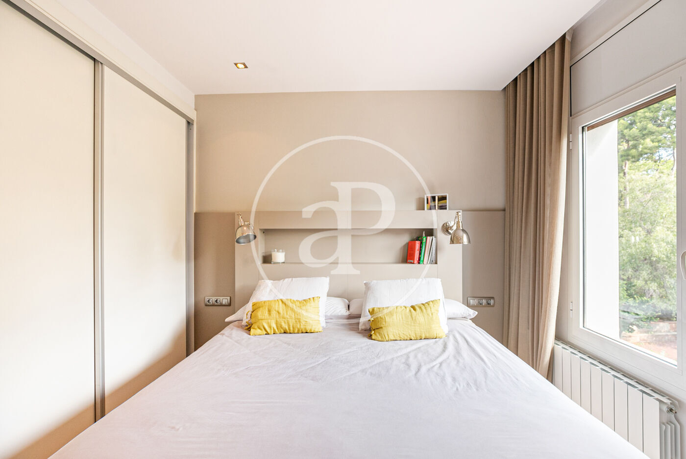 Cerca de los túneles de Vallvidriera a 10 minutos de Barcelona, encontramos esta espléndida adosada en el centro de Mirasol. Andando a un par de minutos encontrará la estación de Mirasol, el mercado, comercios y restauración, el colegio Catalunya, La Farga, el Casal de Mirasol y la futura piscina climatizada que terminará sus obras en menos de un año que os facilitará la vida creando un entorno ideal para la vida familiar. Los propietarios han invertido muchísimo tiempo y dinero en esta propiedad, otorgándole varios lujos muy poco comunes en este tipo de inmuebles. Comenzamos nuestra visita en esta casa de 273 mts² según catastro, tras atravesar el jardín. Solamente entrar, encontramos un recibidor con armarios hechos a medida, que nos conduce hacia los diferentes espacios comunes de esta casa, cocina comedor totalmente equipada, aseo de cortesía, salón comedor con chimenea a gas y una cristalera, también a medida, con puertas correderas de madera, cajones y la esquina acristalada. A pie de salón, está el jardín privado, con puerta directa a la comunidad con piscina y jardín donde disfrutar los veranos, que compartirá con tan sólo diez vecinos. En la primera planta, a la que se accede por una escalera con pared acristalada al salón, por lo cual la luz natural lo invade todo, llegamos a las dos habitaciones, el baño que comparten y la master suite, con vestidor y vistas al jardín. En la segunda planta, una habitación doble, con un salón privado, zona de trabajo, terraza y un baño completo con inesperado regalo de una sauna!! Bajando a la planta inferior, dos plazas de parking, un trastero, zona de lavandería con espacio de almacenaje y otra sorpresa más; una pequeña bodega con la temperatura  controlada. Todas las calidades de esta casa son premuim. Sistema de climatización frío calor, independiente en cada planta. Todos los muebles empotrados son de madera de sicomoro y mukari. Todas las aberturas con doble cristal y puente térmico. No dude en contactar con el equipo experto de aProperties Real Estate para la búsqueda de su nuevo hogar. Siempre cercanos, eficaces y profesionales en todo el proceso.