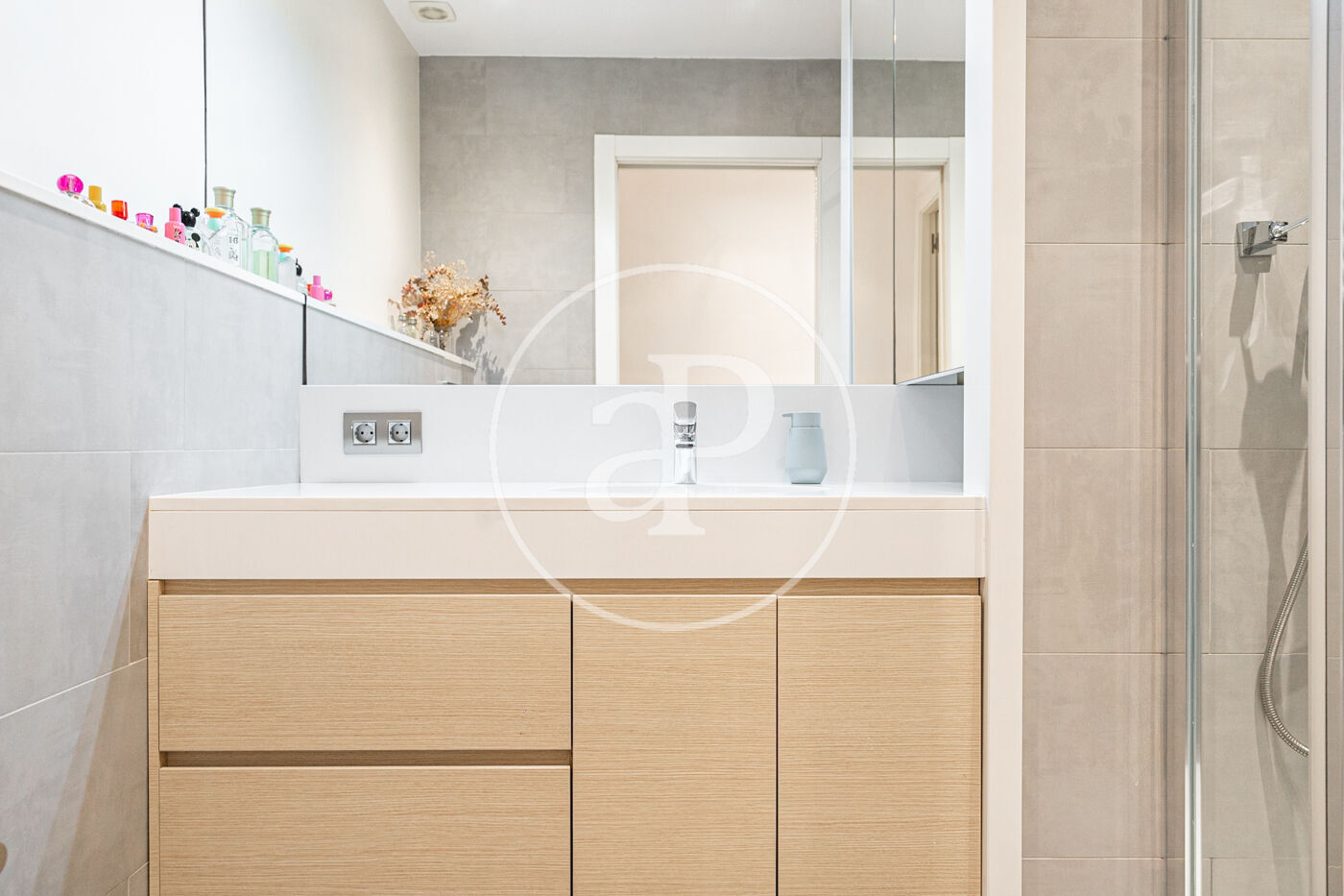 Este impresionante ático de 165 m² ha sido completamente reformado con un diseño de autor, combinando confort, sostenibilidad y tecnología. Equipado con placas solares, suelo radiante y semi-domótica, ofrece una experiencia única de habitabilidad. Distribución y espacios 3 dormitorios con amplios armarios empotrados. 3 baños de diseño con grifería Grohe y sanitarios Roca, incluyendo un en-suite con ducha doble, otro con bañera de hidromasaje y un tercero con ducha tradicional. 2 salones: el principal con cocina integrada y grandes ventanales de techo a suelo, y el secundario con chimenea tipo cassette y acceso directo a la terraza. Terraza ático con sistema de riego por goteo y ducha exterior, perfecta para relajarse al aire libre. Cocina totalmente equipada, integrada al salón principal y diseñada para disfrutar de la luz natural. Confort y tecnología Aire acondicionado por conductos y suelo radiante, garantizando el máximo confort térmico en cualquier época del año. Ventanas mecanizadas y video portero inteligente dentro de un sistema semi-domótico. Plaza de garaje con posibilidad de instalar un punto de recarga para vehículos eléctricos o híbridos enchufables (según disponibilidad). Trastero incluido para mayor almacenamiento. Ubicación privilegiada Situado en una zona tranquila con excelente comunicación y acceso rápido a la M-30, M-40, A-2 y el Aeropuerto. A pocos minutos a pie encontrarás: Metro y autobuses urbanos/interurbanos. Zonas verdes como el Parque Juan Carlos I, El Capricho y Juan Pablo II. Centros comerciales y servicios: Hipercor, El Corte Inglés, Mercadona, farmacias y tiendas de barrio. Hospitales y colegios públicos, privados e internacionales. Una vivienda única que combina diseño, sostenibilidad y ubicación inmejorable. Consulta disponibilidad y ven a visitarla. ¿Te imaginas vivir aquí?