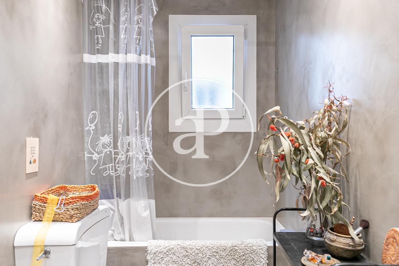 En un típica casa de 1958 de dos alturas, tan caracteristicas del Cabanyal, se encuentra este moderno y clásico dúplex de 151 m² de vivienda y terraza de 60 m². Está situado muy cerca de la playa de la Malvarrosa, en una zona muy tradicional del barrio y recae en dos calles disfrutando así de orientación este y oeste al mismo tiempo. Consta de dos alturas: La planta de abajo, a la que se accede a través de una escalera desde la calle se distribuye en un amplio salón con cocina integrada completamente equipada en la zona oeste, mientras que en la otra parte se encuentra un dormitorio auxiliar, la escalera que arranca desde el recibidor y el dormitorio principal con cuarto de baño en suite, vestidor y amplias estancias y ventanales. En la planta de arriba se encuentra una sala diafana desde la que se accede a un dormitorio muy amplio en buhardilla, un cuarto de baño completo con ducha, un cuarto de lavanderia y una terraza de 60 m² perfecta para ser disfrutada durante todo el año.  Esta magnífica vivienda cuenta con aire acondicionado, calefacción, suelo original de mosaico y parquet según que zonas y un estilo que combina clásico y moderno con mucho cuidado y gusto.  En cuanto a la zona, la vivienda se halla próxima a estaciones de servicio de transporte público ( EMT, tranvía e incluso tren ) y cercana al mar. Si estás interesado en esta vivienda, ¡ no dudes en ponerte en contacto con nosotros !