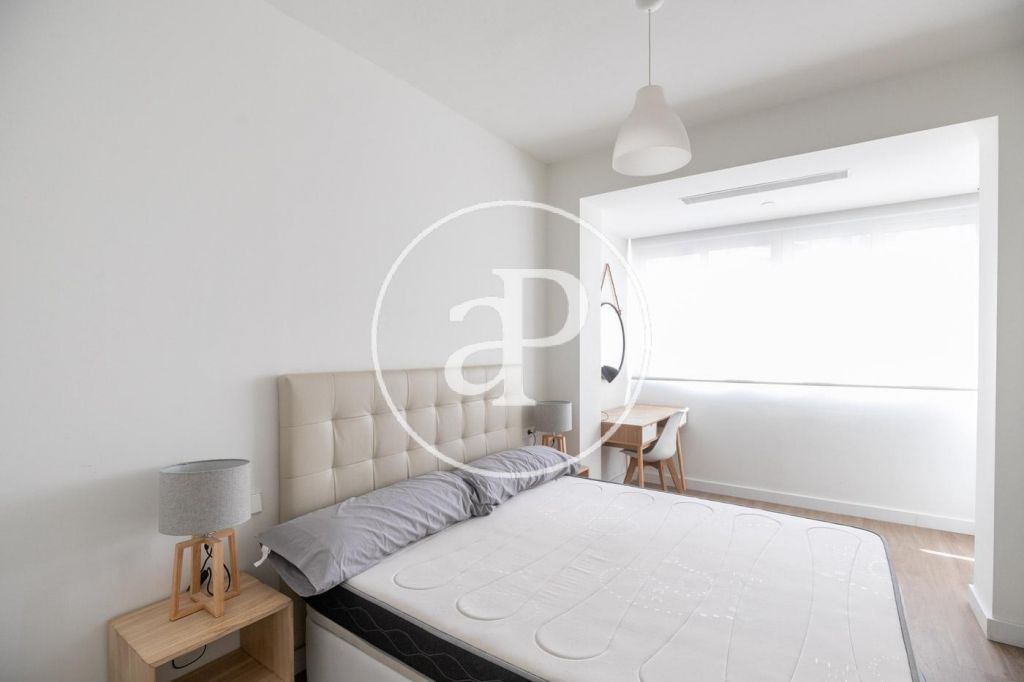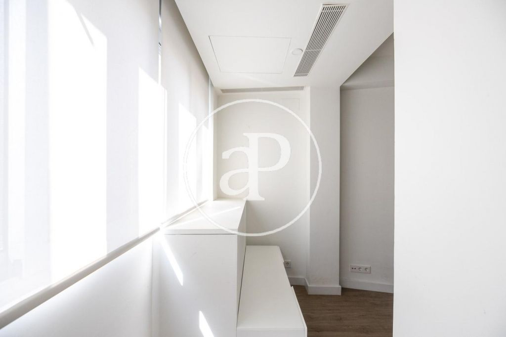 El ático consta de 135m² construidos repartidos en dos habitaciones, dos baños, un aseo, cocina y salón-comedor. Desde la entrada accedemos por un pasillo con armarios empotrados de gran capacidad y con caja fuerte; seguidamente encontramos la cocina tipo office equipada con todos los electrodomésticos de primeras marcas. La cocina está completamente panelada con mobiliario en blanco al igual que la encimera con un diseño exquisito; además tiene una zona de comedor con una mesa de cristal para hasta cuatro comensales. A mano izquierda queda el aseo de cortesía de invitados. El salón es muy amplio y luminoso gracias a sus grandes ventanales con vistas a un amplio patio interior que además gracias a encontrarse en una sexta planta goza de unas maravillosas vistas de la ciudad. El salón tiene un gran sofá de ocho plazas, una mesa de cristal con un gran diseño y una televisión de pantalla plana. En el salón se encuentra una bonita escalera de caracol en blanco que da acceso a una de las habitaciones con cama doble, armarios empotrados y su propio baño en suite con ducha. Por último la segunda habitación se encuentra cercana a la puerta de entrada también con cama doble, armarios empotrados y su propio baño en suite con ducha. El ático goza de grandes calidades en sus acabados como lo es el suelo de madera natural, ventanas con rotura del puente térmico, aire acondicionado por conductos y calefacción individual de gas natural. El edificio cuenta con conserje, ascensor, gimnasio y trasteros; también cabe la posibilidad de alquilar una plaza de garaje por 165 € adicionales. El ático se encuentra ubicado en el barrio de Almagro en la calle Génova n.º 5 en un edificio completamente clásico con una rehabilitación integral; estando muy cercano de la Plaza de Colón, el barrio de Chueca-justicia y rodeado de multitud de comercios y zonas de restauración. El precio publicado corresponde a una estancia mínima de 12 meses. El precio incluye: Electricidad (hasta € 150 / mes), Gas (hasta € 150 / mes) y agua, Internet y TV de alta velocidad e Impuestos. DISPONIBLE DESDE EL 10 DE JUNIO.