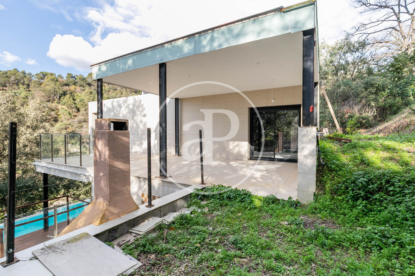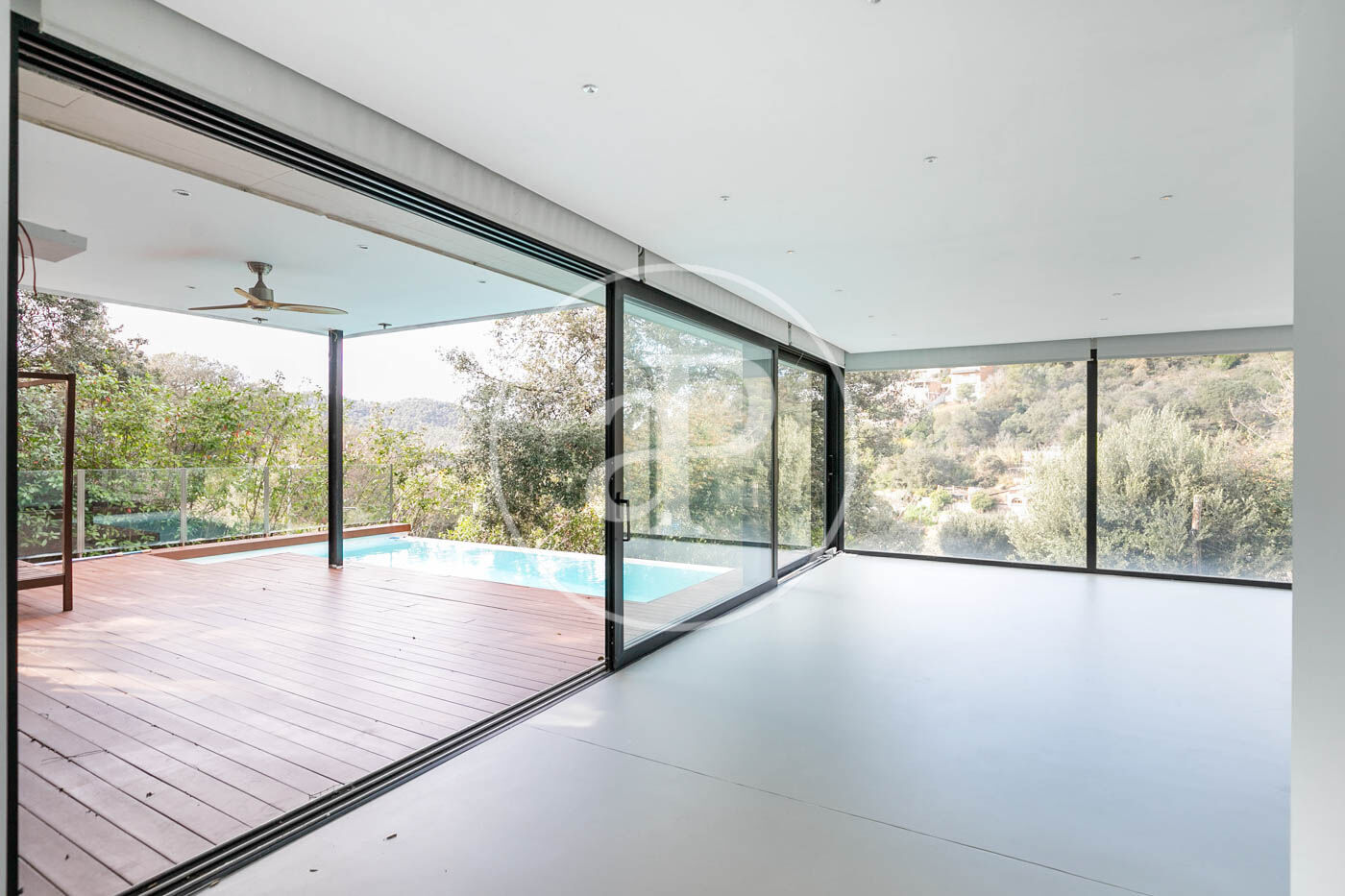 A la vivienda se accede por la parte de abajo, nada más entrar encontrados un gran recibidor, con armario para dejar chaquetas, cascos de motos y lo que se precise, un gran espacio de almacenamiento con su propia puerta también está ubicado el garaje, para un coche, motos, bicis etc., y el ascensor que nos lleva a las siguientes plantas. La planta una, tiene un dormitorio y anexo una sala polivalente, este dormitorio tiene acceso a una preciosa terraza que nos permite ver las vistas tan impresionantes que tiene. En la segunda planta ,tenemos el salón comedor, con la cocina abierta, toda esta planta está rodeada de cristaleras que permite que la luz entre por cada rincón, y la naturaleza se meta dentro de la casa , desde esta planta se accede a un precioso porche con madera de teka , una piscina preciosa desbordante, el jardín consta de tres niveles, uno donde está la zona de porche piscina y barbacoa ,el otro un nivel más arriba con mucho jardín en la parte trasera de la casa y en el nivel más bajo un pequeño jardín, debajo de la piscina y en la entrada de la casa.