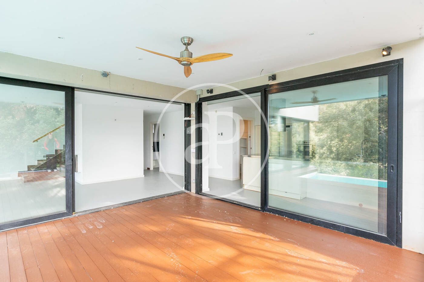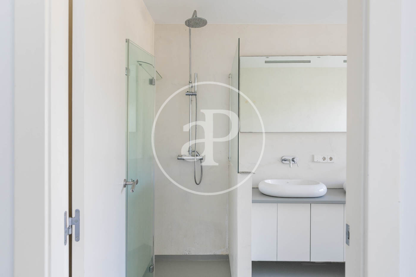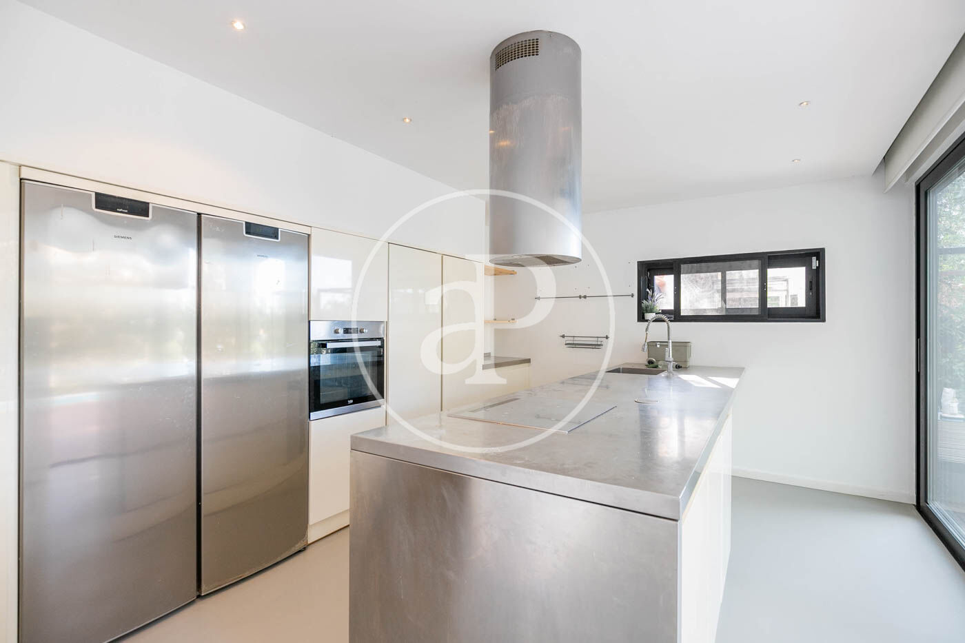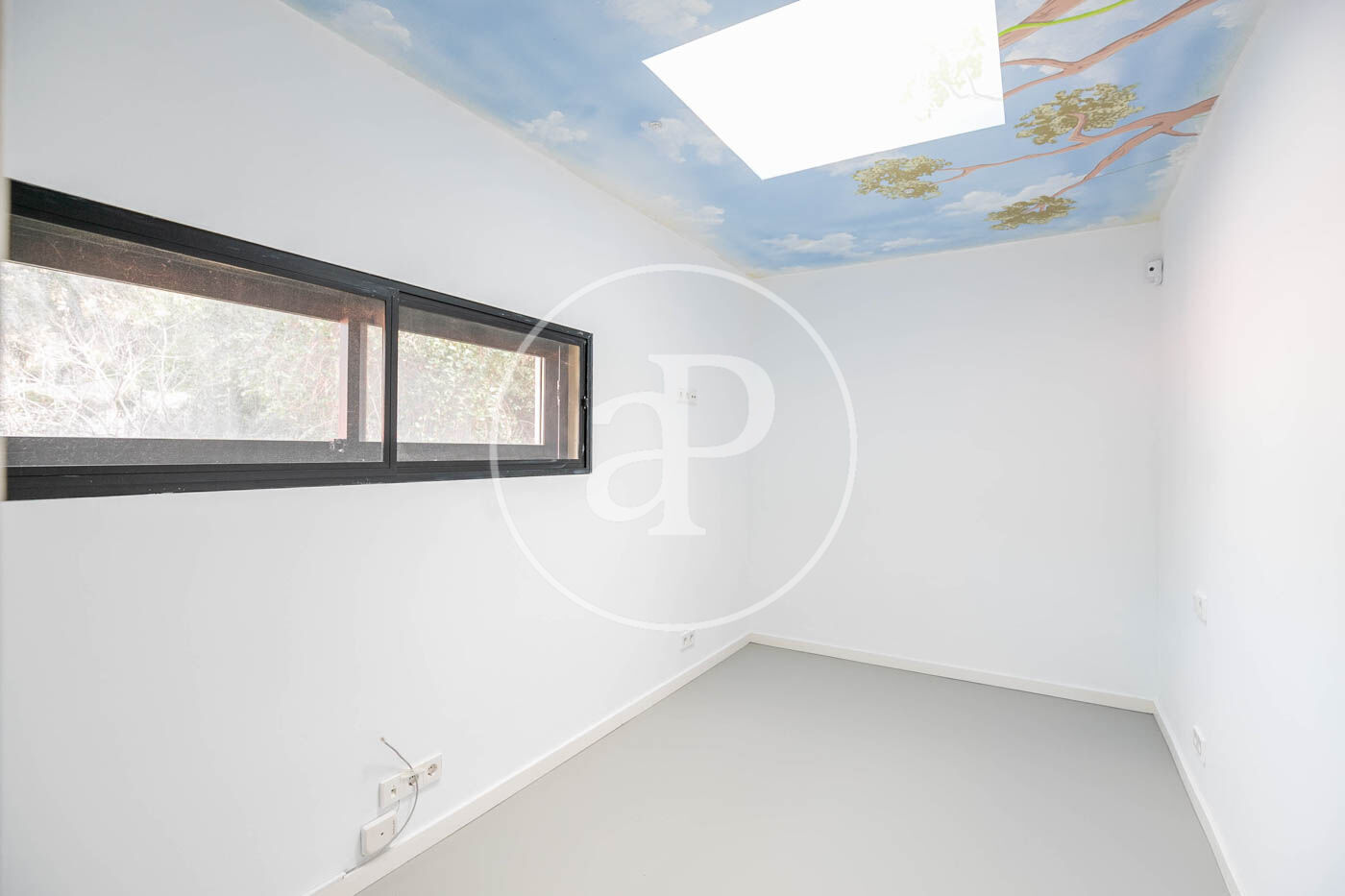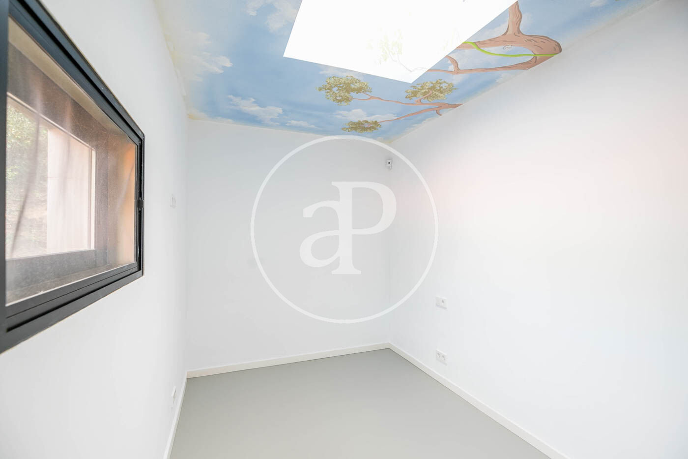 Se trata de una maravilla casa, en un enclave único en las planas de Valvidriera, a escasos metros de los ferrocarriles, a unos cinco minutos caminando, para acudir a Barcelona ciudad, la parada es la estación Baixador de Valvidriera, para llegar a Sarria sólo hay una parada intermedia, Peu del funicular, este mismo tren pasa por Gracia, Plaza Cataluña y en la otra dirección a San Cugat a 25 minutos, o sea está muy bien comunicada. La casa consta de cuatro dormitorios, un quinto polivalente y tres baños, distribuidos en tres plantas, cabe destacar la luz, es la gran protagonista de esta casa.