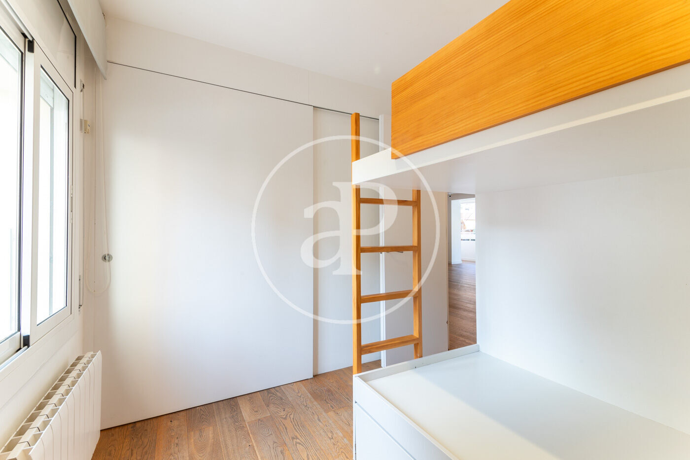 Tiene 3 habitaciones, la master suite doble, con luz natural y armarios empotrados y dos habitaciones, una individual grande con literas y luz natural y otra individual con armarios tipo oficina, que comparten un baño con bañera.