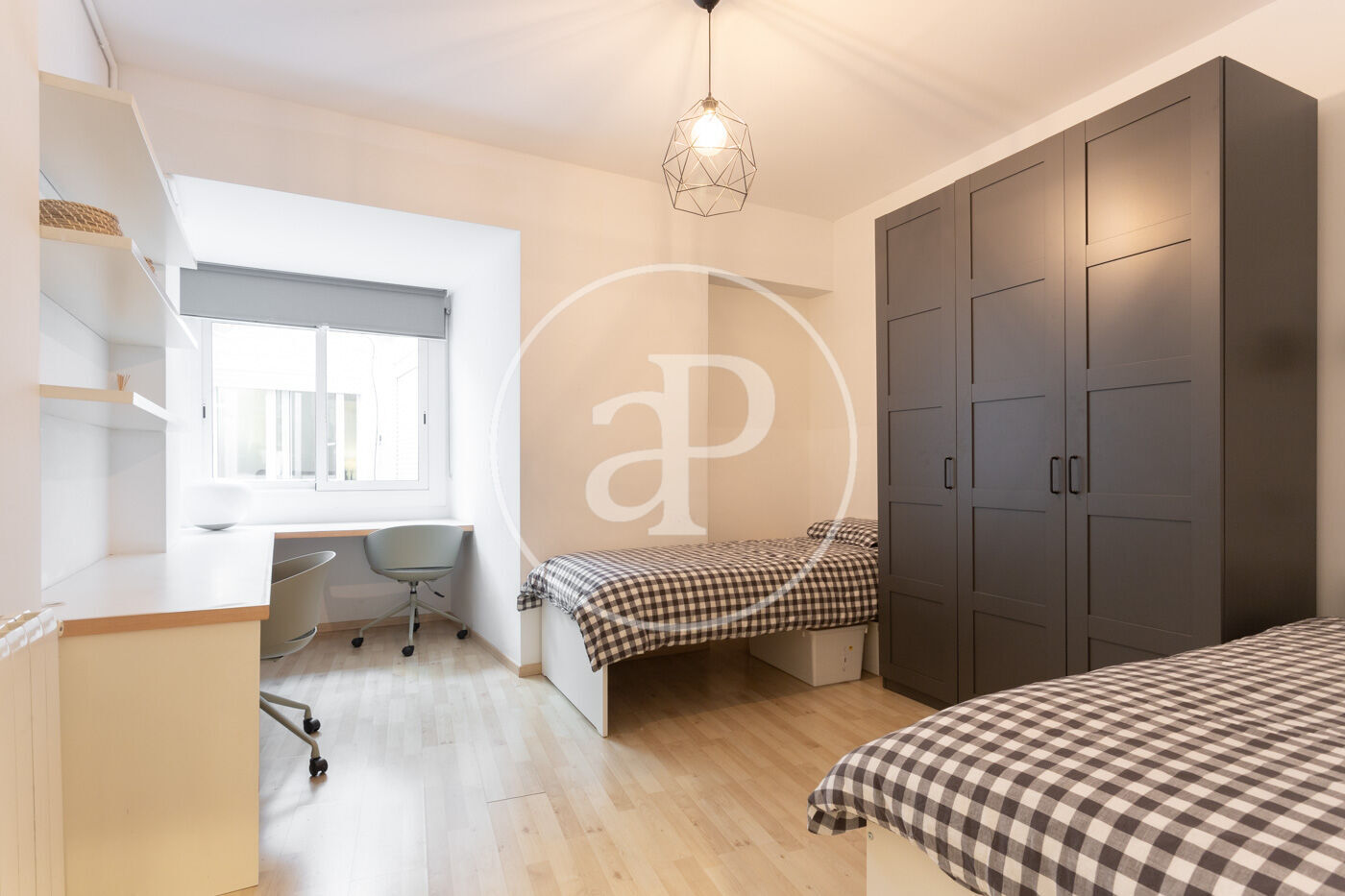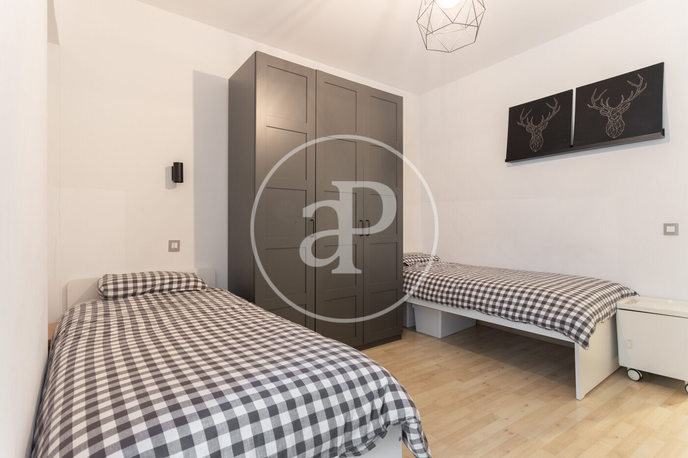 Piso amueblado en un edificio modernista de la Vila de Gràcia, catalogado por patrimonio. Se encuentra en calle muy tranquila, en una zona muy bien comunicada, con todo tipo de accesos al transporte público, rodeada de comercios. El piso se encuentra en la entreplanta del edificio, con una superficie de 150m2 más 50 m2 de un jardín privado muy disfrutable. El piso se distribuye en una zona de día con un amplio y luminoso salón-comedor, con techos artesonados y pintados a mano que tiene vistas al jardín, y con una cocina independiente y luminosa, totalmente equipada con electrodomésticos de alta gama y con vistas directas y acceso al jardín. En la zona de noche el piso tiene cuatro habitaciones y un vestidor. La habitación principal es amplia y exterior con un techo artesonado y pintado a mano. El amplio baño, con un techo artesonado y pintado a mano, queda contiguo y dispone de instalaciones nuevas. Esta zona tiene además dos habitaciones, una con amplias y cómodas literas y otra con una cama doble, ambas con armarios que comparten un baño completo con instalaciones nuevas. Dispone también de una habitación destinada a despacho y otra habitación amplia de uso como vestidor con armarios de suelo a techo de madera. En el pasillo de acceso a la zona de noche hay techos artesonados pintados a mano y una gran cristalera de colores típica del modernismo. A través de una de las habitaciones se accede a una planta inferior que tiene un uso como sala polivalente. Todo el piso dispone de suelo de parquet nuevo, calefacción radial y aire acondicionado por split en el salón. Es un piso muy exclusivo para aquellas personas que valoren el encanto de vivir en una casa modernista con jardín, dentro de una zona tranquila y bien comunicada. El alquiler incluye gastos de comunidad, IBI, servicios de limpieza (a convenir días) y servicio de mantenimiento de jardinería. No se admiten mascotas. La finalidad del contrato es temporal. La realidad del mobiliario puede no corresponder exactamente con las fotografías mostradas en este anuncio.* En cumplimiento de la Ley 12/2023 y la Llei 18/2007 informamos que:Índice de R.P.LL: 15,00 € / m2 Precio de referencia estatal 1.857,00 €