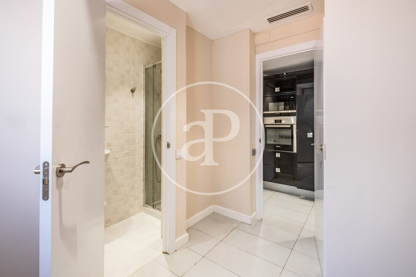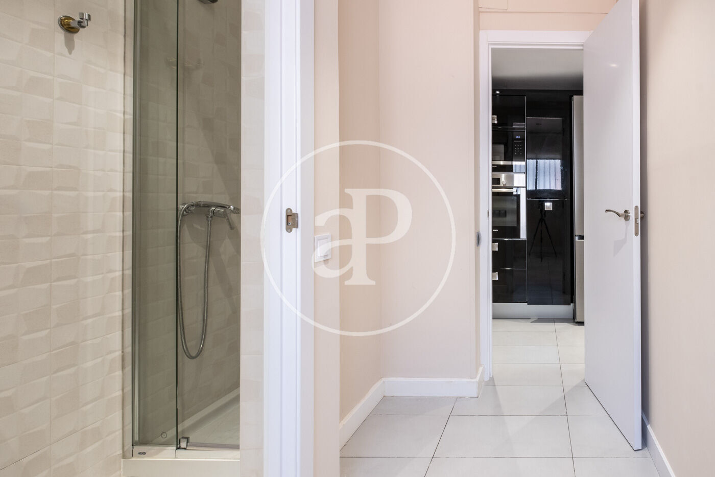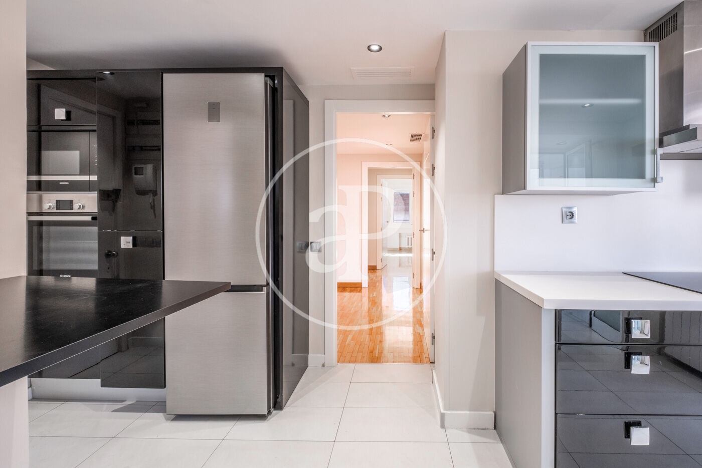 El salón-comedor, con vistas al jardín y piscina comunitaria, es amplio y soleado, lo que lo hace perfecto para disfrutar de agradables momentos en familia o con amigos. La cocina-office está equipada con electrodomésticos de alta gama y tiene acceso a la zona de aguas. Además, cuenta con habitación de servicio con su baño con ducha y entrada independiente de servicio.