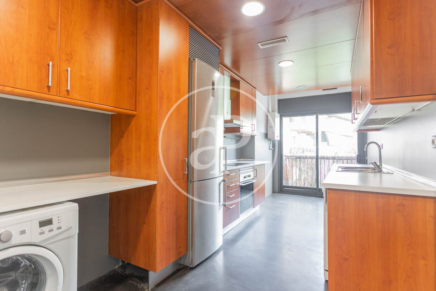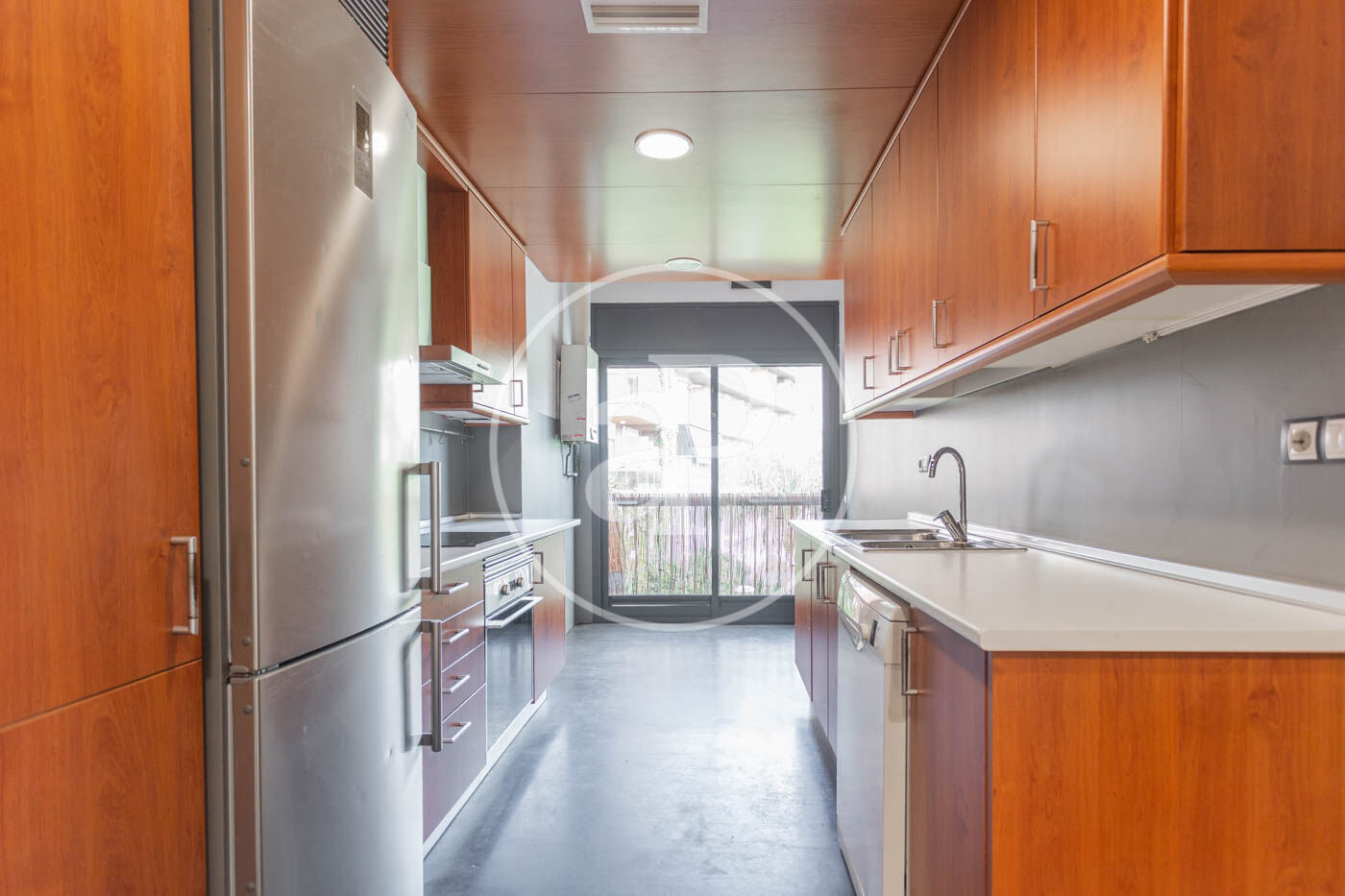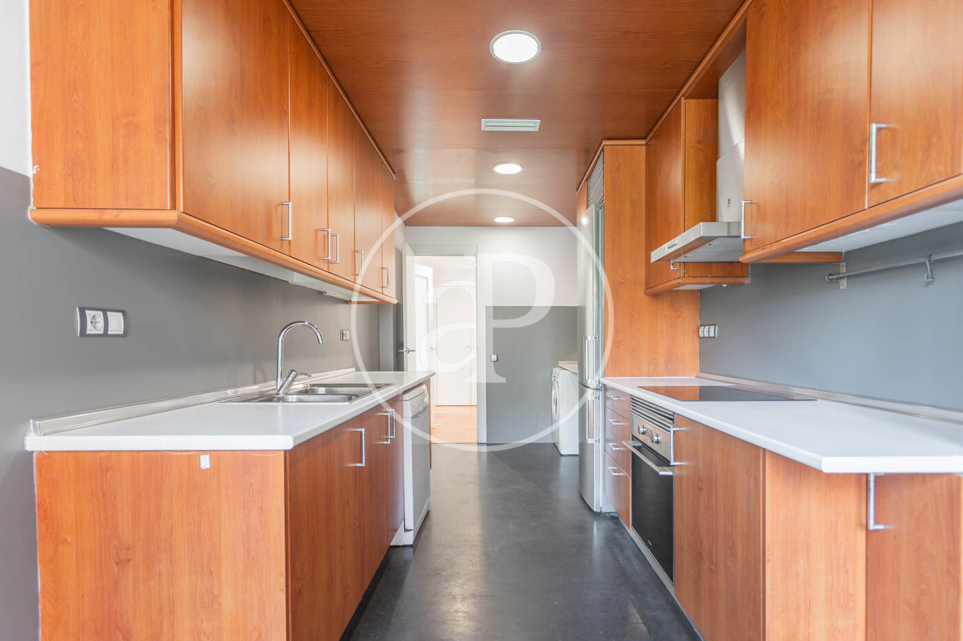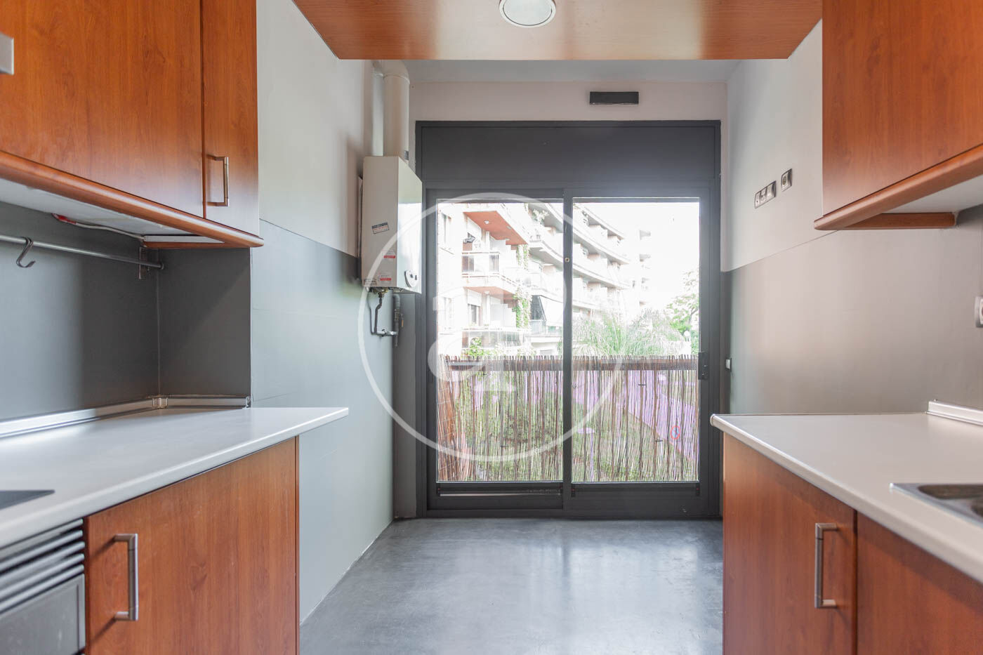 En la zona de día, tenemos un salón-comedor con un bonito balcón que da a la calle Esteve Terradas, lo que aporta una gran luminosidad a esta estancia. La cocina, totalmente equipada, da lugar a un lavadero, por donde entra mucha luz.