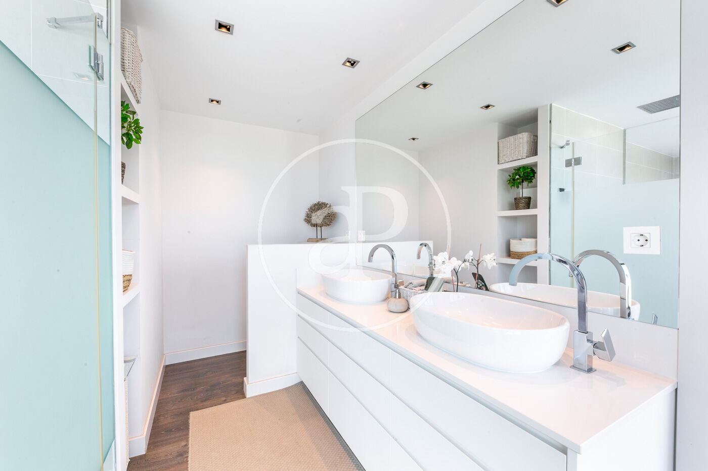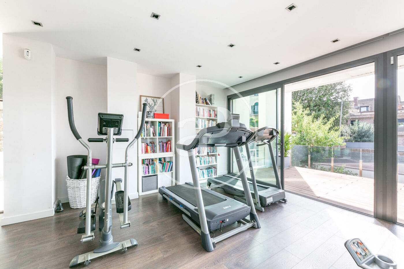 PLANTA 1 – 90m2 – cuenta con tres habitaciones dobles, con vestidor. Estas habitaciones comparten un gran baño con tres lavamanos, bañera, dos wc y ducha con iluminación a través de claraboya. Zona de gimnasio y solarium.