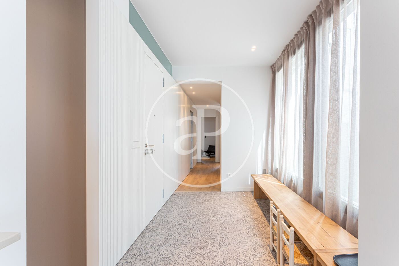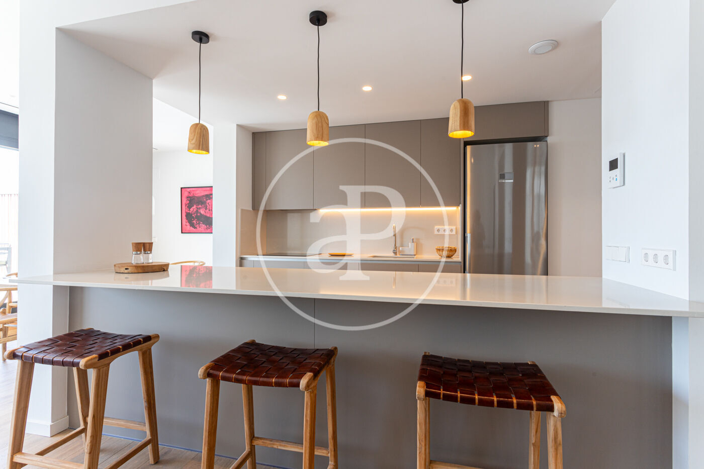 Exclusivo piso amueblado de 125m2 que se distribuye en un amplio salón-comedor, con techos abuhardillados pero altos, y con sofá de tres plazas, sillón y SmartTV. La zona de comedor tiene capacidad para hasta 8 comensales. La cocina, en concepto abierto, está totalmente equipada con electrodomésticos nuevos. Toda la zona está muy iluminada gracias a una ventana exterior. El espacio está muy bien aprovechado y tiene una buena circulación salón-comedor-cocina. El distribuidor lleva a un baño completo, la habitación principal, con cama doble y baño completo en suite, y la segunda habitación doble con dos camas individuales. La tercera habitación/estudio se compone de una cama individual, armarios empotrados y una zona de trabajo. Este apartamento cuenta con sistema de aire acondicionado frio/caliente por conductos y calefacción por radiadores. La finca cuenta con ascensor. El tiempo mínimo de alquiler es de 1 mes. Los gastos, suministros e Internet de alta velocidad están incluidos en el precio (agua, luz y gas hasta 200€). El piso se entrega tal cual en las fotos, totalmente decorado y equipado con ropa de cama y toallas. Se hará entrega antes o a su llegada al apartamento de un depósito de seguridad de dos meses, el cual le será reembolsado 7 días después de su salida, siempre que el apartamento no presente desperfectos. ¿Te imaginas vivir aquí?