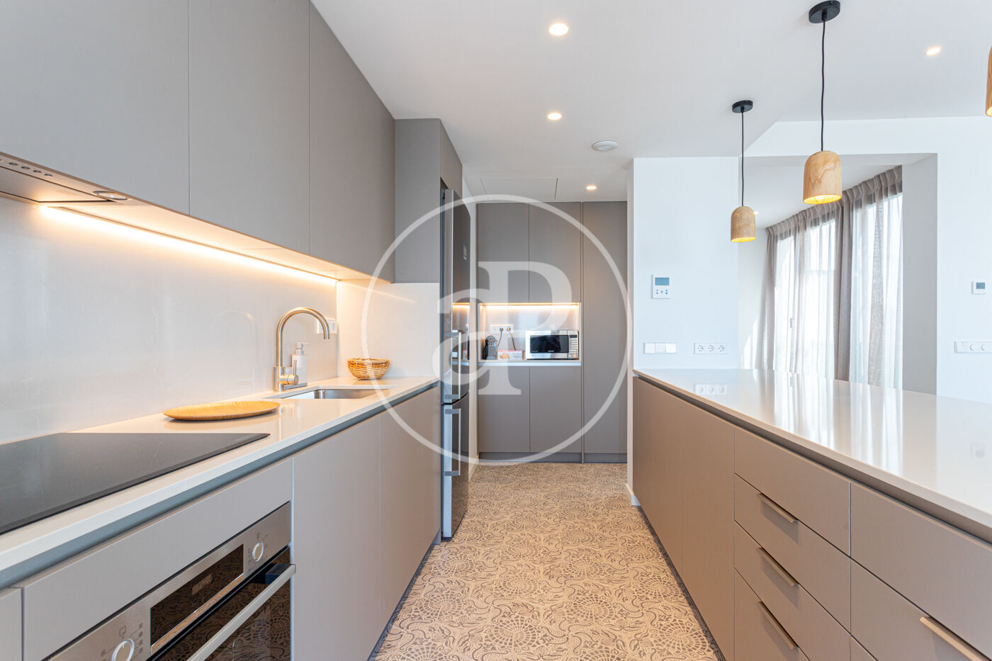 En la zona de día nos encontramos con un amplio salón comedor con salida a una gran terraza y con vistas espectaculares a toda la ciudad; una cocina de diseño abierta equipada con todos los electrodomésticos necesarios de alta gama hasta incluso el pequeño menaje. La zona de noche está muy bien diferenciada de la zona de día y consta de 3 habitaciones dobles: una de ellas en suite, otra habitación doble con una acogedora terraza, ambas con vistas, y una tercera habitación que pueda utilizarse también como despacho.
