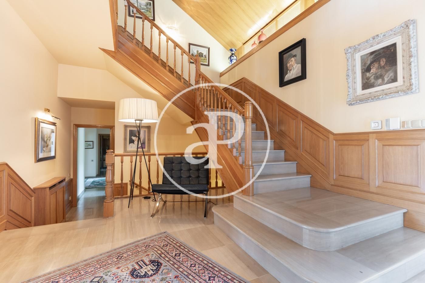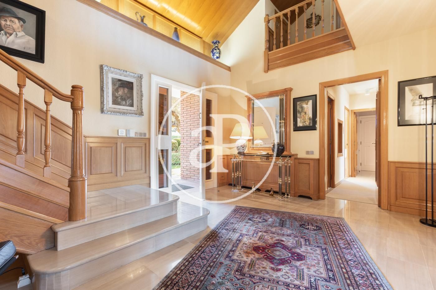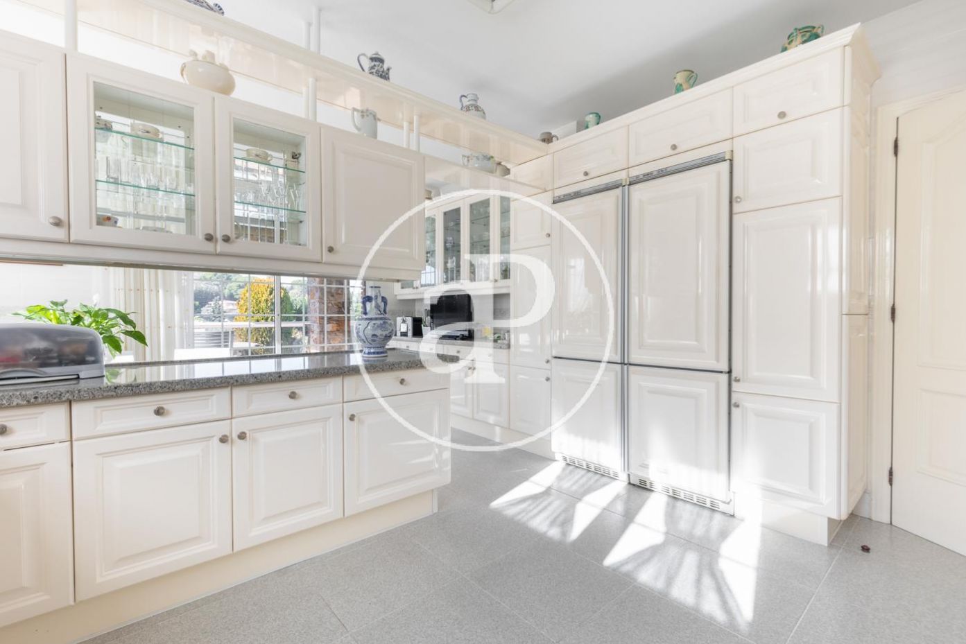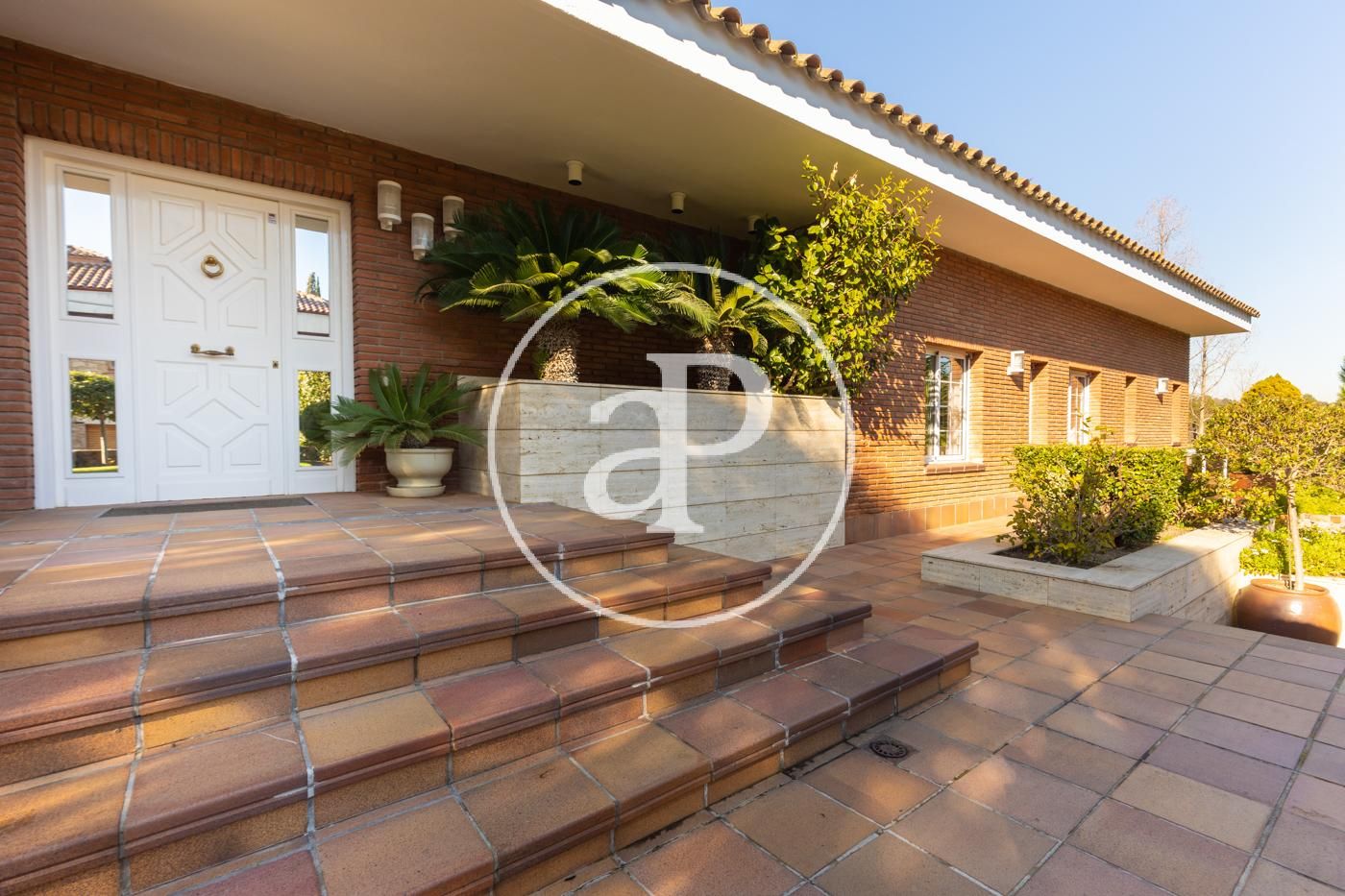 Planta baja: gran recibidor de alto techo que da paso, al frente, al gran salón comedor con chimenea, vistas y acceso directo a amplio porche, jardín y piscina. El comedor comunica con la elegante y muy luminosa cocina con su propio acceso al porche y jardín. A la derecha del recibidor, bajando 4 escaleras, encontramos la zona de noche con máster suite, su propio vestidor y baño, más 3 habitaciones y 2 baños. A la izquierda del recibidor encontramos un baño completo, otra habitación y al lado de la cocina la lavandería con puerta de salida al jardín.