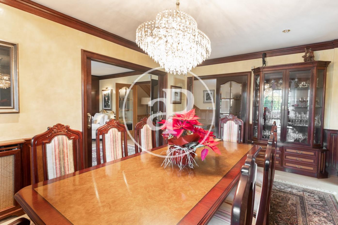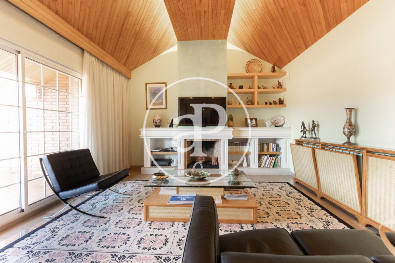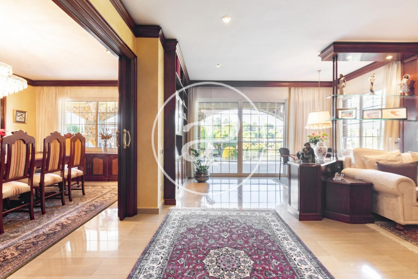 Planta baja: gran recibidor de alto techo que da paso, al frente, al gran salón comedor con chimenea, vistas y acceso directo a amplio porche, jardín y piscina. El comedor comunica con la elegante y muy luminosa cocina con su propio acceso al porche y jardín. A la derecha del recibidor, bajando 4 escaleras, encontramos la zona de noche con máster suite, su propio vestidor y baño, más 3 habitaciones y 2 baños. A la izquierda del recibidor encontramos un baño completo, otra habitación y al lado de la cocina la lavandería con puerta de salida al jardín.