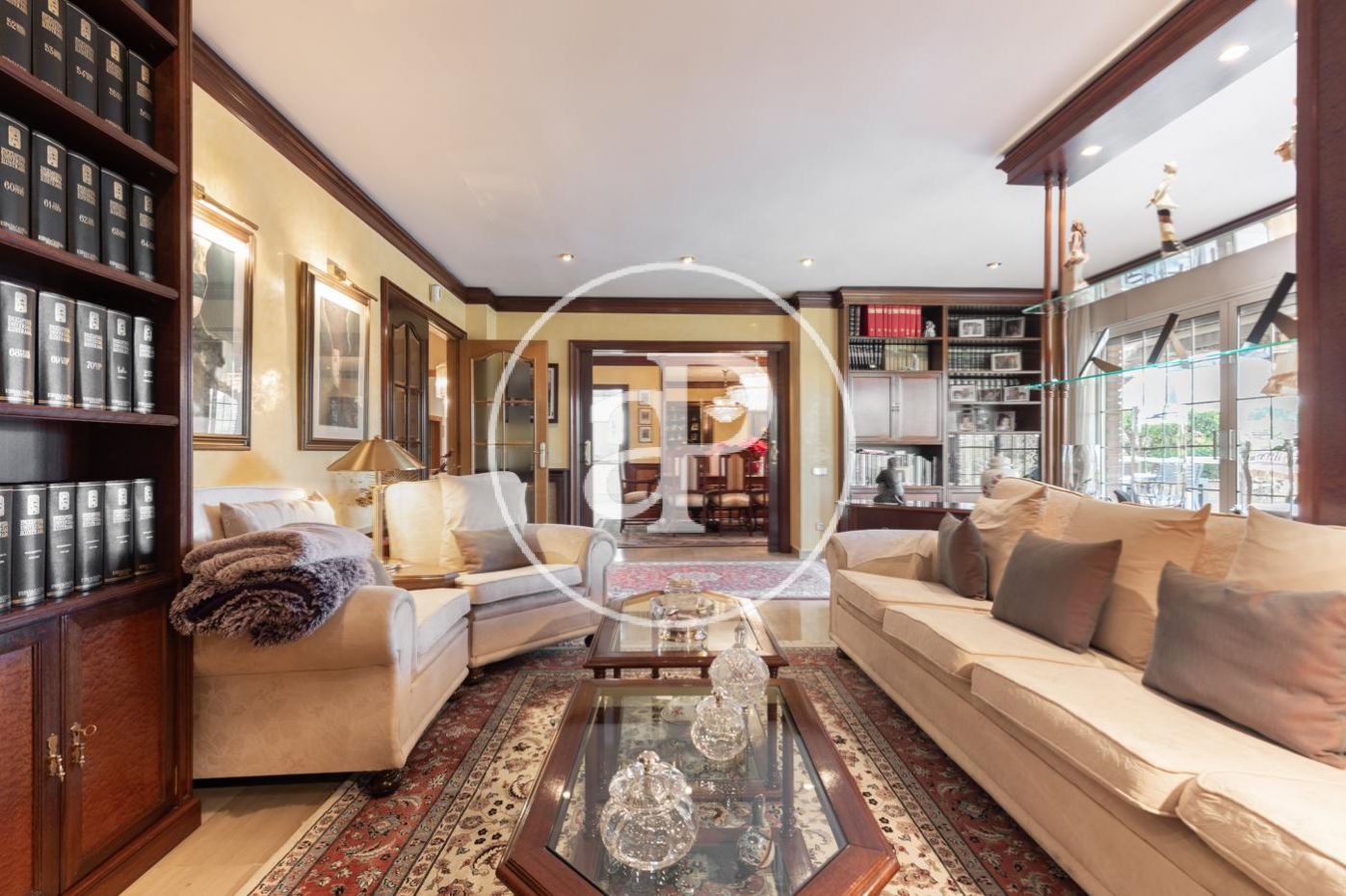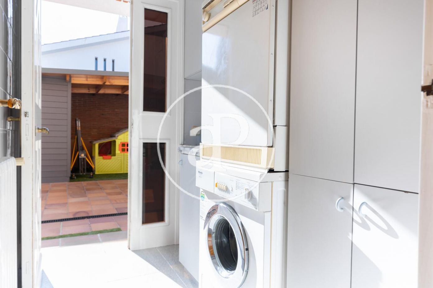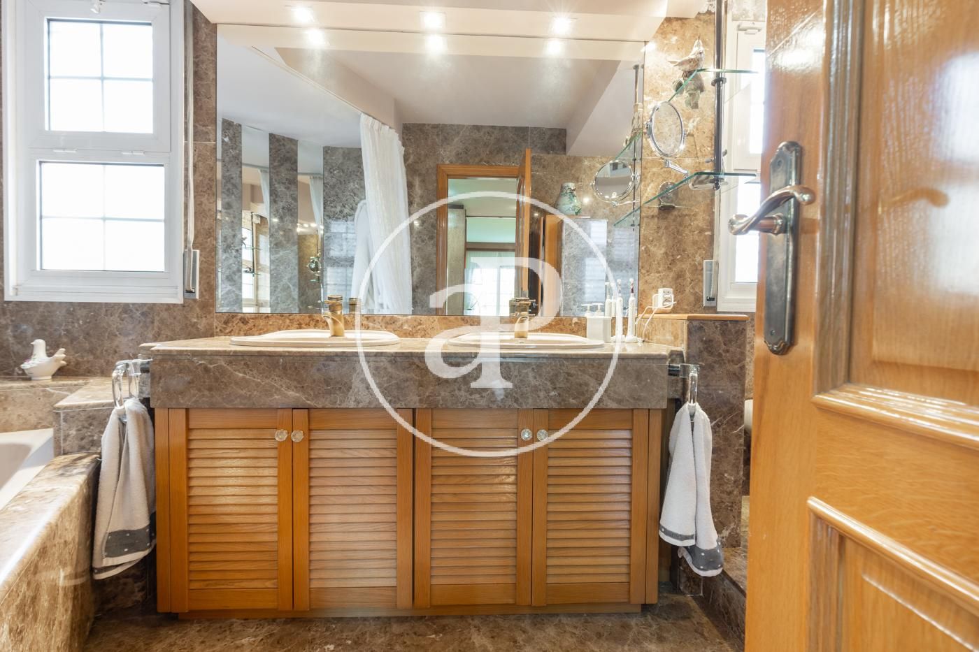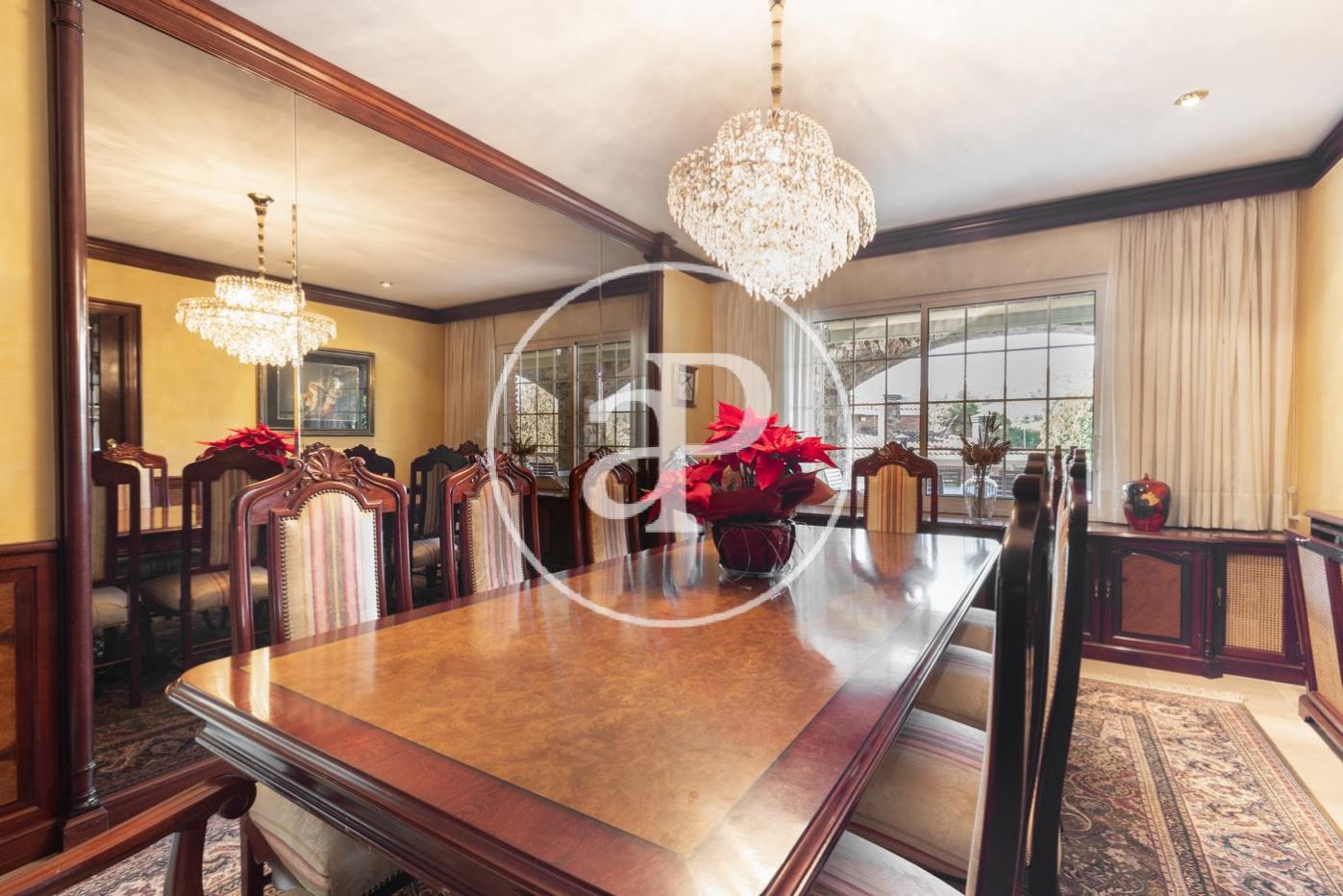 Planta baja: gran recibidor de alto techo que da paso, al frente, al gran salón comedor con chimenea, vistas y acceso directo a amplio porche, jardín y piscina. El comedor comunica con la elegante y muy luminosa cocina con su propio acceso al porche y jardín. A la derecha del recibidor, bajando 4 escaleras, encontramos la zona de noche con máster suite, su propio vestidor y baño, más 3 habitaciones y 2 baños. A la izquierda del recibidor encontramos un baño completo, otra habitación y al lado de la cocina la lavandería con puerta de salida al jardín.