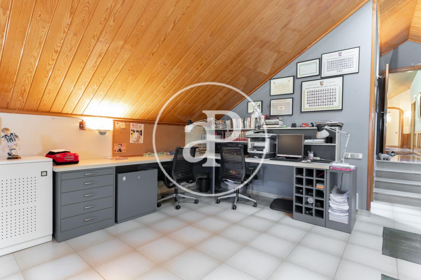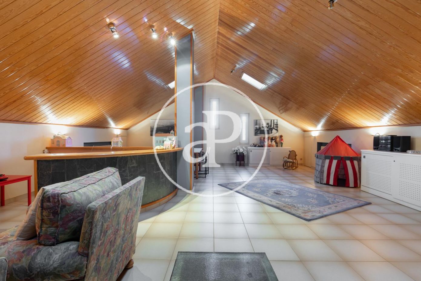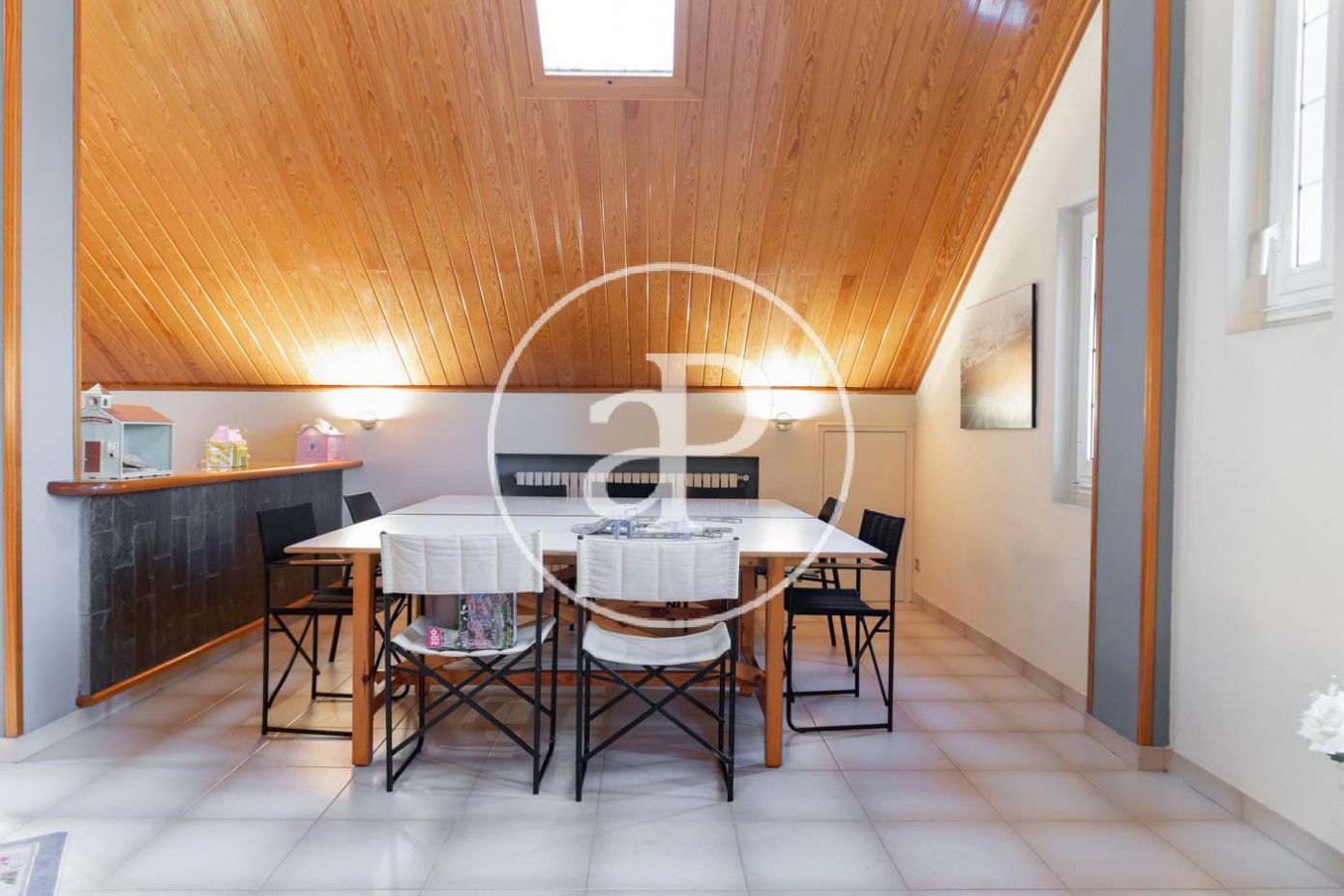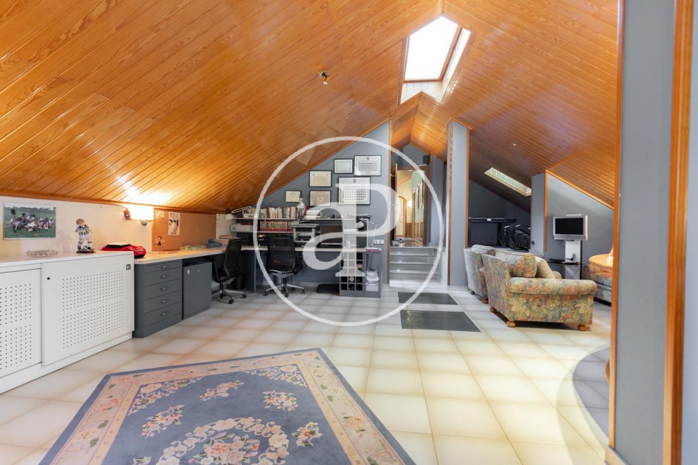 Planta superior con alto techo abuhardillado: sala polivalente de grandes dimensiones con despacho, salón con chimenea y terraza, y zona de invitados con 2 habitaciones y baño..
