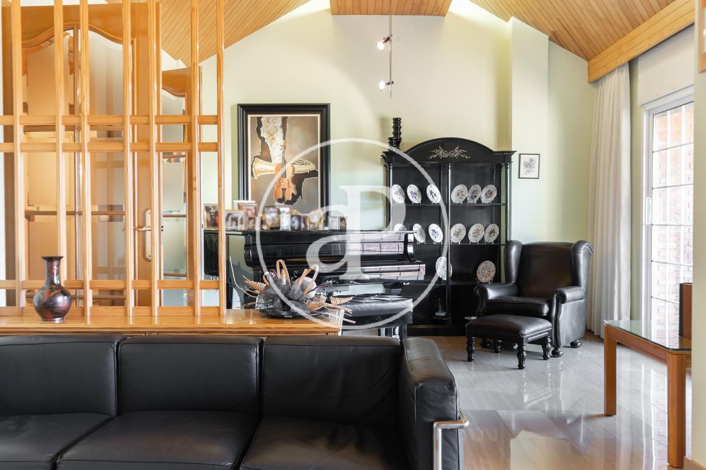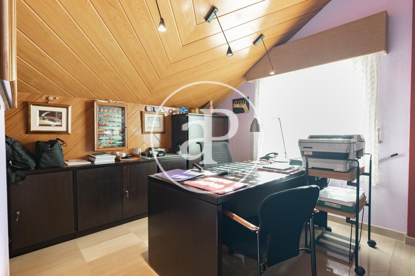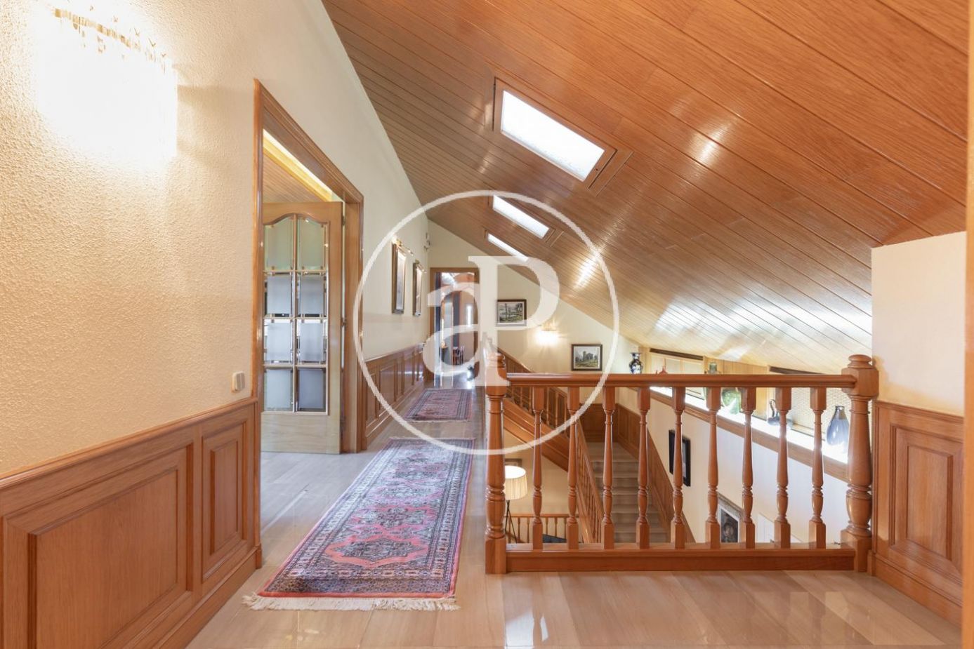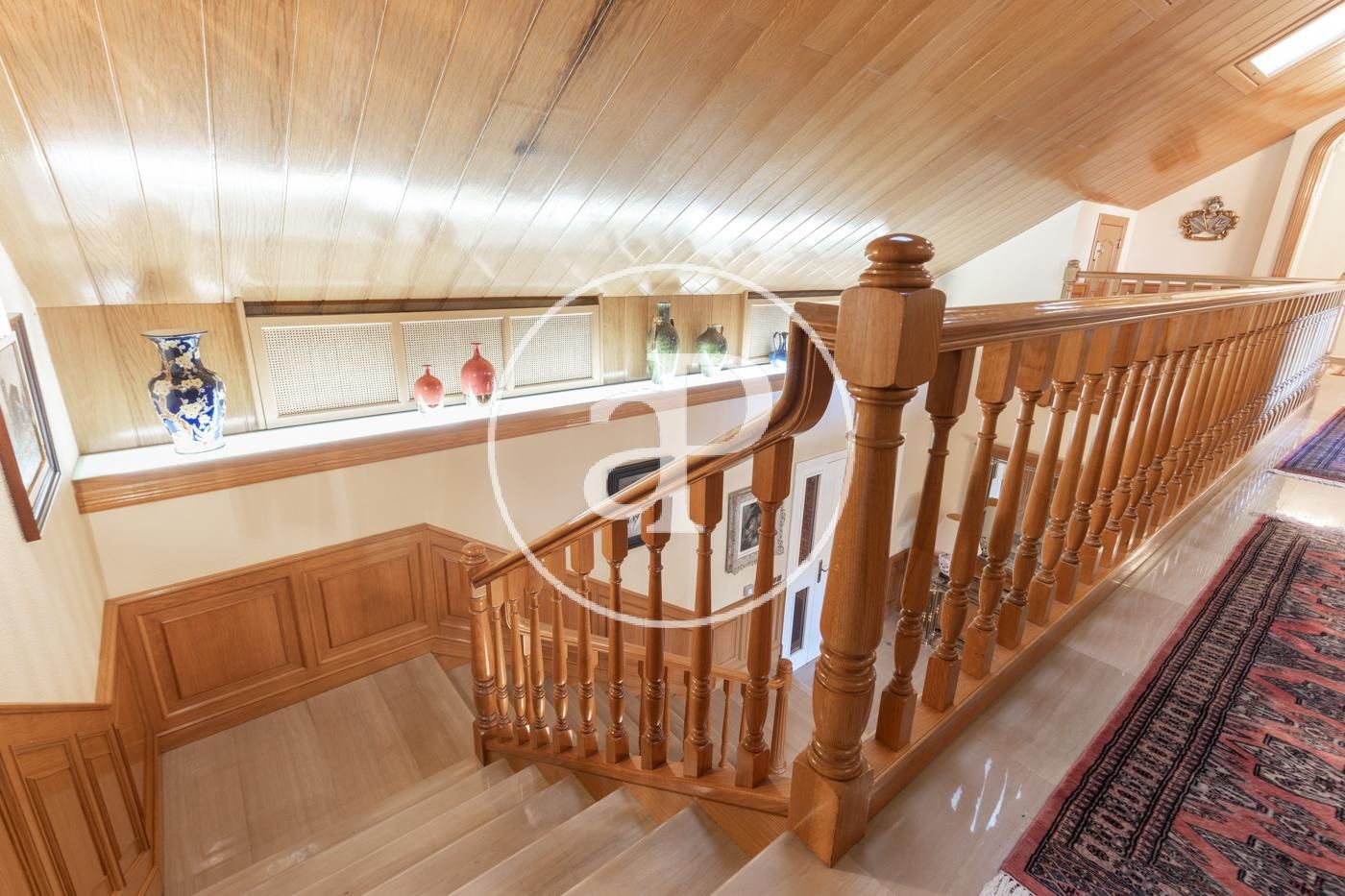 Planta superior con alto techo abuhardillado: sala polivalente de grandes dimensiones con despacho, salón con chimenea y terraza, y zona de invitados con 2 habitaciones y baño..