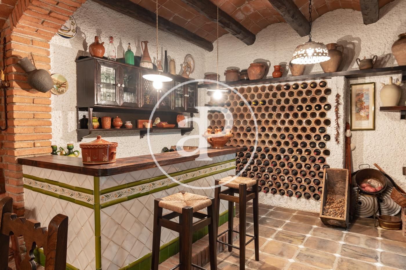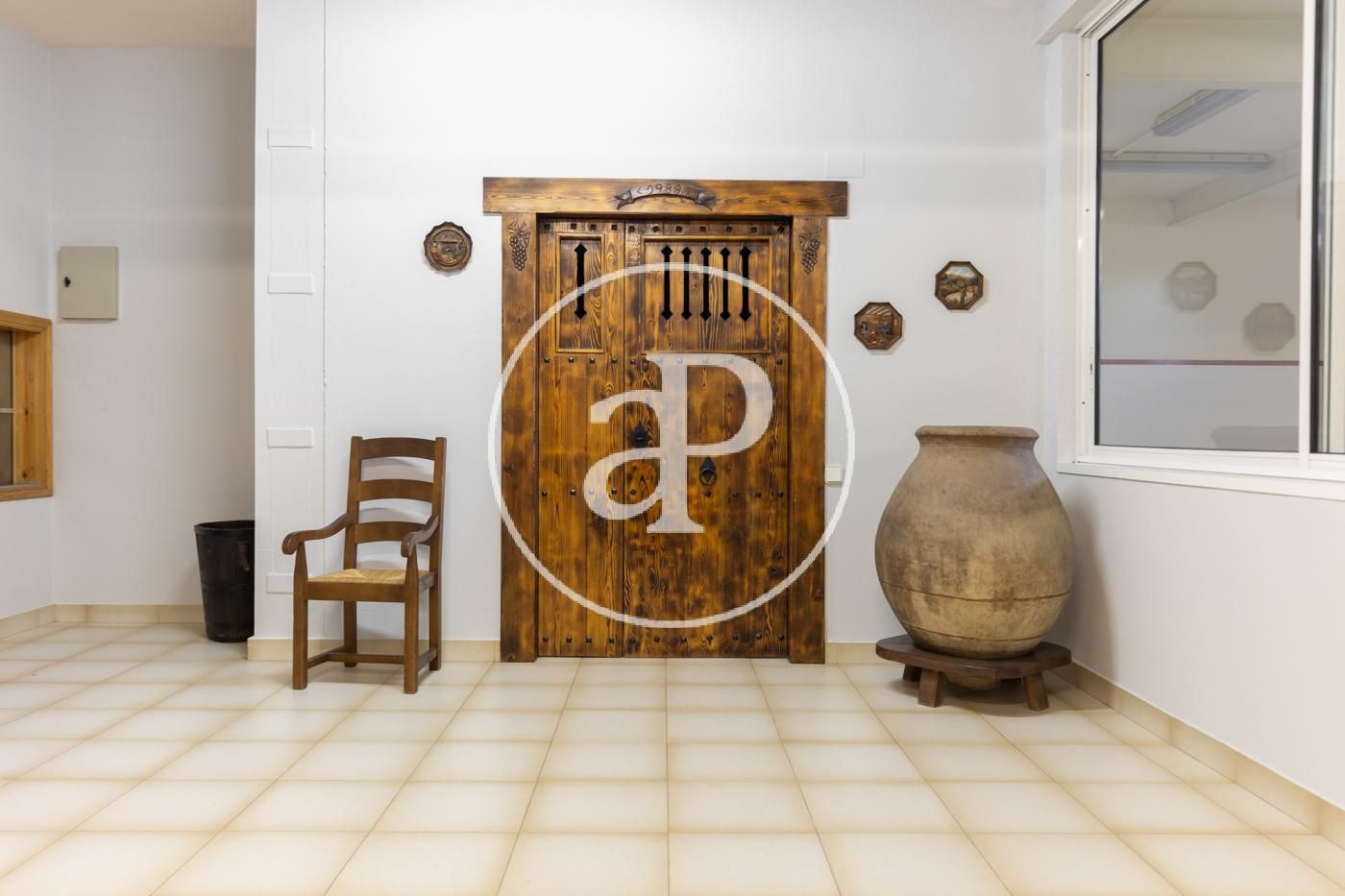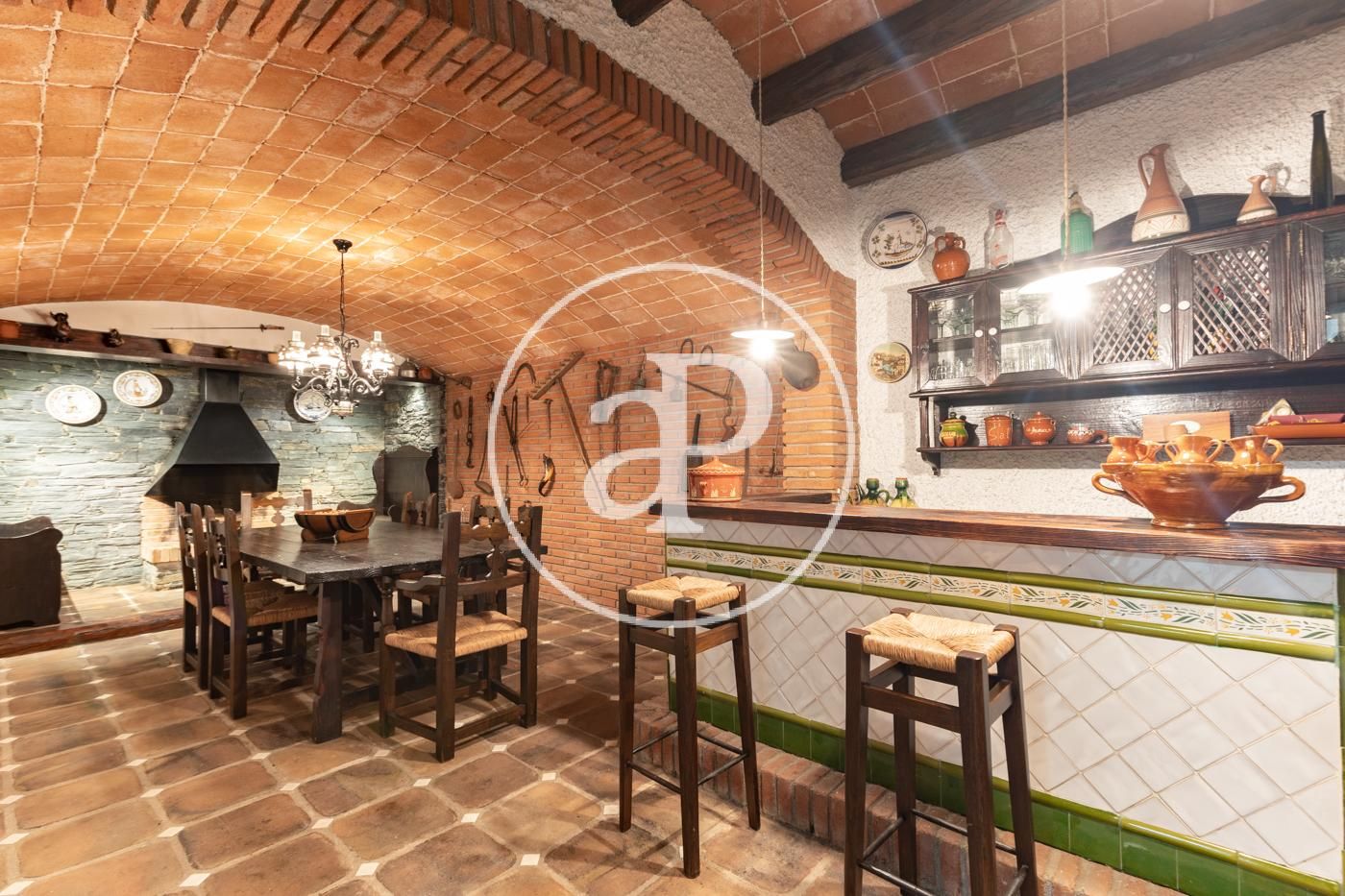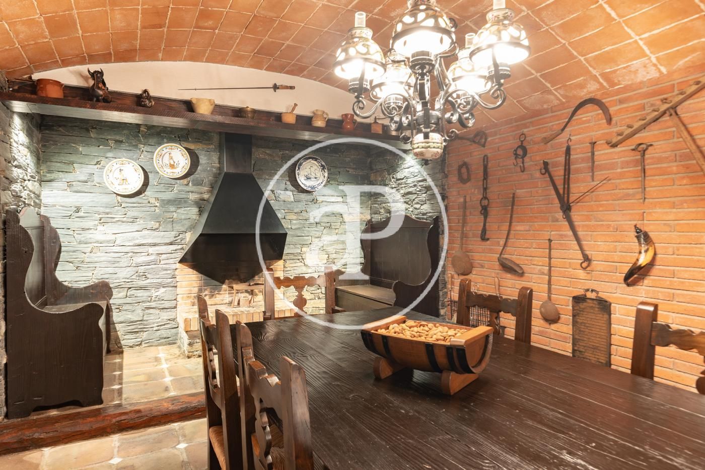 Semisótano con acceso directo al jardín y piscina: gran distribuidor con montacargas que comunica todas las plantas y desde el que se accede a la bodega en exquisito y rústico comedor con chimenea, 2 salas de almacenaje, pista de squash, baño con vestidor, despensa y garaje para 4 coches.