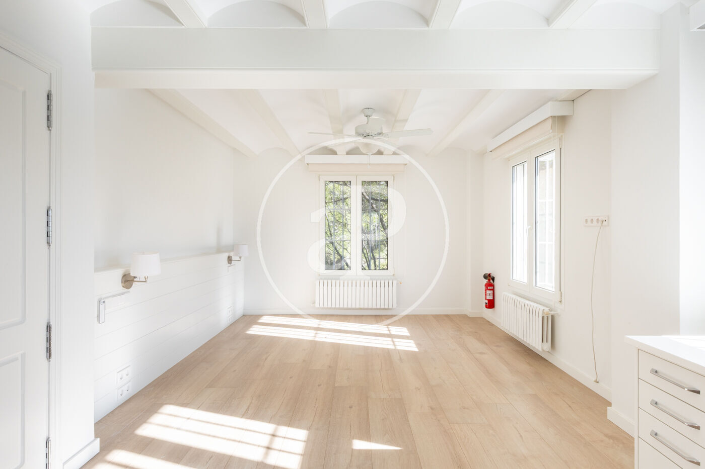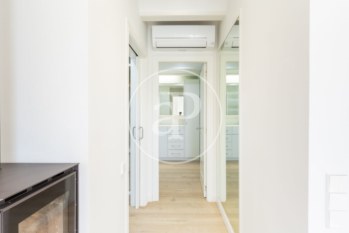 Desde el salón, una escalera abierta de madera conduce a la primera planta, completamente destinada a la suite principal: un espacio amplio, luminoso y con una atmósfera muy acogedora. Dispone de chimenea, vestidor y un elegante baño ensuite, diseñado con materiales de primera calidad.