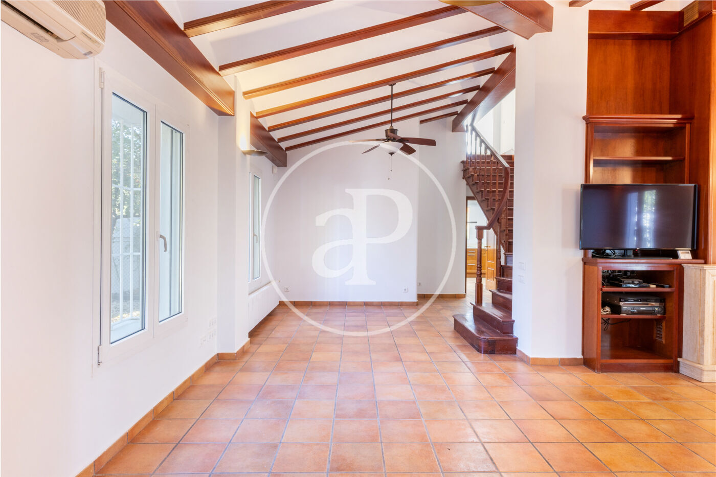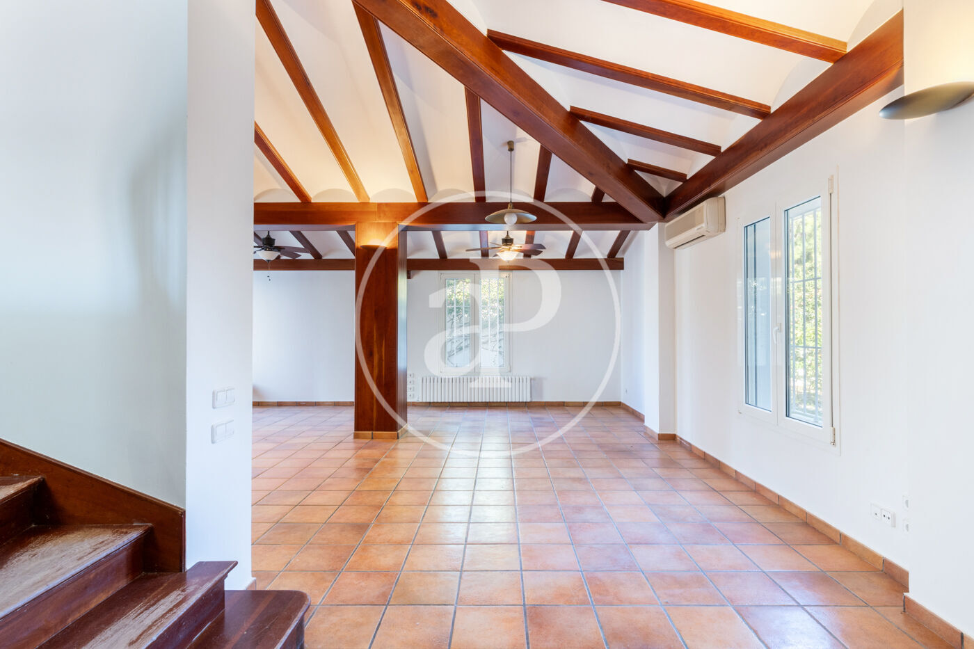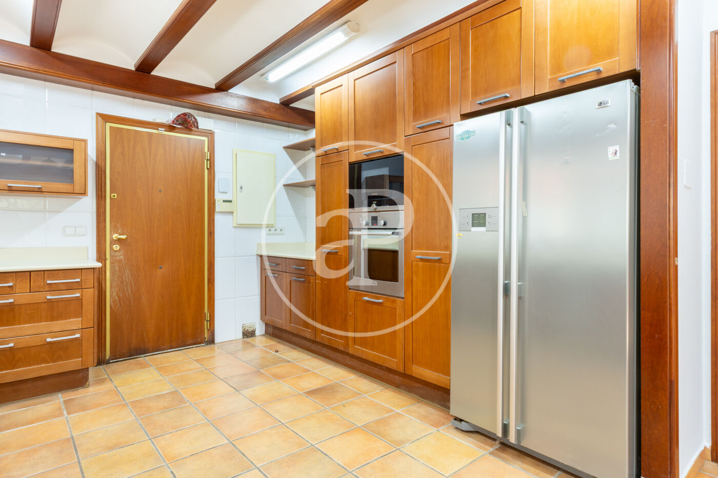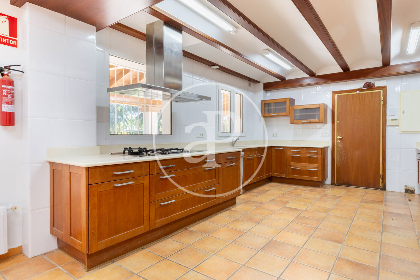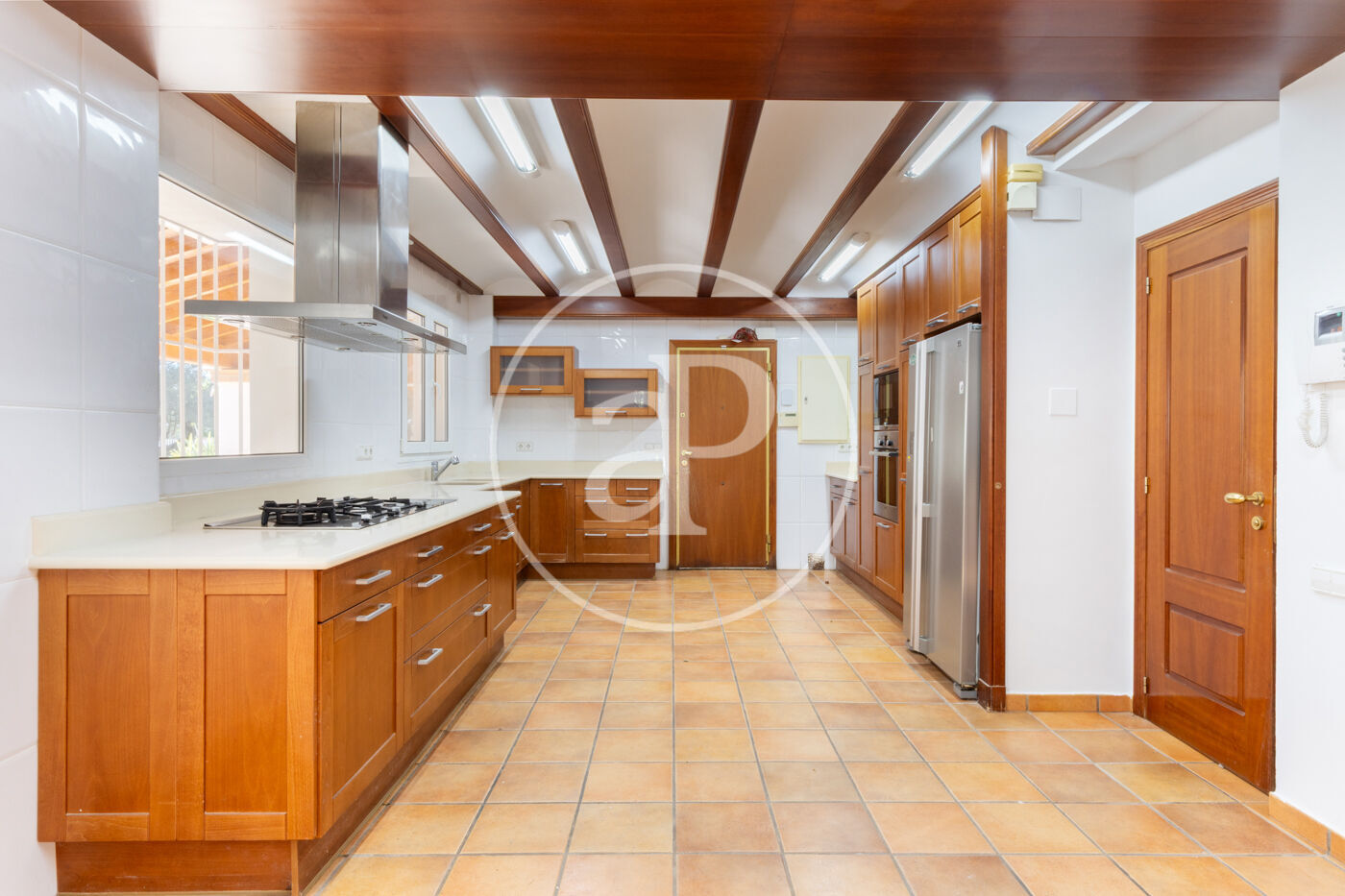 En la planta baja encontramos una cocina muy amplia con despensa, ideal para disfrutar y organizar el día a día. La luminosa y acogedora sala de estar-comedor sorprende por sus altos techos abovedados con vigas de madera, su chimenea con elegante marco de mármol, así como su refinada biblioteca y mueble para TV, creando un espacio cálido y sofisticado.
