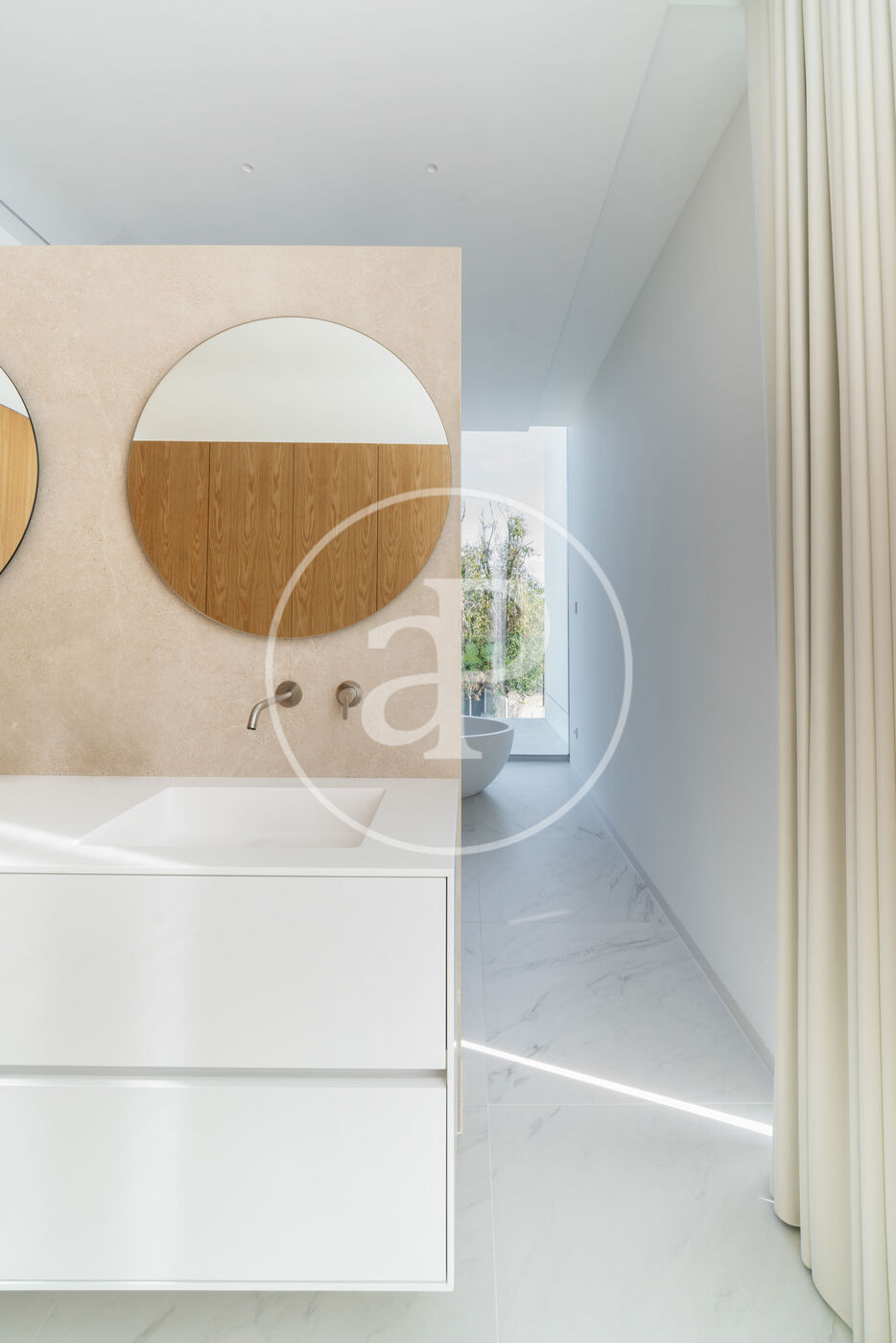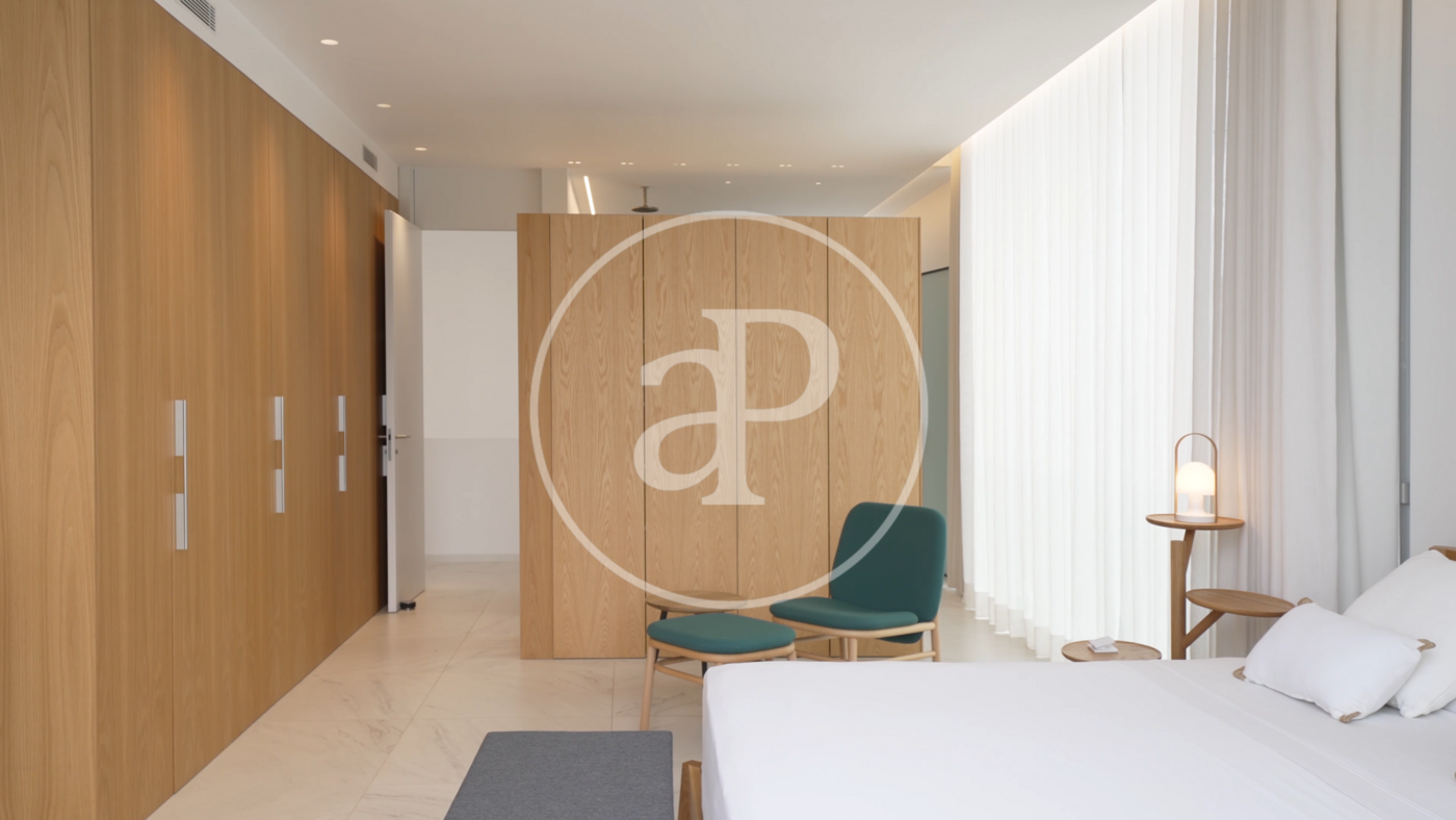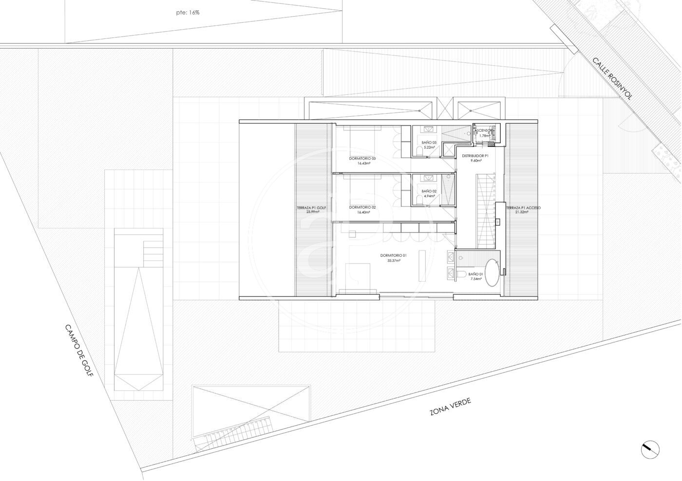 En la planta Primera, se disponen los tres dormitorios principales con baño propio, y gran capacidad de almacenamiento, incluido el vestidor en el dormitorio principal. Los tres dormitorios cuentan con excelentes vistas panorámicas hacia el Campo de Golf, siendo el dormitorio principal, el que disfruta de la triple orientación. Además, cuentan con terrazas transitables con barandillas de vidrio, que permiten disfrutar de las vistas de la totalidad del Campo hacia ambos lados de la Calle Rosinyol.