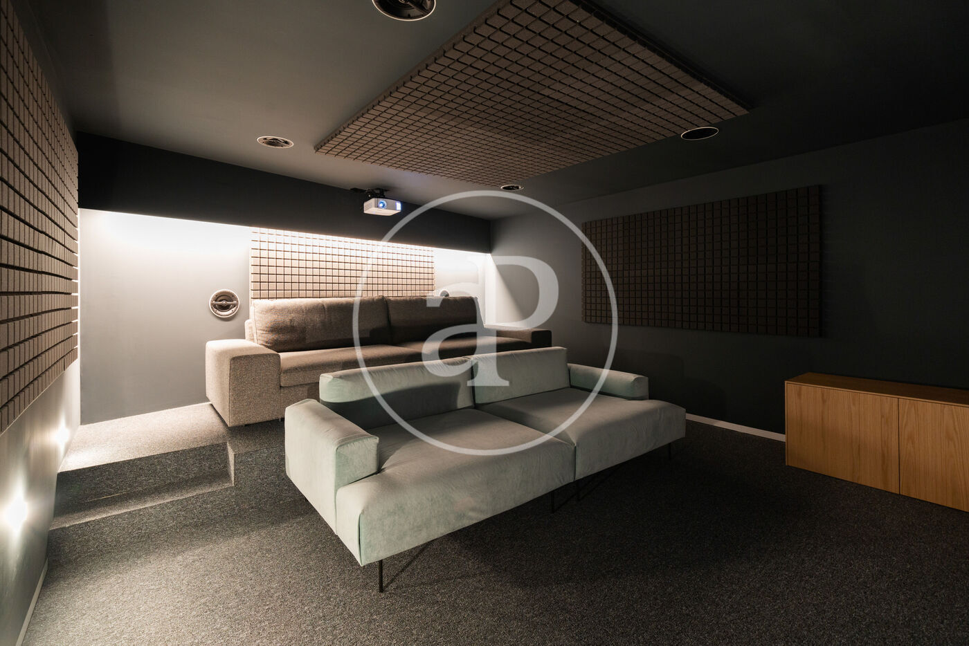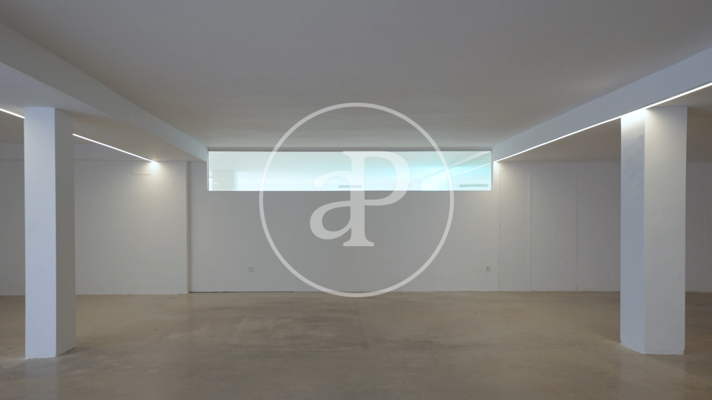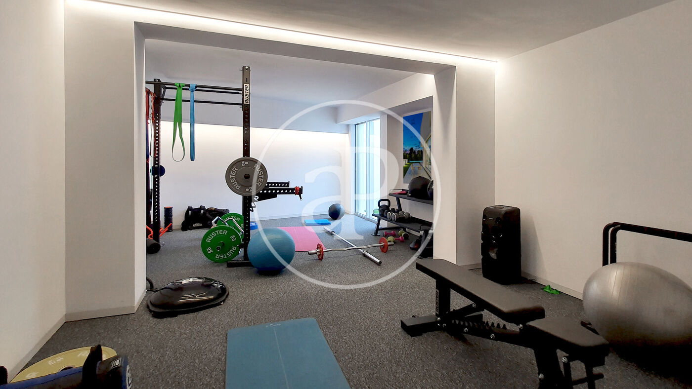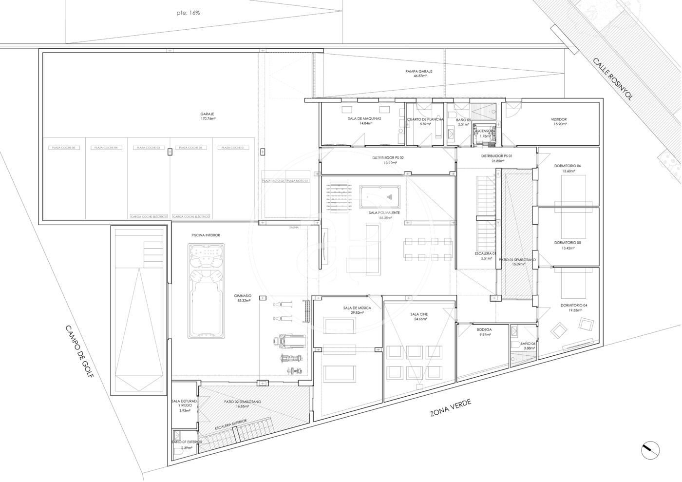 Con el objetivo de un mayor aprovechamiento del espacio libre exterior, se diseña una gran planta Semisótano con 12 estancias de uso principal (además de las propias piezas servidoras), iluminada a través de dos grandes patios exteriores y dos patios interiores, además de la rampa y de la propia piscina. Así pues, cuenta con una alta calidad de iluminación y ventilación natural, al mismo tiempo que se garantiza la privacidad del usuario en espacios cómo el gimnasio, la piscina interior, la sala polivalente, la sala de música, etc. También comprende un amplio garaje para 5+2 vehículos.
