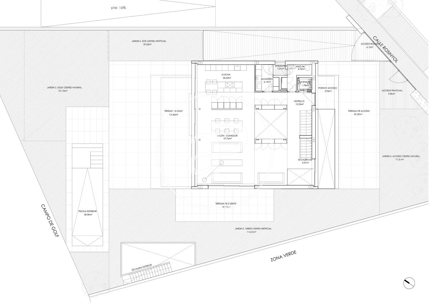 La planta Baja, prácticamente diáfana en su distribución, cuenta con triple orientación, este-sur-oeste, e integra los usos cocina, salón, comedor, y las restantes estancias servidoras en el bloque norte. Se trata de un espacio con excelentes vistas cortas y largas en 270ª hacia la Zona Verde y el Campo de Golf. A su vez está conectado directamente con los Porches de zona Sur y Nor-Oeste.