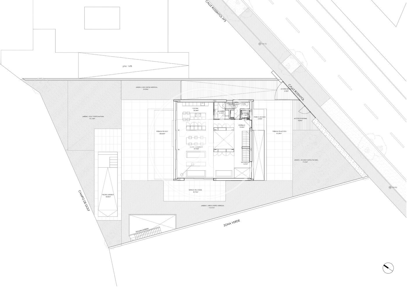 Además del Semisótano, los dos prismas sobre rasante que constituyen el volumen aéreo de la vivienda, responden al entorno con grandes huecos en sur y en este, y con apertura absoluta en las vistas hacia el Campo de Golf. Incluso la Planta Baja se eleva sobre la rasante natural para dar lugar a vistas más largas.